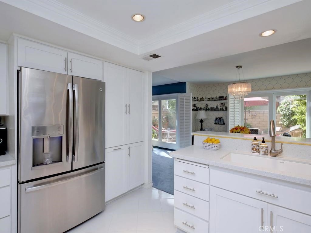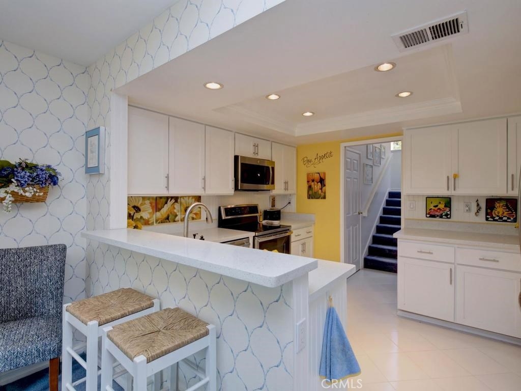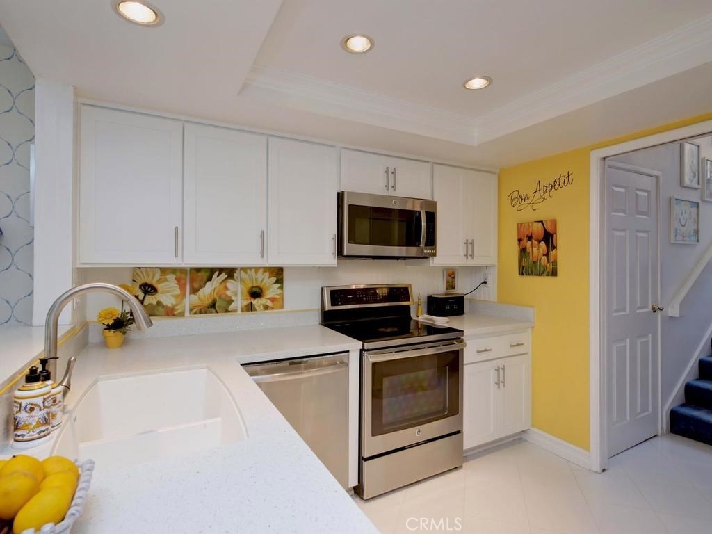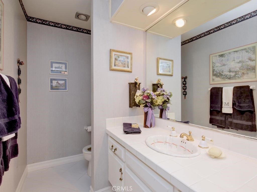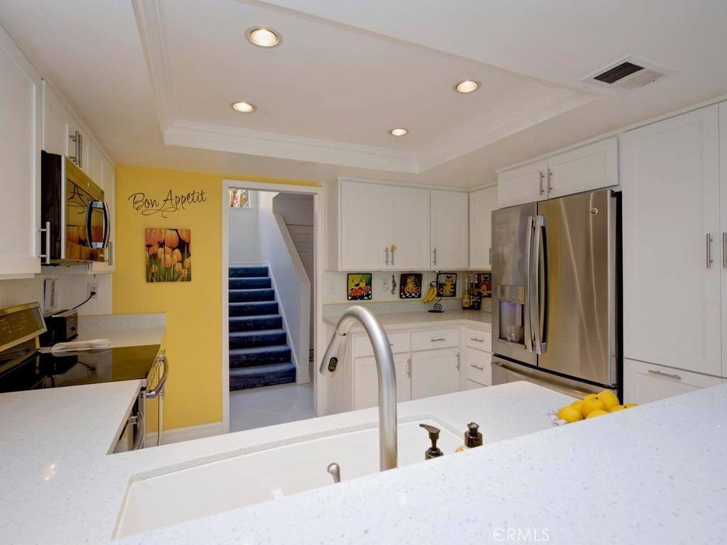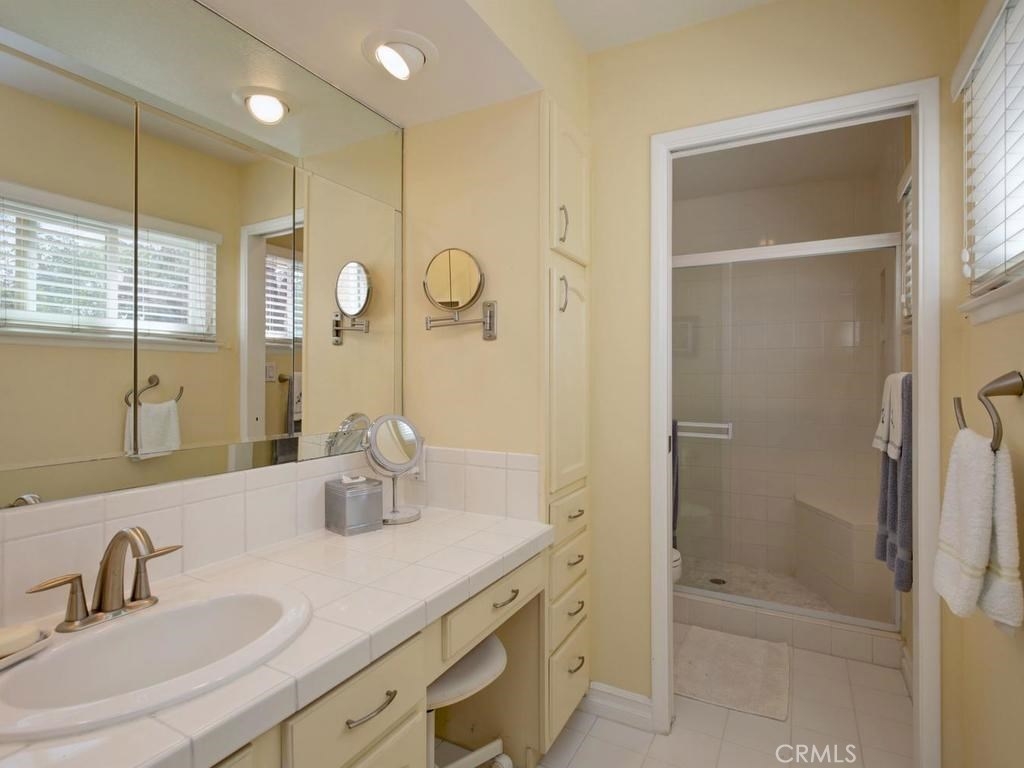 Andrea Court offers a spacious three bed/three bath home with plenty of space to spread out. The flagstone pathway leads thru the front patio to the entry. Downstairs enjoy both a large living room with vaulted ceilings and a cozy family room with fireplace. Both rooms have sliding doors adjacent to front and back patios, creating an airy indoor/outdoor appeal, whether you enjoy entertaining or just relaxing. The kitchen has been attractively remodeled with newer appliances, white cabinetry with pull-outs, deep Silestone sink, quartz countertops and tile flooring. A large pantry or storage is built-in under the stairway. The dining area is off the kitchen and opens to the back patio. Upstairs, the master suite is airy, light and bright with a pitched ceiling, walk-in closet and ensuite bathroom. The secondary bedroom is spacious and the closet is deep. The deck upstairs leads to the huge bonus room, with closets, built-ins, and window seats. It's currently used as a third bedroom/studio but has endless opportunities for your needs. The upstairs deck also creates a nice space for retreat. Additional upgrades include recessed lighting, plantation shutters, newer windows and a newer water heater. You will enjoy the association clubhouse, pool, spa and tennis courts of Aegean Heights. Visit the city of Mission Viejo’s website to browse the interactive map of its 52 parks, open spaces and trails, amazing recreation for enjoyment! Aegean Heights is the hidden gem calling you home!