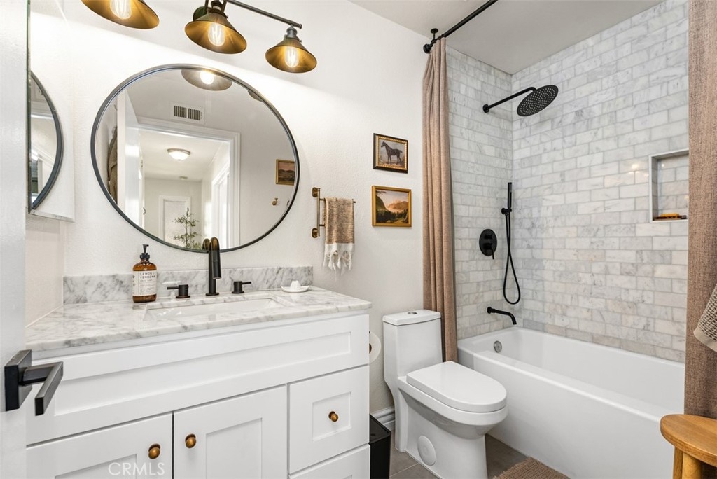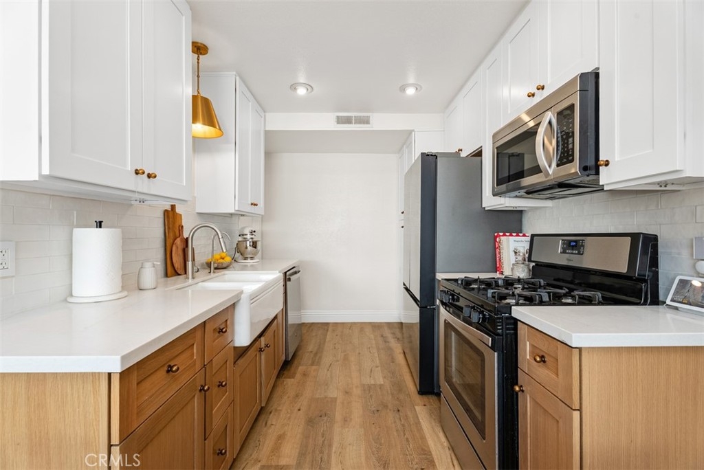 Experience Effortless Living! Impeccably Remodeled, Two-Level Townhouse in the sought-after Aliso Villas community. This residence offers 2 bedrooms, 1.5 bathrooms, and a convenient one-car garage with direct access. Inside, the home boasts a freshly painted interior with a spacious living room featuring newer vinyl plank flooring on the first level. The heart of the home is the immensely upgraded kitchen, featuring newer stainless steel appliances, newer quartz countertops, newer cabinetry, and newer hardware. It flows seamlessly into the dining area, which overlooks the private outdoor patio enclosed by vinyl fencing. Upstairs, you will find two generously sized bedrooms. The primary suite includes a walk-in closet, and the secondary bedroom offers ample closet space. The upstairs full bath and the downstairs half bath have both been recently updated, including newer toilets for both, plus a newer bathtub and marble tile in the upstairs bath. Infrastructure improvements include a newer water heater and updated plumbing. Beyond the direct-access garage, this home includes one assigned parking spot (space #985). As a resident of the Aliso Villas, enjoy access to a sparkling pool, spa, playground, and park. Also enjoy Mission Viejo Lake privileges! The location is ideal, offering close proximity to fantastic restaurants, the Mission Ranch Market, popular shopping destinations, and award-winning schools. This turn-key home is ready for you! Schedule your showing today.