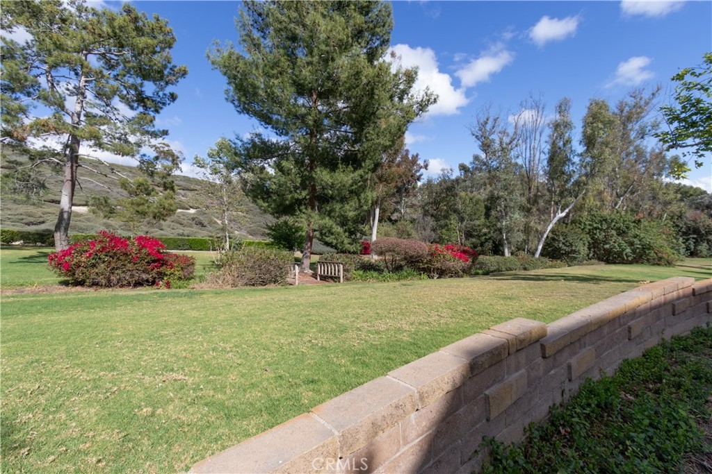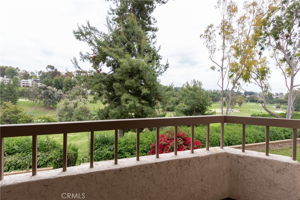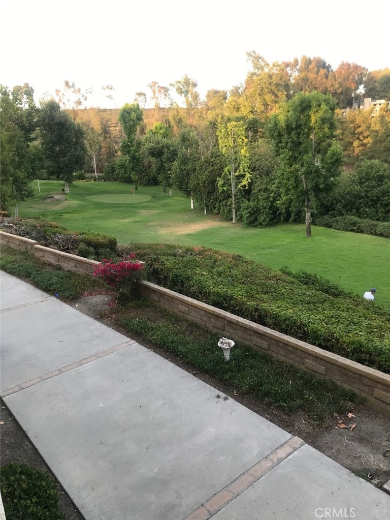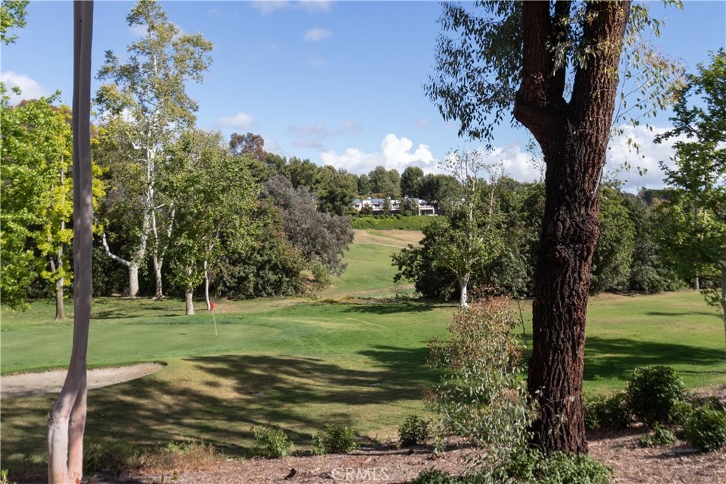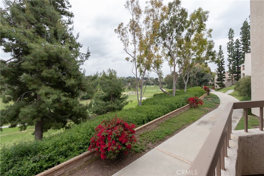 GATED 'FINISTERRA ON THE GREEN" located across from Lake Mission Viejo. Enjoy a beautiful Oso Creek golf course view as soon as you walk into unit. NO STEPS, except for 2 to living room. Desirable 2 bedroom 2 bath unit with inside laundry, entrance to patio from both master bedroom and living room. Patio has a door to staircase leading down to pleasant neighborhood walk overlooking golf course. Laundry area inside kitchen eating area, hall linen closet, wood burning fireplace, generous size dining room, 2 steps down to living room with that gorgeous view of golf course. What's unique about this unit, is the separation of the bedrooms. Perfect for privacy. Finisterra on the Green is centrally located to variety of grocery stores, restaurants too many to name, library, city hall, close to Laguna Beach 5 Freeway and toll roads.