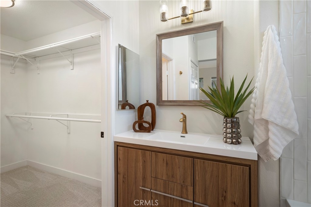 Welcome to 231 California Court, a refined sanctuary tailored for those seeking a touch of elegance in Mission Viejo! As you step into this contemporary oasis, you're embraced by an open concept living space seamlessly merging the living room, dining area, and kitchen. The interior radiates sophistication with a serene color palette, harmonizing neutral tones with subtle accents of black and gold. Indulge in the plush and comfortable seating in the living room, gathered around a sleek, modern fireplace—a cozy focal point for gatherings. Sunlight streams through large windows, creating a warm ambiance. Stylish luxury vinyl plank flooring adds a timeless touch to the space. The kitchen's countertop doubles as a breakfast bar, perfect for casual dining or entertaining guests. Both generously sized bedrooms feature plush carpeting for ultimate comfort, and each boasts an ensuite bathroom, creating a private retreat. Ample closet space ensures storage is never a concern. The spa-like bathrooms showcase contemporary fixtures, luxurious tile work, and ample lighting, featuring tub-shower combinations designed for both relaxation and functionality. Step onto the private patio and enjoy Southern California's mild weather. Perfect for sipping morning coffee or unwinding in the evening, the balcony offers picturesque views of the surrounding hills. Situated in North Mission Viejo, this remodeled condo caters to those appreciating a refined lifestyle, providing easy access to the nearby Irvine Great Park, Foothill Ranch, and the renowned Saddleback Church. Residents enjoy proximity to parks, shopping centers, recreational areas, and the toll road. In summary, this Mission Viejo gem seamlessly blends modern design with comfort, offering a welcoming retreat for those who appreciate a touch of sophistication and the convenience of Irvine's notable landmarks and amenities.