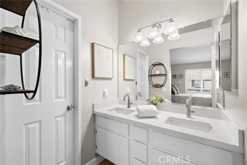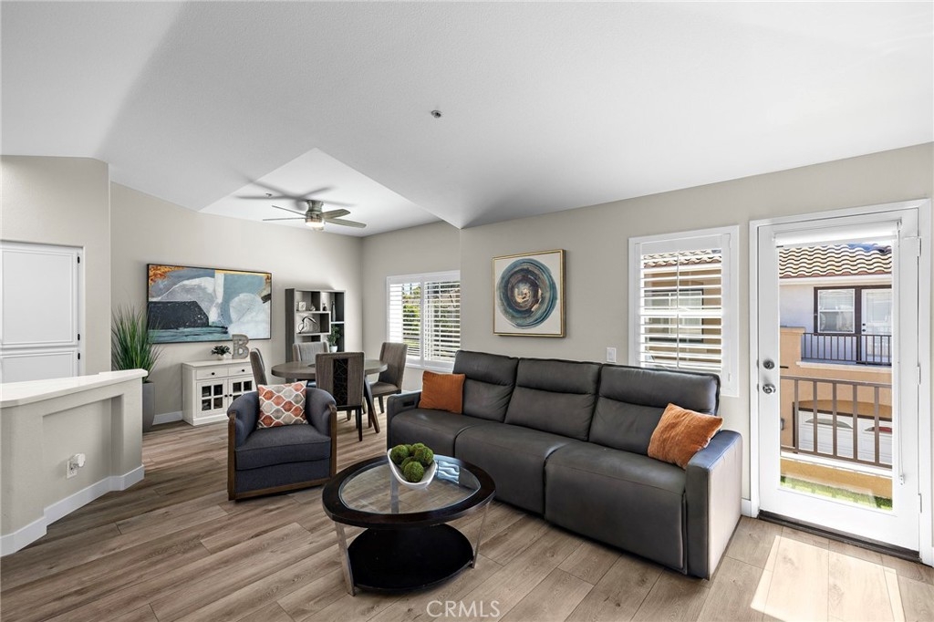 Located in the desirable California Terrace community, this remodeled corner carriage-unit condo offers privacy, abundant natural light, and a highly functional floor plan with direct access from the attached two-car garage featuring an epoxy floor. All main living spaces are conveniently located upstairs, where the bright open-concept layout allows the kitchen, dining, and living areas to flow seamlessly together. The living room opens to a private deck with room for a BBQ, providing a great spot to relax or dine outdoors. The interior has been tastefully updated with luxury vinyl plank flooring throughout. The remodeled kitchen features shaker-style cabinetry, quartz countertops, a designer backsplash, and stainless steel appliances. Both bathrooms have also been beautifully renovated with modern finishes. Residents of California Terrace enjoy access to a private saltwater pool and spa, along with all the amenities of the Lake Mission Viejo Association. Low HOA dues, no Mello Roos, ample guest parking, close proximity to the 241 Toll Road, and easy access to the shopping and dining of Mission Viejo and Rancho Santa Margarita make this well-maintained community one that has very low turnover.