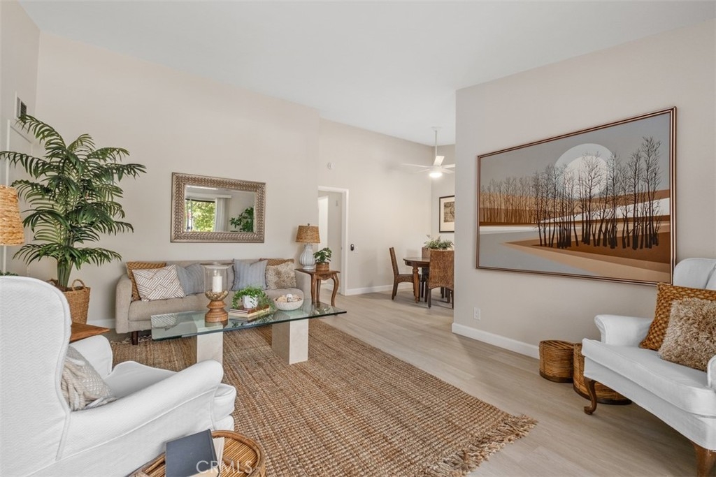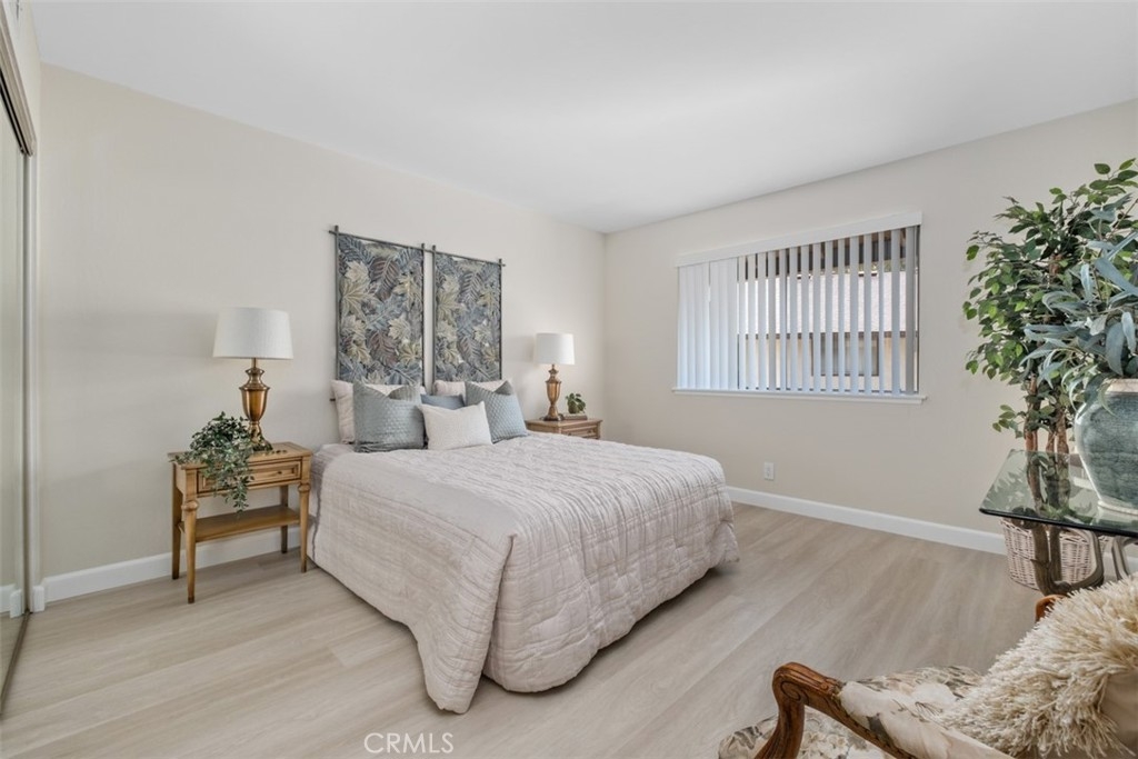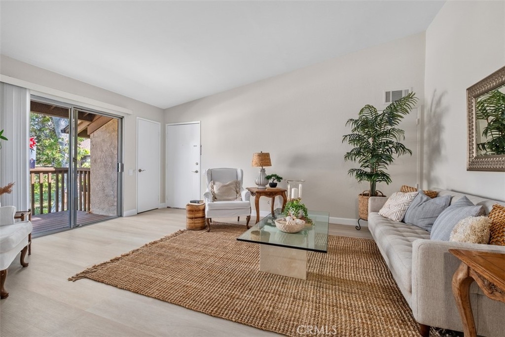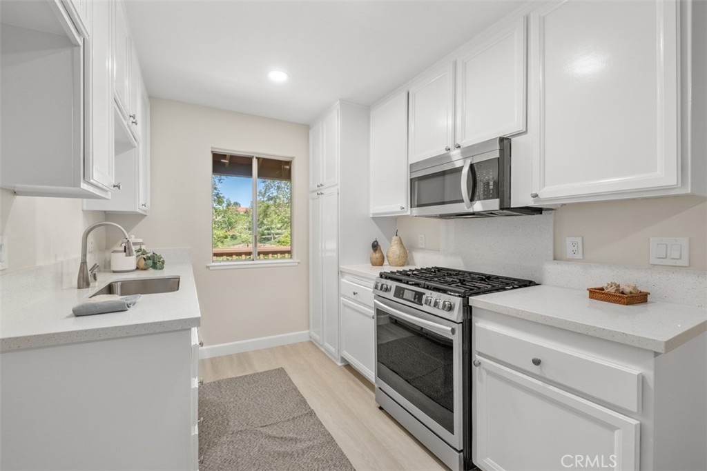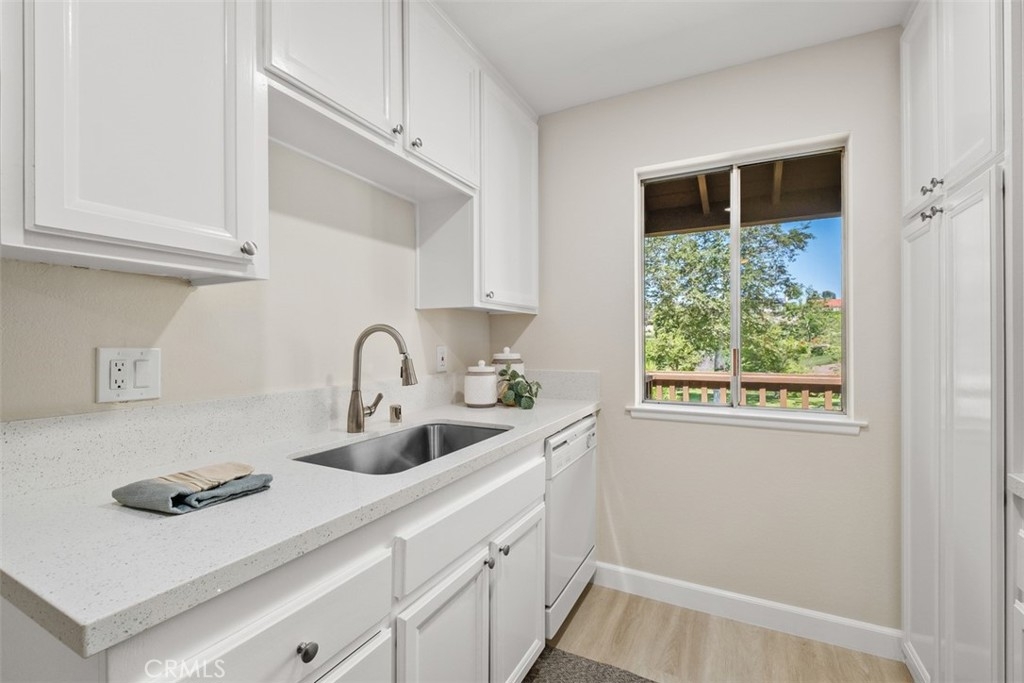 A fabulous VIEW location. The gorgeous 2 bedroom, 2 bath condo is highly upgraded with NEW vinyl wood floors throughout, new quartz counters in the kitchen and both bathrooms, freshly painted, and new wide base-boards through out. Enter into a large great room with vaulted ceilings with a balcony to relax and enjoy the stunning view. The updated white kitchen is adjacent to the dining area that opens into the great room making it ideal for entertaining. The primary bedroom is nice size with an ensuite bathroom. The 2 bedroom could also be used as an office or guest bedroom. The full hall bathroom is ideal for guest. The HOA includes, water, trash, laundry area next to the carport. You also have access to Lake Mission Viejo with beautiful sandy beaches, picnic area, boating and wonderful summer concerts.