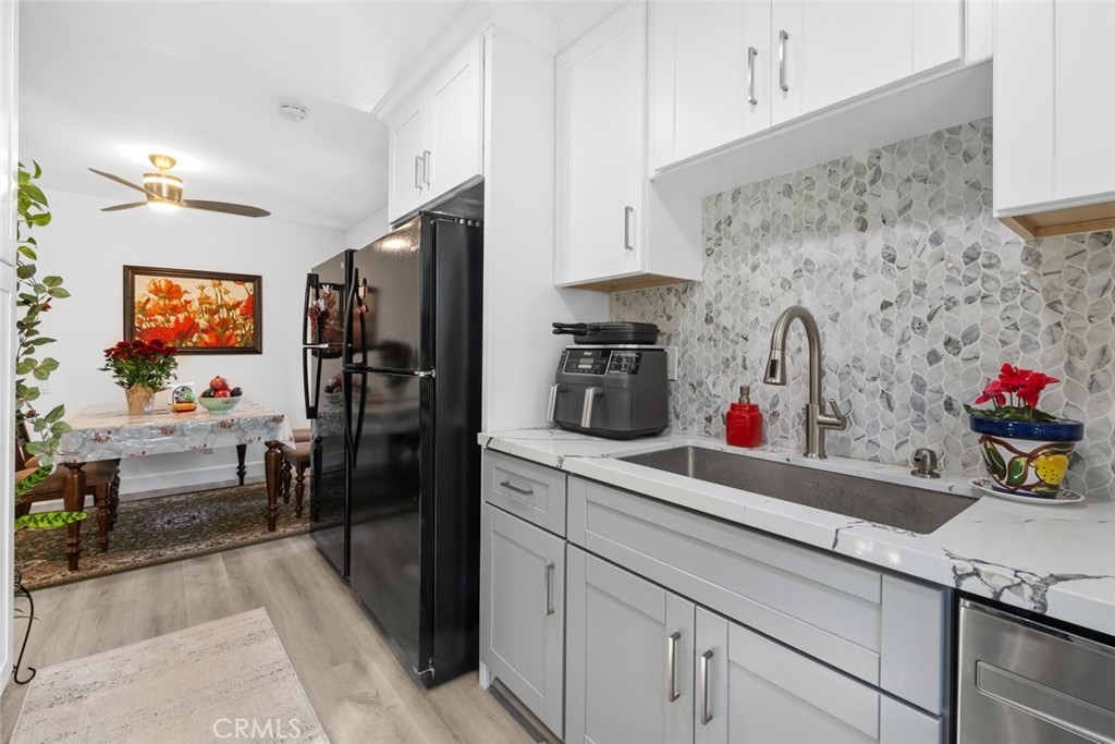 This home has it all! Centrally located, beautifully remodeled, and nestled in a park-like setting, this gorgeous 2 bed/2bath lower level, end unit is a dream! A serene balcony which overlooks the pool and lush green views are just the beginning of the many upgrades to this home. Remodeled from top to bottom, no detail has been overlooked. A beautiful new kitchen with custom white and grey cabinets, quartz countertops, and a custom waterjet marble backsplash create a serene environment in the heart of this home. All windows (including slider) were replaced in 2019 with state of the art dual-pane, energy efficient windows. Luxury wide-plank flooring throughout the open floor plan home creates a neutral palate to add your own pop of color customization. All bedrooms and bathrooms have been impeccably upgraded. Designer upgrades in this smart, single-level floorplan include custom paint throughout, new baseboards, in-unit laundry, new lighting, new hardware, abundant storage, custom closets and new ceiling fan. Additionally included is a covered carport space with additional storage and designated parking space. Units in the complex have been recently re-piped and painted. Flowing with natural light, this elegant home is a peaceful retreat that feels a world away – yet is close to everything!