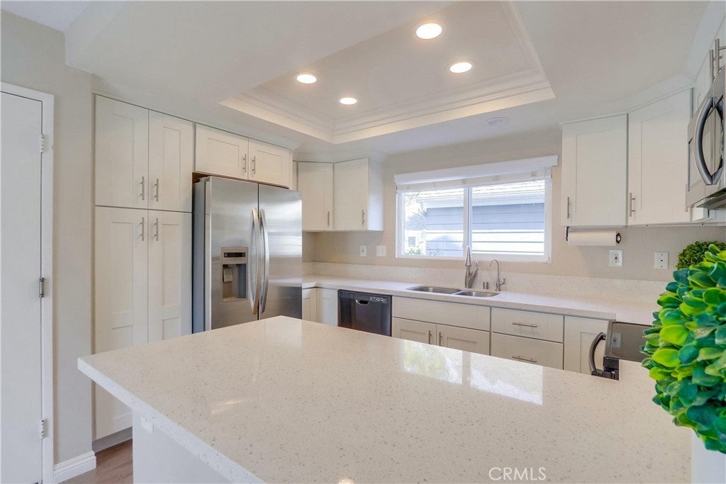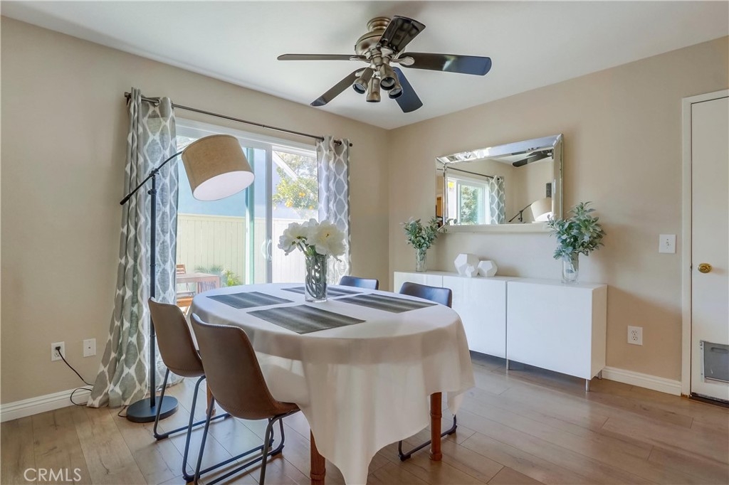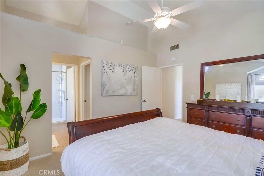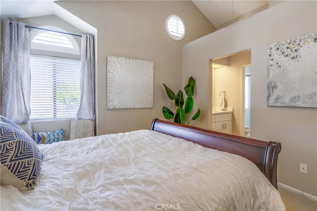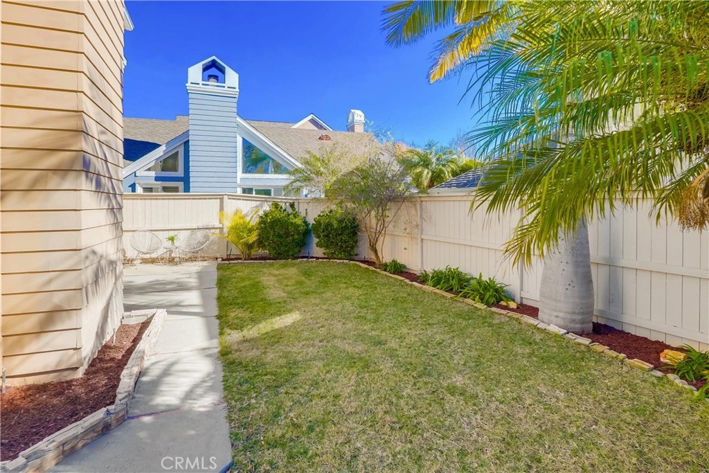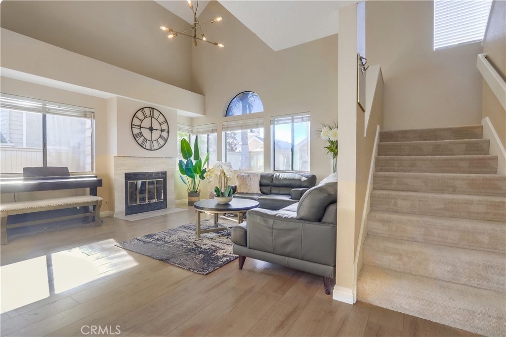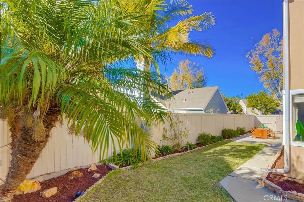 Prepare to fall in love with this gorgeous home ideally located in the desirable Eastbrook community, pristine and well maintained, the perfect example of pride in ownership with numerous improvements and upgrades throughout. Soaring vaulted ceilings, a light filled interior, gorgeous wood laminate floors, and a neutral palette all set the stage for an ideal living environment. The spacious living room boasts a cozy fireplace, custom lighting, and is open to the light filled dining area with direct access to the back patio creating the perfect indoor-outdoor living space for entertaining with family and friends. The exquisite kitchen has been beautifully remodeled with sleek countertops, white shaker cabinetry with soft close features, upgraded pulls and faucets, an abundance of countertop and storage space, recessed lighting, and a prized breakfast bar, all open to the family room creating a wonderful flow to this well-designed floor plan. The master suite is a peaceful retreat with high vaulted ceilings, a spacious walk-in closet with custom organizers, and a sparkling master bath that has been updated with white shaker cabinetry, updated faucet and pulls, a gorgeous vanity counter top, and an oversized step in shower with custom tiled surround, and a frameless glass enclosure. Additional fine features include custom ceiling fan and plantation shutters in guest bedroom, gorgeous upgraded powder room, new roof and rain gutters 2020, new HVAC 2020, newer microwave, and an upgraded vinyl kitchen window. The outdoor space is a private oasis with a large wrap around yard, grassy lawn, tropical landscaping, and 2 patio areas perfect for relaxing and BBQing with family and friends. Just a short stroll to Eastbrook Park and located close to shopping, dining, award winning schools, close to Toll Road, plus Lake Mission Viejo membership, low HOA dues and NO Mello Roos!