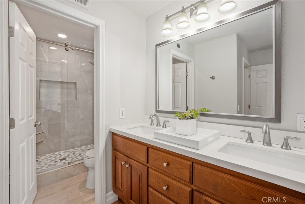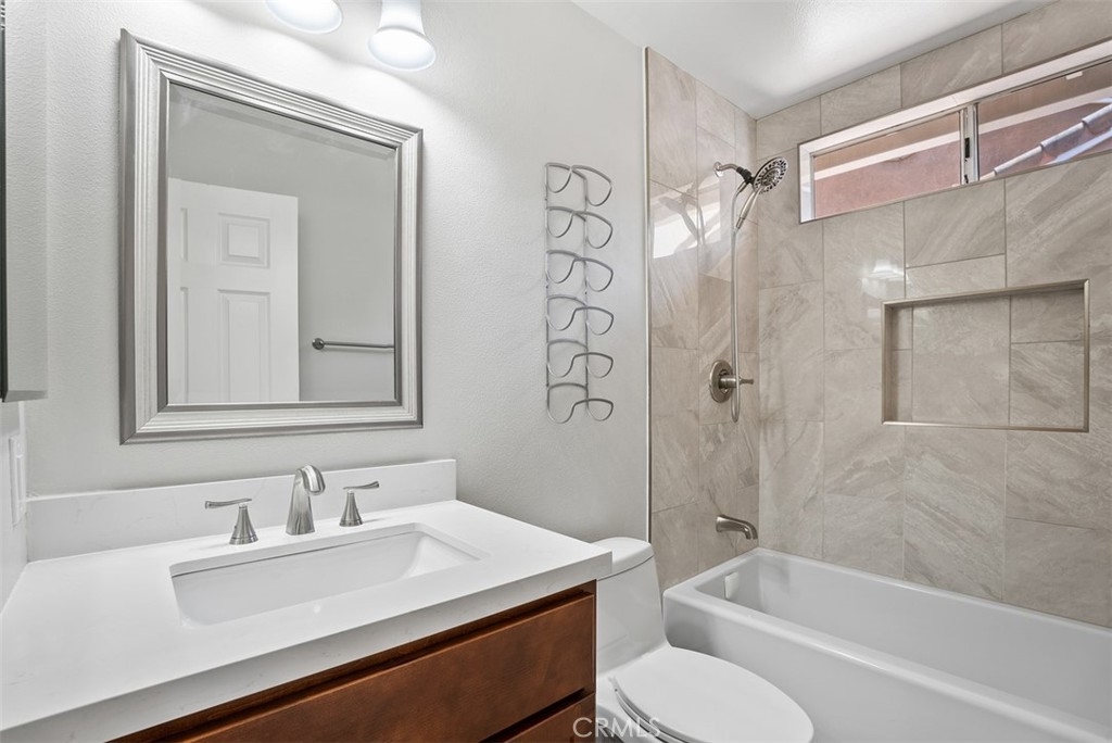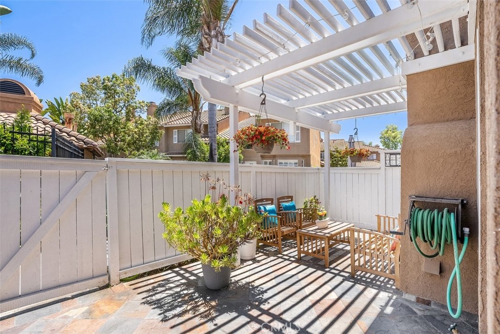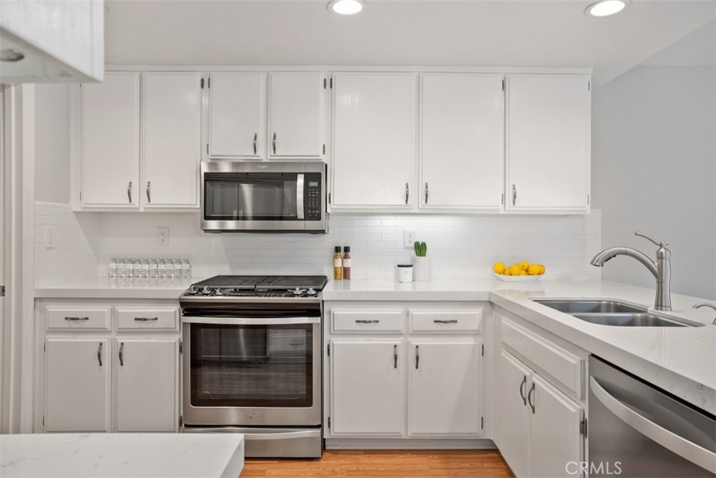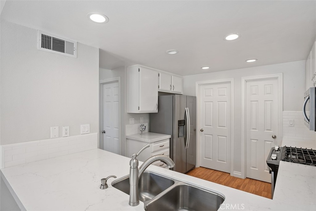 Remodeled three bedroom townhome with soaring ceilings in living room with stacked stone fireplace. Recessed led lighting, upgraded baseboards. Remodeled kitchen with stone counters, stainless steel appliances including refrigerator . Walk in pantry. Abundant storage. Individual laundry room, washer/dryer included. Picturesque rear patio with lush landscape surround. Covered loggia. Upstairs gracious master suite with vaulted ceiling. Dual closets, one of which is walk-in. Spa inspired master shower and master bath with dual sinks. Two secondary bedrooms, one with built-ins. Home attic fan to cool upstairs quickly. Easy parking with two car attached garage . Excellent location within community , steps to pool. This home was meticulously remodeled and is ready to move right in.