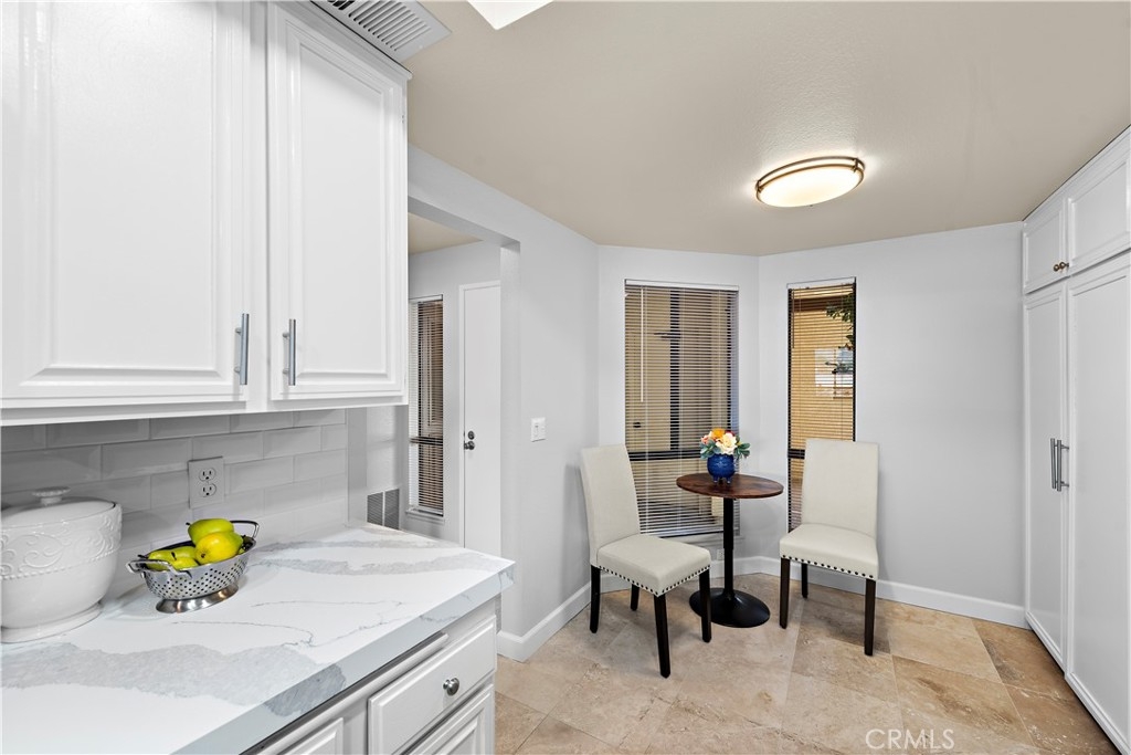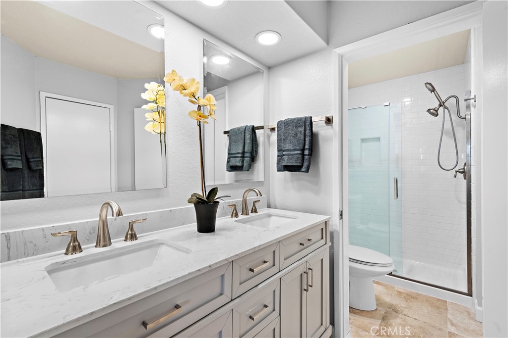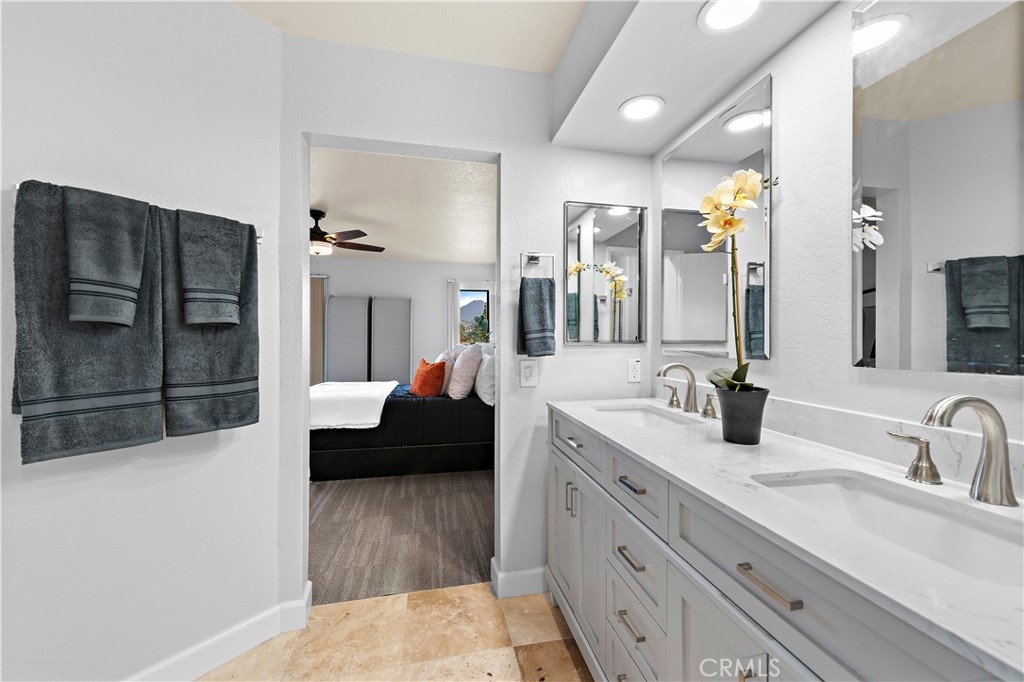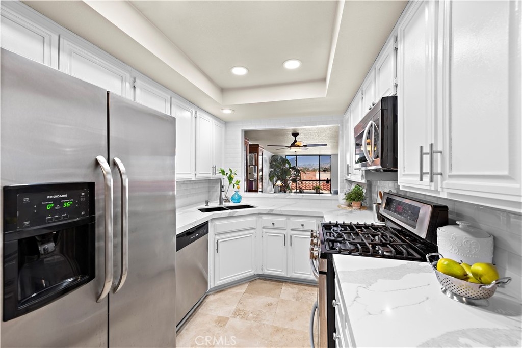 We are proud to present this turn-key remodeled, easy-access ground-floor condo in the popular Finisterra on the Lake Community in Mission Viejo. Some amenities include a private community beach, a sparkling pool, a private fishing area, and access to Mission Viejo Lake amenities. The Finisterra Lake community boasts views of the Saddleback Mountains, a truly rare find in this area. Get ready to be inspired, as these breathtaking views complement the upscale interior finishes. This two-bedroom, two-bathroom unit has recently undergone updated renovations, with new modern kitchen and bathroom designs. This home is brimming with recent upgrades that include a custom kitchen with recessed lighting, beautiful freshly painted walls, new white Quartz countertops with gray veining, 3D Subway tile backsplash, sleek modern stainless-steel handles, and state-of-the-art stainless-steel appliances. The bathrooms shine with bright new finishes, glass enclosures, shower tiling, and flooring. Easy-to-care-for Shaw carpet has been installed that is easy to upkeep and has accessibility features. Luxurious travertine flooring seamlessly flows through the entry, kitchen, and dining room. The spacious Master bedroom has been repainted and is also carpeted. The master bathroom has a new dual-sink vanity with updated sinks, fixtures, and countertops. The master has a generous walk-in closet. The guest room has been repainted and carpeted and the guest bathroom also has beautiful travertine flooring and updated counters, sinks, fixtures, and shower. The garage is located near the front door of your new home. The magnificence extends beyond the interior, with equally stunning views from the primary bedroom, kitchen, living room, and entryway. The private balcony is conveniently connected to the living room and primary bedroom for easy access. Come view this beautiful, renovated masterpiece, it will sell fast!