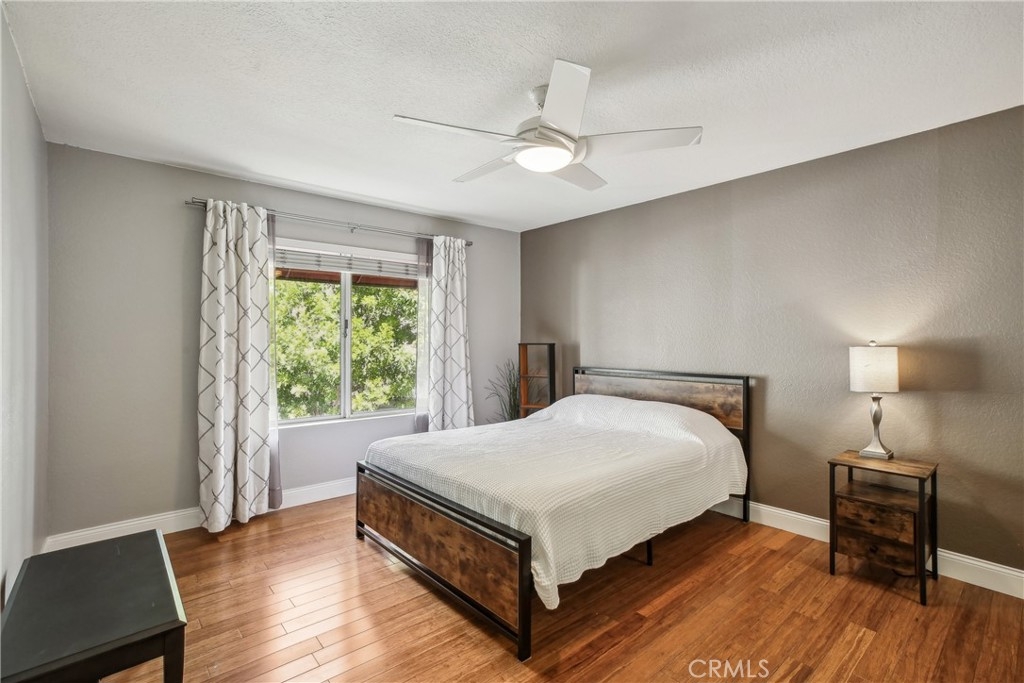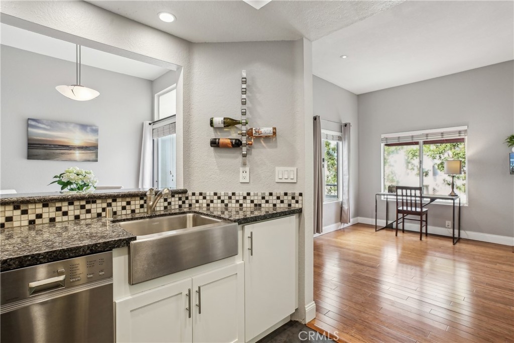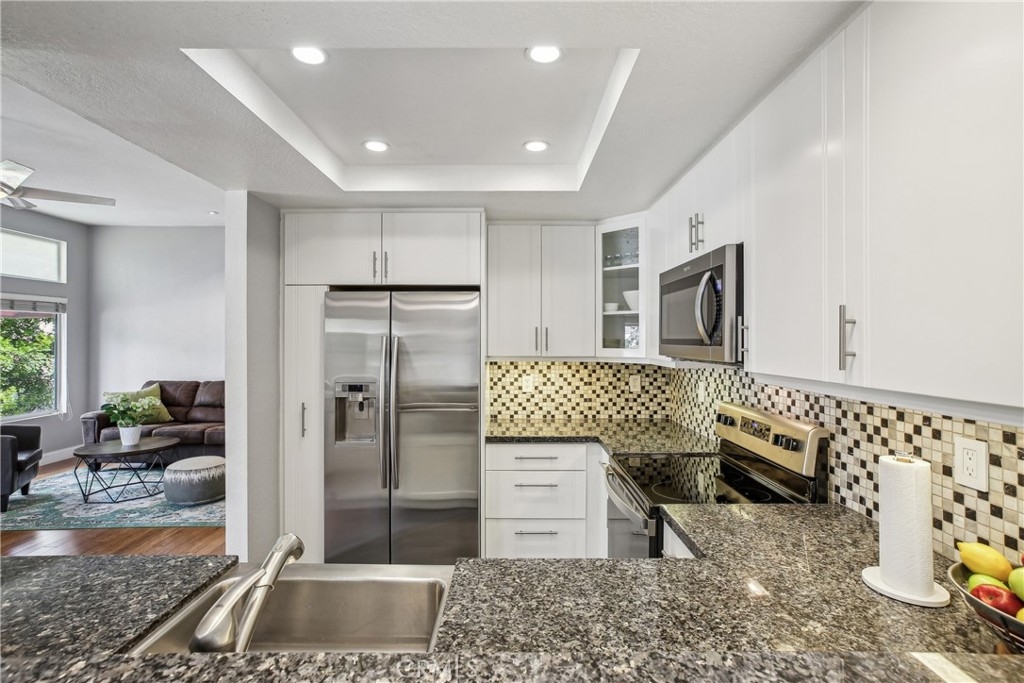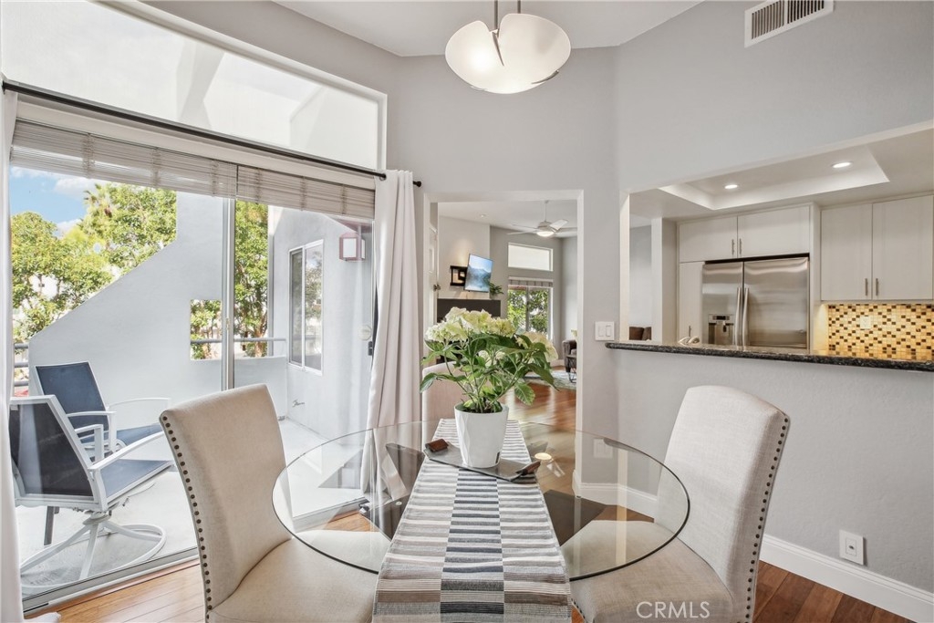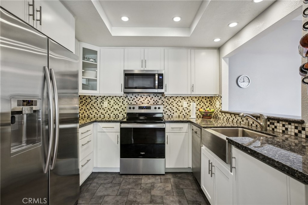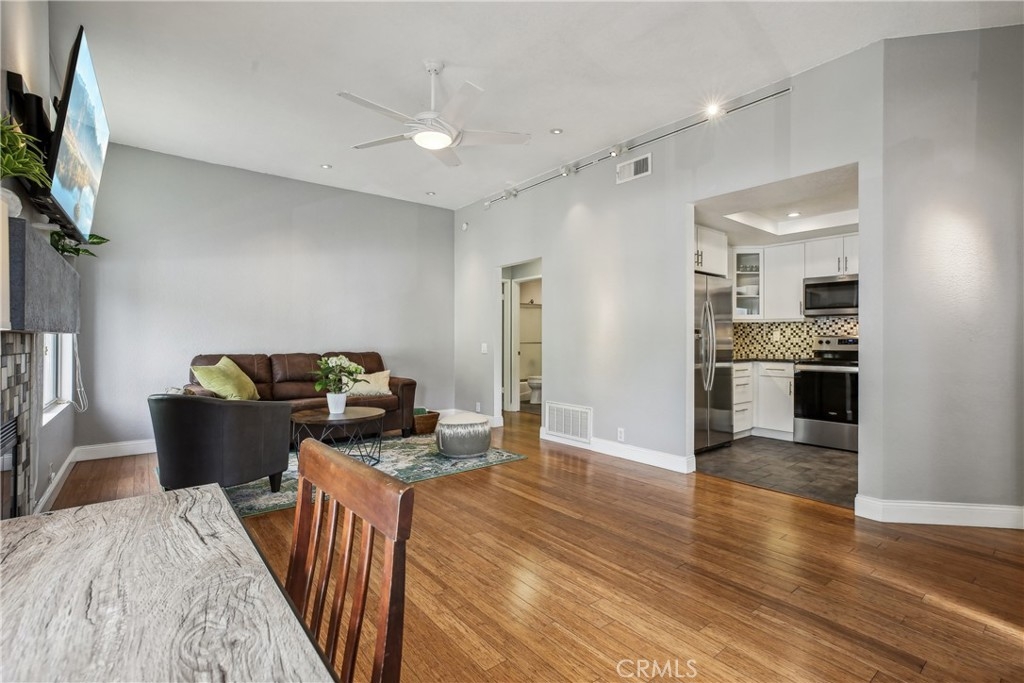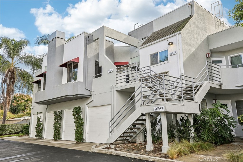 This remodeled 1-bedroom, 1-bath upper-unit home features bamboo flooring and a bright open layout. The updated kitchen boasts granite countertops, a tile backsplash, recessed lighting, and new stainless steel appliances. Enjoy a spacious primary bedroom with a walk-in closet and a fully renovated bath. Current dining room is convertible into a child's bedroom or office! Relax on the private patio with stunning sunset views and gas outlet for barbecuing. Includes a detached garage, two parking permits, association pool, spas, greenbelts, and barbecues. Located near Mission Viejo Mall with Lake Mission Viejo membership. Move-in ready and waiting for you—make it yours today!
