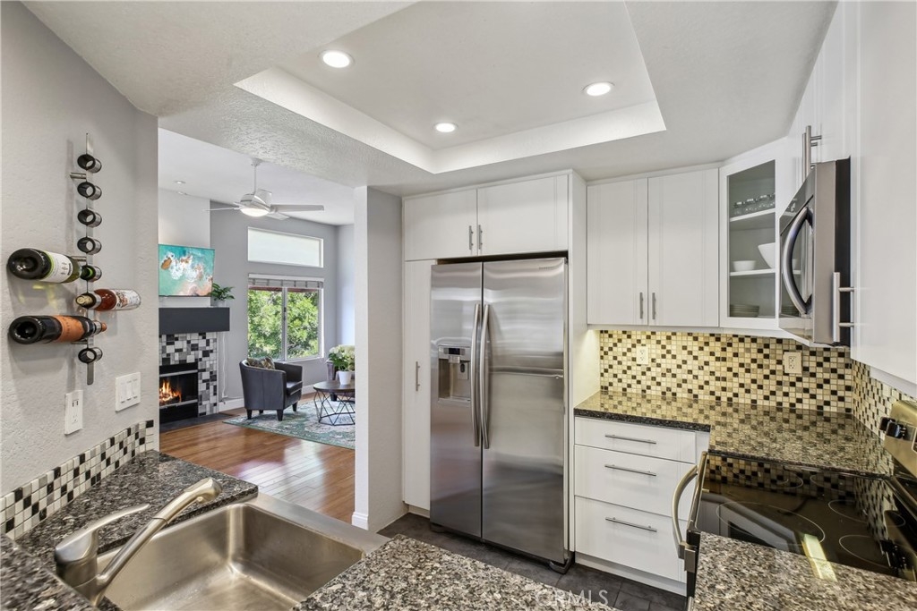 This remodeled 1-bedroom, 1-bath upper-unit home features bamboo flooring and a bright open layout. The updated kitchen boasts granite countertops, a tile backsplash, recessed lighting, and new stainless steel appliances. Enjoy a spacious primary bedroom with a walk-in closet and a fully renovated bath. Current dining room is convertible into a child's bedroom or office! Relax on the private patio with stunning sunset views and gas outlet for barbecuing. Includes a detached garage, two parking permits, association pool, spas, greenbelts, and barbecues. Located near Mission Viejo Mall with Lake Mission Viejo membership. Move-in ready and waiting for you—make it yours today!