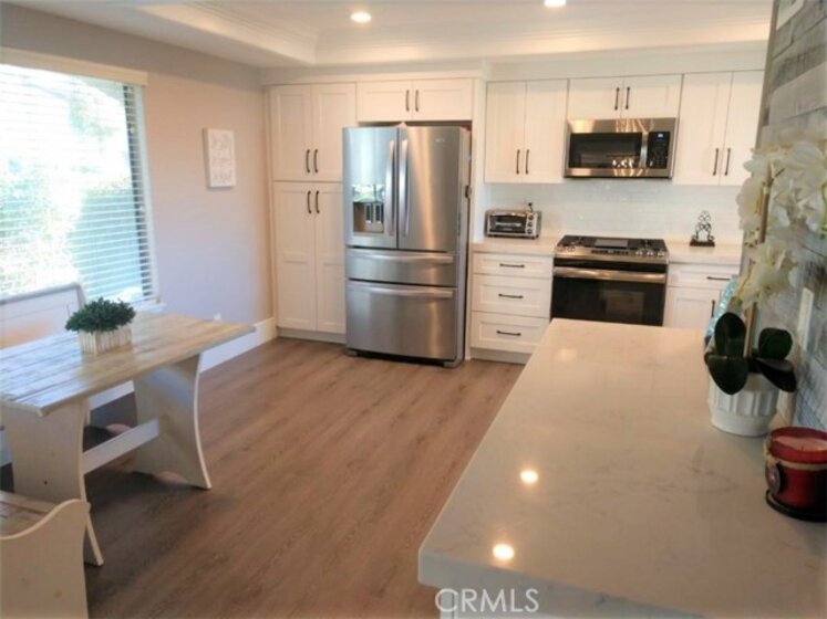Upgraded tri-level end-unit townhome in premium location within the development, adjacent to Mission Viejo Country Club Golf Course! No one above or below; only one shared wall. Patio faces a huge grassy area maintained by the HOA (it's almost like having your own back yard!). Spacious kitchen is totally remodeled, and features stainless appliances, oversized sink, built-in wine cooler, and beautiful custom cabinets. Kitchen has breakfast nook (in addition to separate dining room). Premium laminate-wood flooring, scraped ceilings, recessed lighting, huge master bathroom rainfall shower, fireplace accented with brick and marble, cathedral ceilings, view balcony, separate laundry room, and newer windows! Two car attached garage with storage racks. Exterior recently painted. 2nd HOA is for Lake Mission Viejo Association ($127 semi-annual). Lake features two sandy beaches, event clubhouse, fishing dock, boat rentals, summer concerts, festivals, and more! Low tax rate!