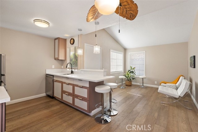 WOW!!! WHY RENT WHEN YOU CAN BUY? This gem has been completely remodeled with New REAL SOLID WOOD FLOORING and Paint. KITCHEN with beautiful QUARTZ COUNTERS, All NEW APPLIANCES include a beautiful NEW RANGE with a DESIGNER HOOD with glass accents, a NEW SINK with a NEW FAUCET, NEW DISHWASHER, NEW REFRIGERATOR (included), and NEW GARBAGE DISPOSAL. NEW LIGHTING PENNANTS over the extended quartz counter area with room for 2 barstools. The bathroom is also upgraded with a vanity with glass doors. There is upgraded lighting and a custom sink. Even the medicine cabinet is new and is mirrored inside. There is an abundant walk-in closet in the bedroom suite. The bathtub has a NEW QUARTZ ENCLOSURE with a nice tile inset for soap, and a NEW style tub enclosure. Low maintenance tile in the separate bathtub and toilet area. The entire condo has new DOOR CASINGS and BASEBOARDS and high ceilings. A nice area on the balcony to sit and enjoy the view of the trees. and a peek of the pool. This particular unit is private as it is located on a corner. It has EXTRA WINDOWS than most in the complex and allows for a nice cross breeze. Has WASHER/DRYER. 1 covered carport spot is included. Space #394. NEW WATER HEATER. There is A/C as well. HOA covers Water, trash, and sewer fees. The second HOA of $22 Includes membership to Lake Mission Viejo. Lake amenities include a playground, lake beach, grassy areas, boat rentals, summer movies, and concerts. There is also a rentable event center for private parties and much more! FHA and VA FINANCING MAY BE ELIGIBLE.