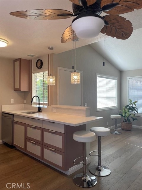 WOW!!! WHY RENT WHEN YOU CAN BUY? This gem has been completely remodeled with New REAL SOLID WOOD FLOORING and Paint. KITCHEN with beautiful QUARTZ COUNTERS, All NEW APPLIANCES include a beautiful NEW RANGE with a DESIGNER HOOD with glass accents, a NEW SINK with a NEW FAUCET, NEW DISHWASHER, NEW REFRIGERATOR (included), and NEW GARBAGE DISPOSAL. NEW LIGHTING PENNANTS over the extended quartz counter area with room for 2 barstools. The bathroom is also upgraded with a vanity with glass doors. There is upgraded lighting and a custom sink. Even the medicine cabinet is new and is mirrored inside. There is an abundant walk-in closet in the bedroom suite. The bathtub has a NEW QUARTZ ENCLOSURE with a nice tile inset for soap, and a NEW style tub enclosure. Low maintenance tile in the separate bathtub and toilet area. The entire condo has new DOOR CASINGS and BASEBOARDS and high ceilings. A nice area on the balcony to sit and enjoy the view of the trees. and a peek of the pool. This particular unit is private as it is located on a corner. It has EXTRA WINDOWS than most in the complex and allows for a nice cross breeze. Has WASHER/DRYER. 1 covered carport spot is included. Space #394. NEW WATER HEATER. There is A/C as well. HOA covers Water, trash, and sewer fees. The second HOA of $22 Includes membership to Lake Mission Viejo. Lake amenities include a playground, lake beach, grassy areas, boat rentals, summer movies, and concerts. There is also a rentable event center for private parties and much more! FHA and VA FINANCING MAY BE ELIGIBLE.