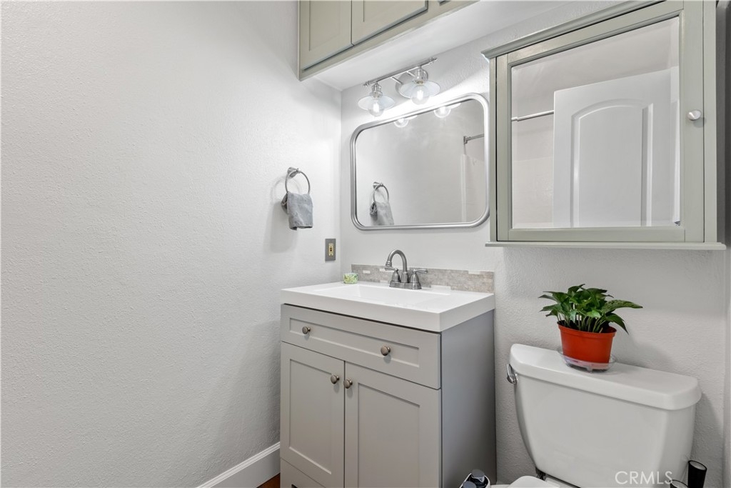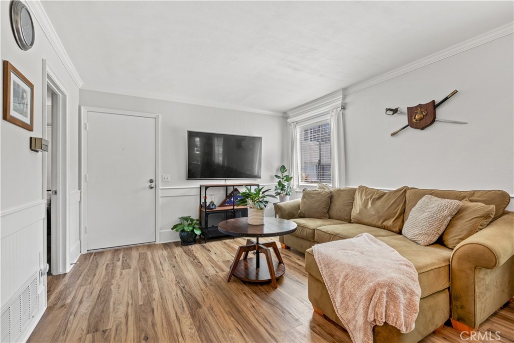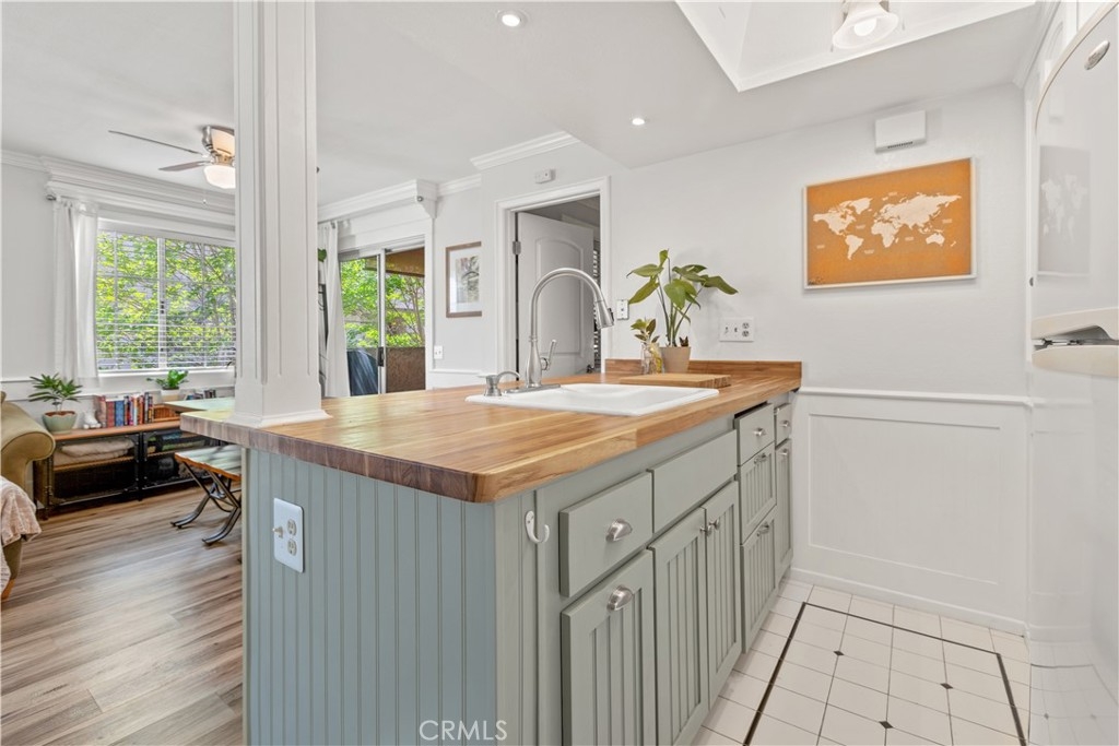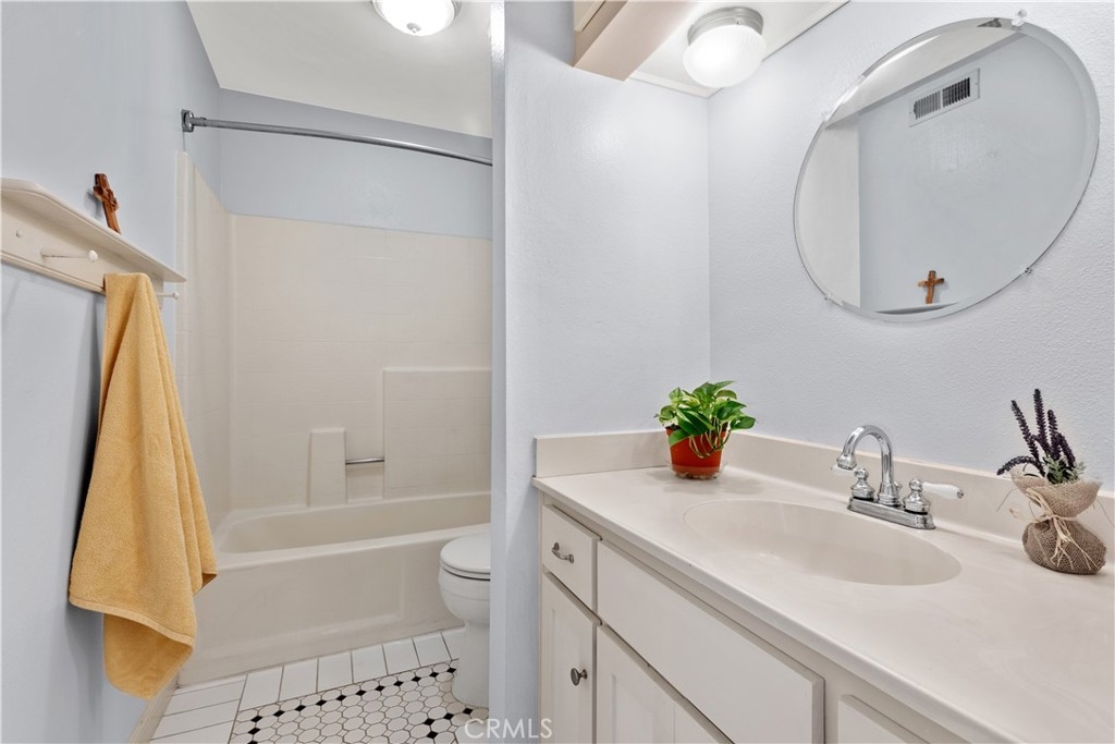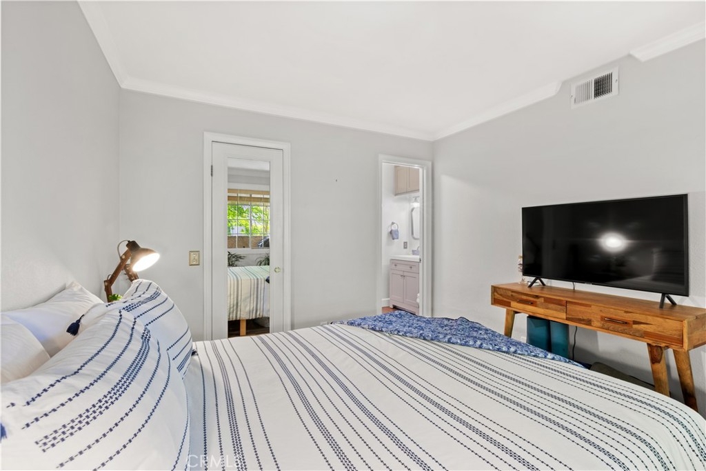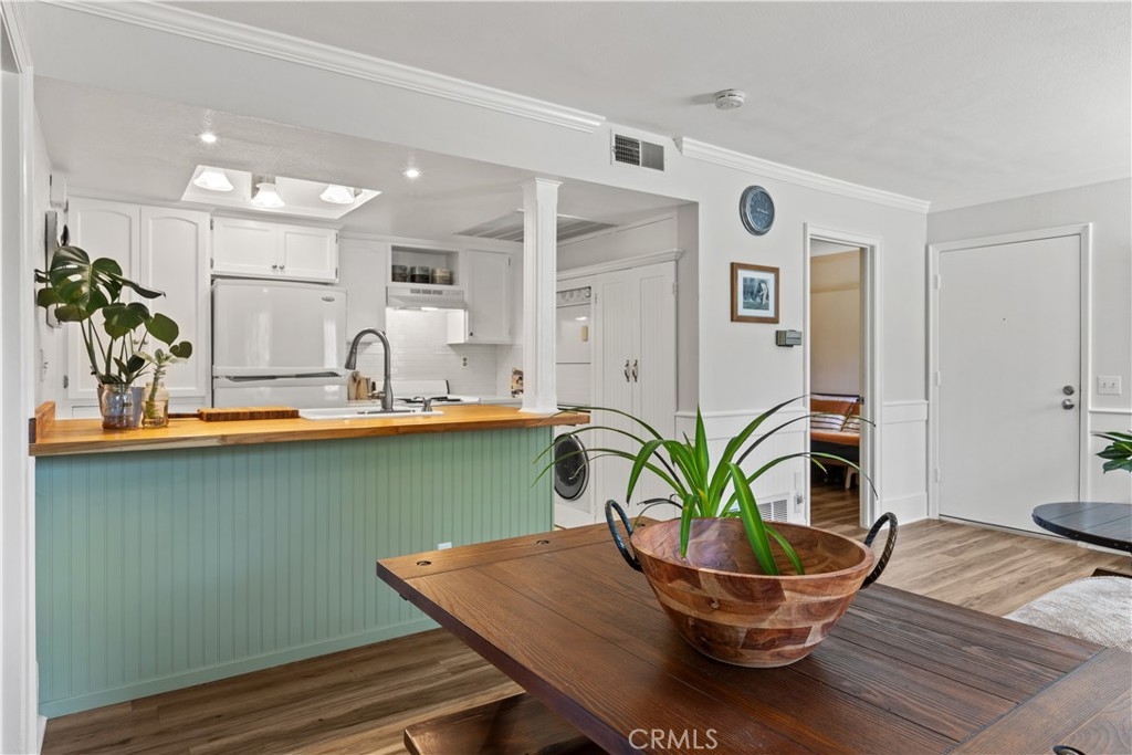Picture perfect downstairs single story condo with no interior steps showcases 2 bedrooms, 2 bathrooms and 2 COVERED ASSIGNED CARPORTS. The unit has been re-piped with PEX and vinyl wood flooring expands the entire home. This ideal floor plan offers an open concept and shows light and bright. The updated kitchen has beautiful two-tone cabinets and a butcher block countertop, newer hood, and a custom spacious pantry. Both bathrooms have updated vanities with stone countertops. Windows are adorned with shades and outside on the private patio is a drop-down shade to keep it cool and provide privacy. One bedroom has a walk-in closet, and the second bedroom provides floor to ceiling custom closets and storage. Both bedrooms have their own attached private bathroom. Other features include inside laundry, wainscoting, crown molding and central AC. Dishwasher hookups present to the right of the sink. The HOA has two community pools and joining the Lake Mission Viejo membership is an optional feature that has many privileges such as summer concerts, boat rentals and a private beach with a concession stand. The location is superb next to lots of great shopping and restaurants. Water and trash is included in HOA. Community is FHA and VA financing approved.