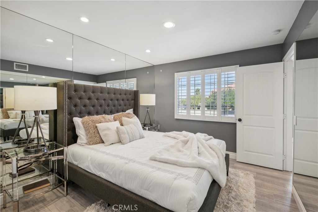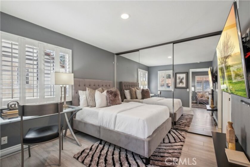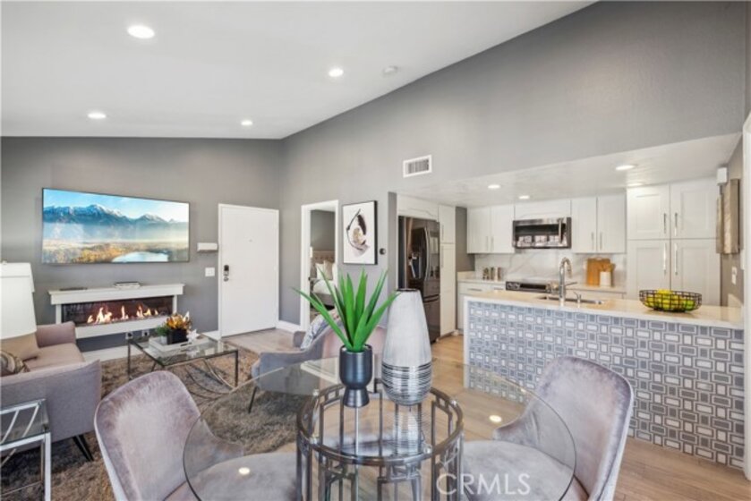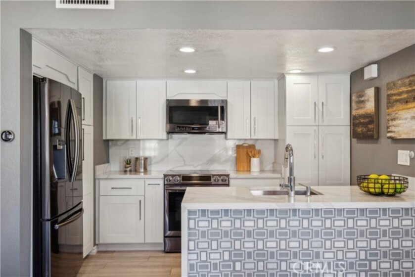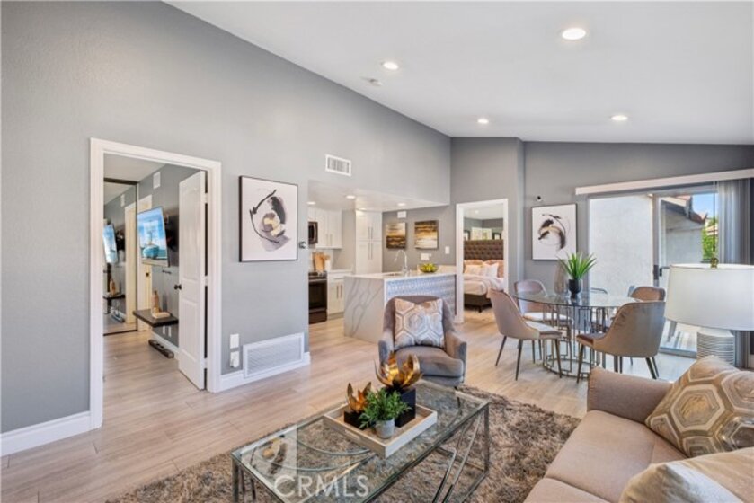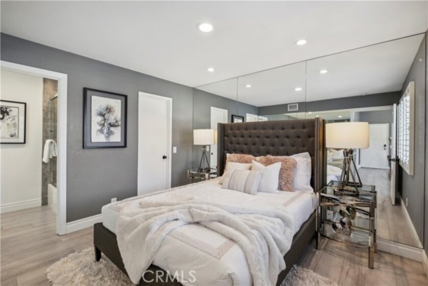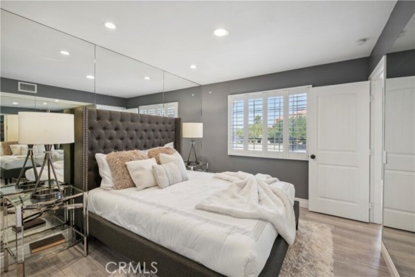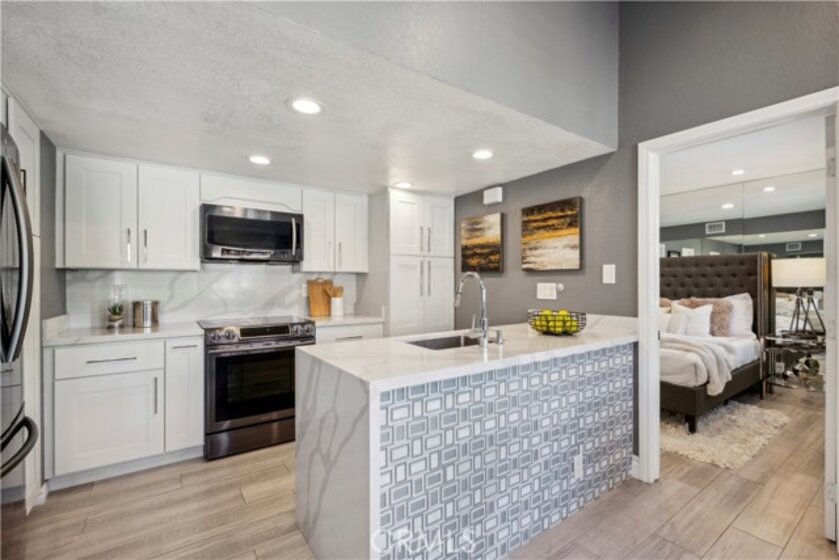 Step into contemporary elegance as you enter this beautifully renovated 2-bedroom, 2-bathroom upper unit condo located in Las Palmas in Mission Viejo. Featuring modern tile flooring throughout, this home exudes sophistication and style. The spacious, open floor plan is bathed in natural light, thanks to a large sliding glass door that leads to a private balcony—ideal for both indoor and outdoor entertaining. The heart of the home boasts a chef's dream kitchen with a striking waterfall island, sleek stainless-steel appliances, and recessed lighting that highlights every detail. Retreat to the luxurious dual primary suites, complete with mirrored closet doors, recessed lighting, and ensuite bathrooms. Each bathroom is a haven of relaxation with gray tile flooring, quartz slab countertops, one with a custom tile walk-in shower and the other with a tub/shower combo, built-in speakers, mirrors with LED lighting, and bidet toilets. This condo seamlessly blends modern comfort with thoughtful design, making it a perfect place to call home.