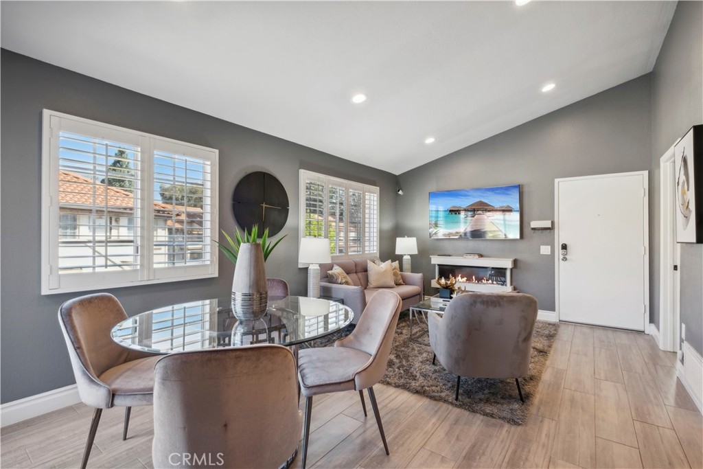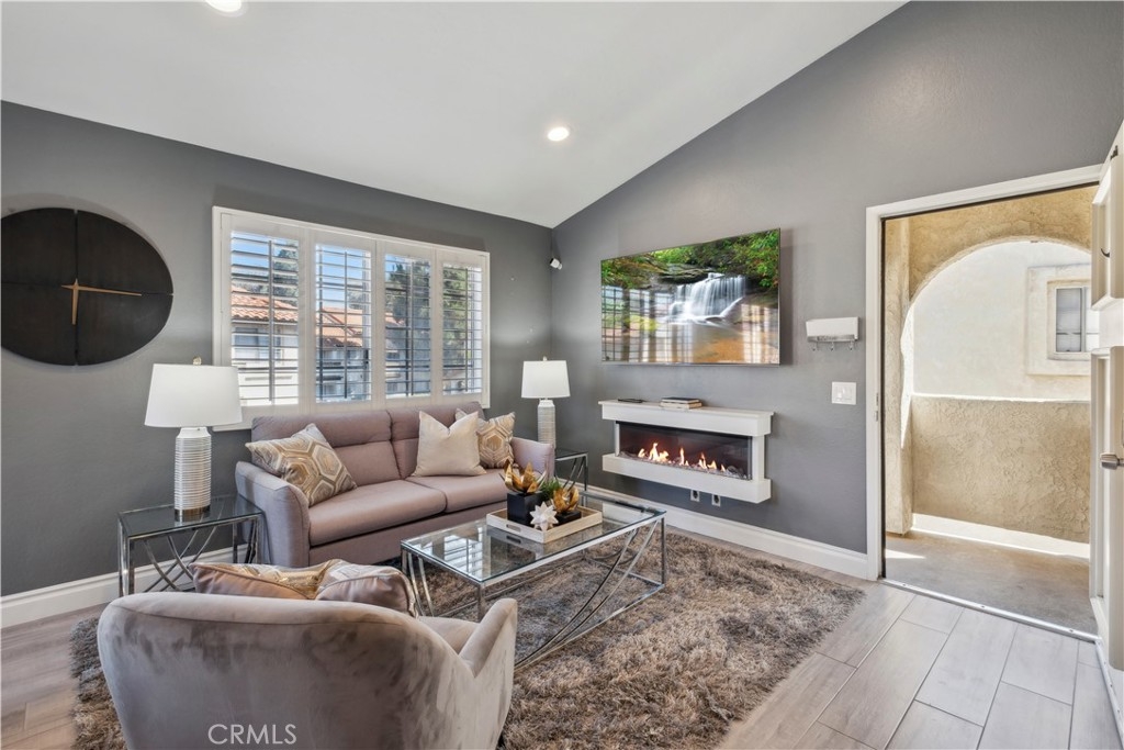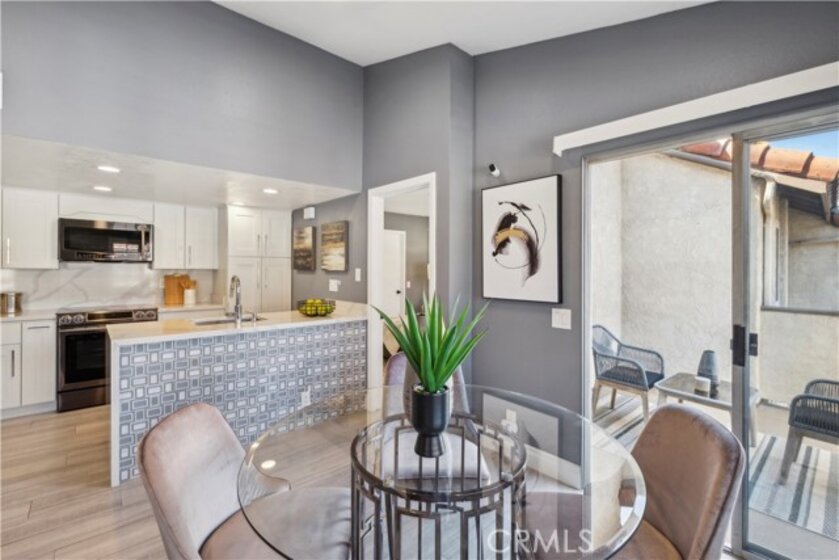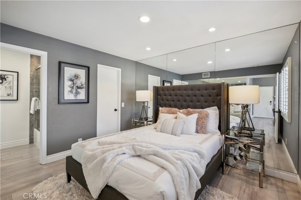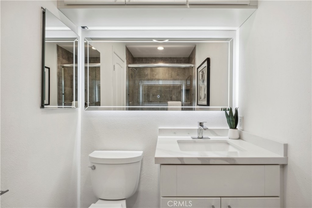 Step into contemporary elegance as you enter this beautifully renovated 2-bedroom, 2-bathroom upper unit condo located in Las Palmas in Mission Viejo. Featuring modern tile flooring throughout, this home exudes sophistication and style. The spacious, open floor plan is bathed in natural light, thanks to a large sliding glass door that leads to a private balcony—ideal for both indoor and outdoor entertaining. The heart of the home boasts a chef's dream kitchen with a striking waterfall island, sleek stainless-steel appliances, and recessed lighting that highlights every detail. Retreat to the luxurious dual primary suites, complete with mirrored closet doors, recessed lighting, and ensuite bathrooms. Each bathroom is a haven of relaxation with gray tile flooring, quartz slab countertops, one with a custom tile walk-in shower and the other with a tub/shower combo, built-in speakers, mirrors with LED lighting, and bidet toilets. This condo seamlessly blends modern comfort with thoughtful design, making it a perfect place to call home.