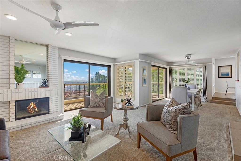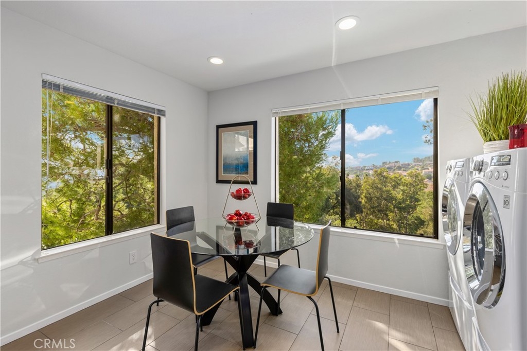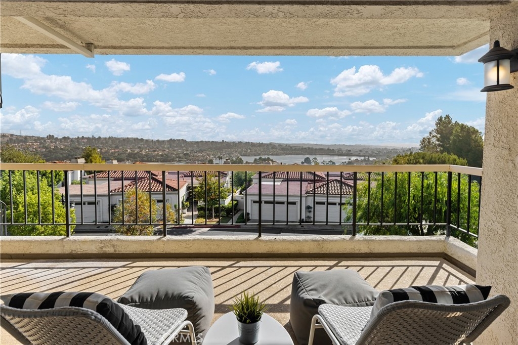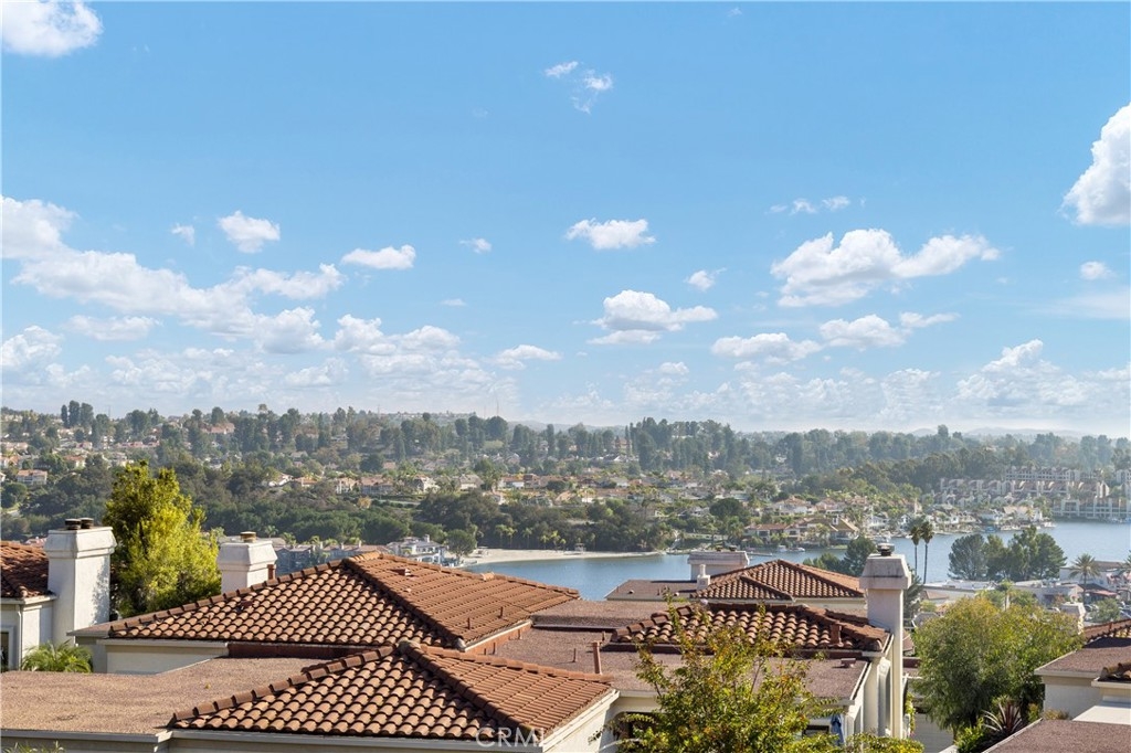 Take in the spectacular PANORAMIC Lake Mission Viejo and Saddleback Mountain views from almost every window of this remodeled Mallorca condo. Perched at the top of the community, this contemporary home offers many custom features. Enjoy the view from the sleek kitchen that offers custom white cabinetry with clean straight lines, soft close drawers/doors, and a glossy surface for easy cleaning. Rich red quartz counters and stainless steel micro-tile backsplash give the kitchen a pop of color and a modern feel. LG stainless steel appliances, including the refrigerator, along with a pantry cabinet with pull-out drawers complete the space. Bright and airy breakfast nook offers views of the surrounding lush pine trees and conveniently includes the washer and dryer (also included). Spacious family room, with cozy white brick fireplace, and dining room both offer balcony access through large sliding glass doors. Enjoy your morning coffee or dine al fresco on the balcony while enjoying the lake view. You will be lulled to sleep as you gaze at the city lights that reflect off the lake from the tranquil primary bedroom suite. Primary bathroom offers large walk-in shower designed with black and white tile detailing and frameless shower enclosure, dual sinks with white quartz counters, raised porcelain sinks, contemporary fixtures, and individual adjustable vanity mirrors. The open design custom closet organizer allows for the greatest use of space and storage options. The side hallway leads to the secondary bedroom with walk-in closet. The hall bathroom reflects the primary bathroom design with white quartz counters, raised porcelain sink, contemporary sink fixture, and adjustable vanity mirror. Other custom features include recessed lighting and updated outlets in the kitchen and bathrooms, modern ceiling fans; new HVAC system and thermostat installed in 2018. Mallorca is a 24 hour guard-gated community with facilities that include two pools, private lake and beach access with picnic tables and restrooms. Enjoy Lake Mission Viejo privileges and activities year round.