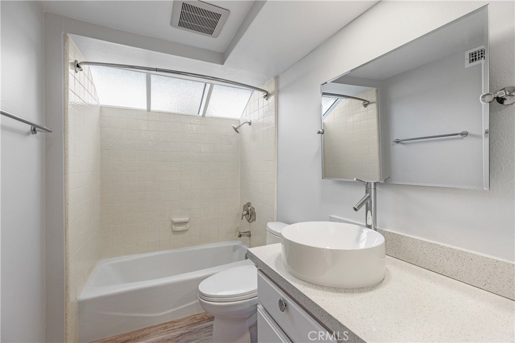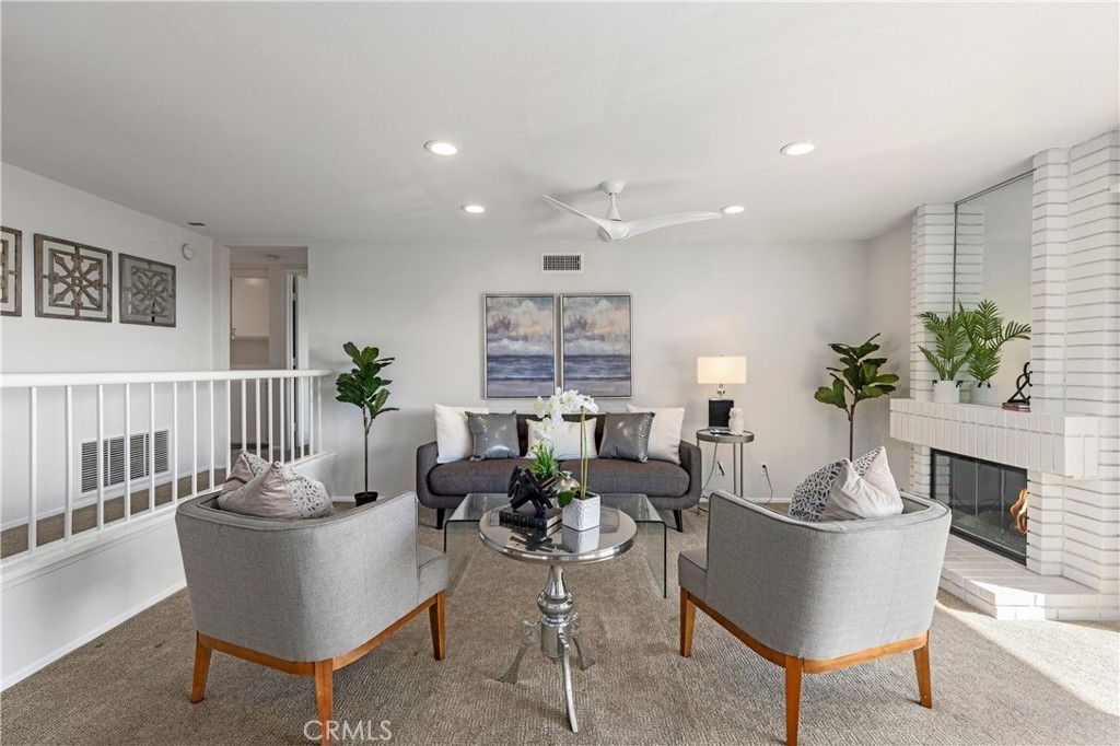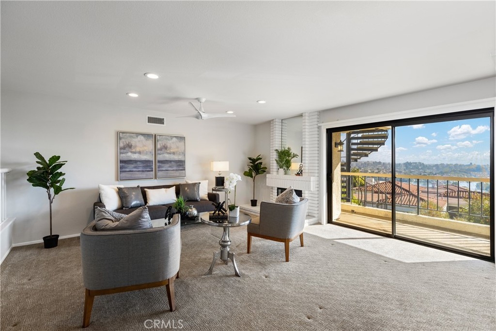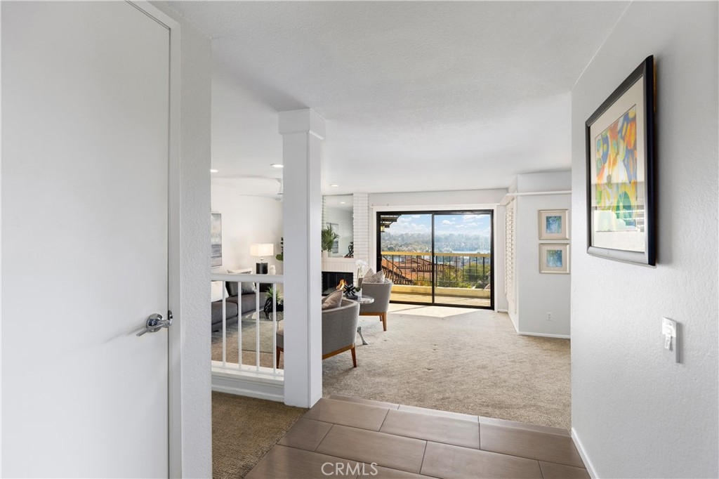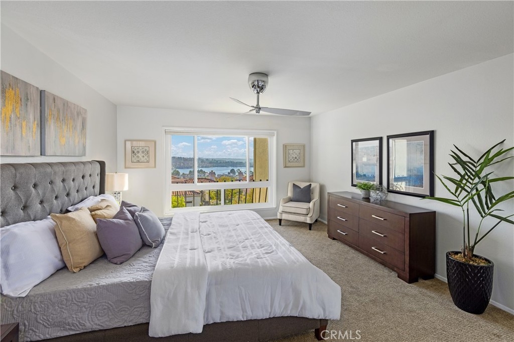 Take in the spectacular PANORAMIC Lake Mission Viejo and Saddleback Mountain views from almost every window of this remodeled Mallorca condo. Perched at the top of the community, this contemporary home offers many custom features. Enjoy the view from the sleek kitchen that offers custom white cabinetry with clean straight lines, soft close drawers/doors, and a glossy surface for easy cleaning. Rich red quartz counters and stainless steel micro-tile backsplash give the kitchen a pop of color and a modern feel. LG stainless steel appliances, including the refrigerator, along with a pantry cabinet with pull-out drawers complete the space. Bright and airy breakfast nook offers views of the surrounding lush pine trees and conveniently includes the washer and dryer (also included). Spacious family room, with cozy white brick fireplace, and dining room both offer balcony access through large sliding glass doors. Enjoy your morning coffee or dine al fresco on the balcony while enjoying the lake view. You will be lulled to sleep as you gaze at the city lights that reflect off the lake from the tranquil primary bedroom suite. Primary bathroom offers large walk-in shower designed with black and white tile detailing and frameless shower enclosure, dual sinks with white quartz counters, raised porcelain sinks, contemporary fixtures, and individual adjustable vanity mirrors. The open design custom closet organizer allows for the greatest use of space and storage options. The side hallway leads to the secondary bedroom with walk-in closet. The hall bathroom reflects the primary bathroom design with white quartz counters, raised porcelain sink, contemporary sink fixture, and adjustable vanity mirror. Other custom features include recessed lighting and updated outlets in the kitchen and bathrooms, modern ceiling fans; new HVAC system and thermostat installed in 2018. Mallorca is a 24 hour guard-gated community with facilities that include two pools, private lake and beach access with picnic tables and restrooms. Enjoy Lake Mission Viejo privileges and activities year round.
