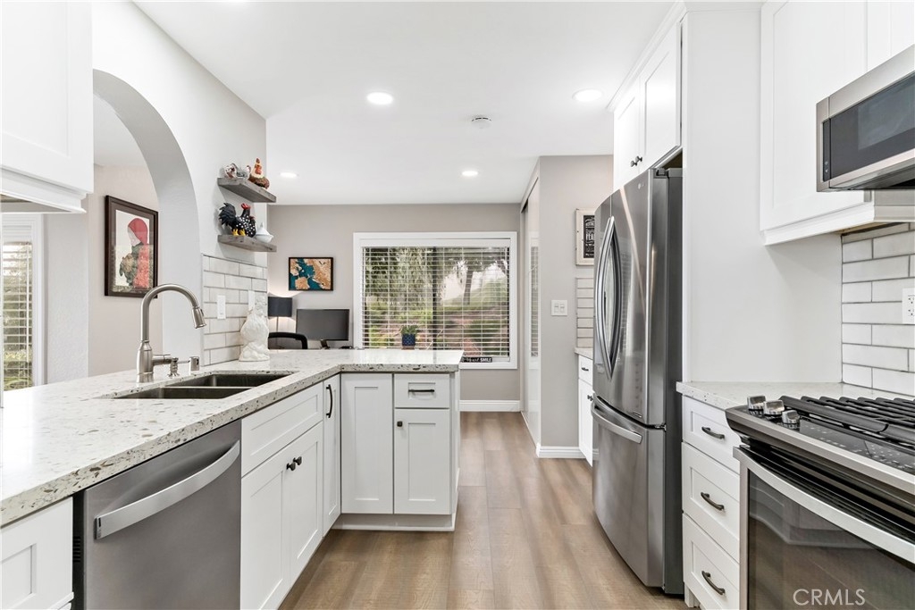 PEACEFULLY NESTLED NEAR THE NORTHERN EDGE OF MALLORCA'S CENTRAL GREENBELT.... This special location sits off the cul-de-sac, gently tucked against the widest portion of the walkway. It is conveniently situated between Mallorca's Upper and Lower Pools. Its South-Eastern orientation means good morning sunshine, and consistent, indirect sunlight throughout the day. Solitude? The nearest building in sight is about 130 feet due south. The panoramic views include multiple peaks of the lake, a glimpse of the oak preserve, sweeping vistas of the surrounding hills/city lights and lots of nearby greenery. With a large rear patio, a circular flow to a galley kitchen, a multi-functional nook, a step down living room/dining room/master bedroom, a 2 car garage and with direct light in both bathrooms, this "Baroness" model is the most popular floor plan in the desirable Mallorca Tract. The amazing, remodeled kitchen features Shaker Style Cabinets, complete with dovetail joint construction, soft close doors and drawers, a Lazy Susan and roll-out pantry shelving. Finishing off your kitchen experience, you will find recessed lighting, subway tiles, stylish quartz counters and stainless steel appliances, including a low profile microwave. Amenities found throughout the home include Decor plugs/switches, a textured ceiling, "luxury vinyl" laminate flooring, opaque glass closet doors, faux wooden blinds, recessed can lighting, door casings, window casings and deluxe baseboards. The living room has a brick fireplace and sliding door access to the rear patio where you may enjoy relaxing or taking meals. Both baths have been completely renovated. In the master bath, you will find a generous triple closet, dual sinks, quartz counters, shaker cabinets and a walk-in shower with tile walls and a "barn door" style glass shower enclosure. The Mallorca Tract itself has a 24/7 Manned Gate, it's own Private Beach with picnic area, 72 in-the-water boat docks, bar-b-q's, a fishing dock, a boat loading dock and a drydock storage area for paddleboards. Of course, Lake Membership offers boat rentals, summer concerts, fireworks, swimming, fishing and private beaches. Come, and do yourself a favor by investigating what it feels like to live as if you were on a perpetual vacation.