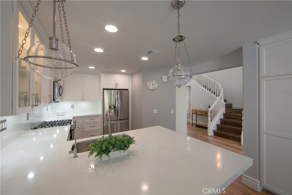 WOW! This stunning Mirasol Residence by Barratt has all the bells and whistles and will surely capture your heart! This breathtaking two-story townhome is tucked away in one of the most PRIVATE & PEACEFUL locations in the gated MIRASOL COMMUNITY. Homes on this street rarely come on the market. Offering 3 bedrooms this spectacular home lives like a single-family residence with desirable open-concept living, charming backyard, luxury wood flooring and swanky upgrades surpassing every home in this price range. Enjoy cheerful natural lighting throughout this spectacular open layout where walls of windows frame inspiring views and create an inviting gathering place for family and friends. Designed for the modern entertainer and graced with luxurious finishes, the sweeping great room is the heart of this home. The chef-inspired kitchen has been completely transformed and features a widened entrance and a redesigned oversized quartz peninsula that comfortably seats four. Other luxury kitchen amenities include: newer white cabinetry with high-end pulls, pull-out spice rack, under mount lighting, illuminated display cabinet, soft closing doors and drawers, quartz countertops/backsplash, touchless faucet, upgraded recessed lighting, decorative light fixtures, LG stainless appliances and custom pantry cabinets. Enjoy casual dining indoors or opt for the serene backyard oasis offering a low maintenance patio– fully enclosed by a privacy fence that backs to a tranquil hillside...the options for hosting are endless. This floor plan offers plenty of versatility with 3 bedrooms upstairs. Down the hall from the secondary bedrooms a generous primary suite provides the perfect retreat with serene hillside views and luxurious spa-like bath offering spacious walk-in closet, separate shower and therapeutic soaking tub. 2-car DIRECT ACCESS GARAGE (with laundry area & overhead storage). Community amenities include sparkling pool and spa. With so much style and function packed into one place, this home has all your needs covered. Don’t miss your chance to see this stunning property today!