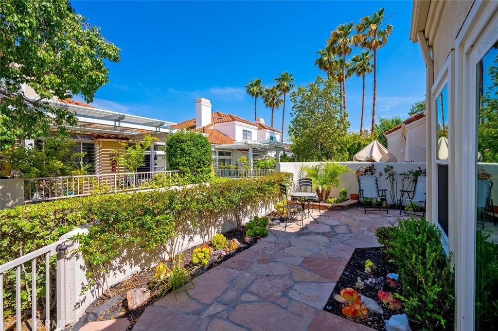 Designer Single level home in a Peaceful location. Recent new carpet and Bathrooms remodeled, this Two bedroom, Two Bath home is a delight. Situated at the end of a Cul de sac, there is no through traffic. Cathedral ceilings in Living, Dining and Master bedroom. Kitchen is equipped with Stainless appliances including Bosch dishwasher, GE Oven/Stove top, Microwave and French Side by Side Refrigerator. Newer Vinyl windows throughout including Sliders in both Living Room and Master bedroom. Custom window treatments (some electric) add to the elegance of this home. Professionally designed and recently installed fireplace with intricate iron work and marble surround is a lovely decorative statement. Front and back patio has been recently refreshed with greenscape adding to the tranquil setting. Repiped and newer HVAC system complete this move-in-ready home. Single car direct access garage and separate single car detached garage just adjacent to this home make it convenient for that second car or additional needed storage space. Be as busy as you would like to be in this 55+ Palmia community filled with amenities such as 18-hole Putting Green, Tennis & Pickleball courts, Fitness room, Bocce, Shuffleboard, Swimming pool, Clubs etc. Homeowners also belong to the Mission Viejo Lake where boating, kayaking, concerts and picnicking are all available. Welcome!