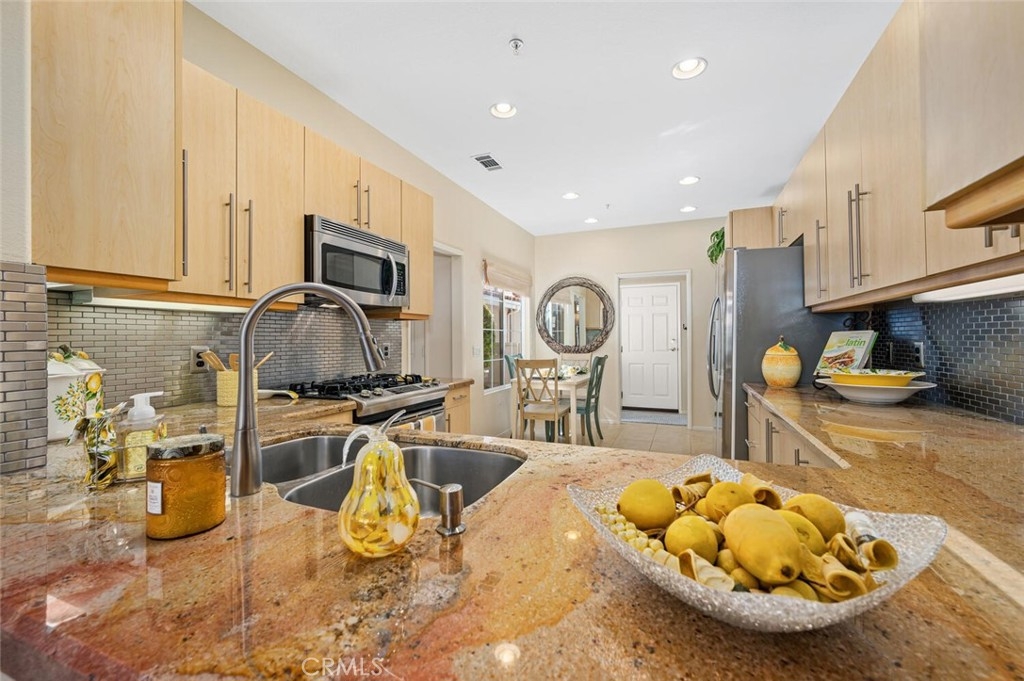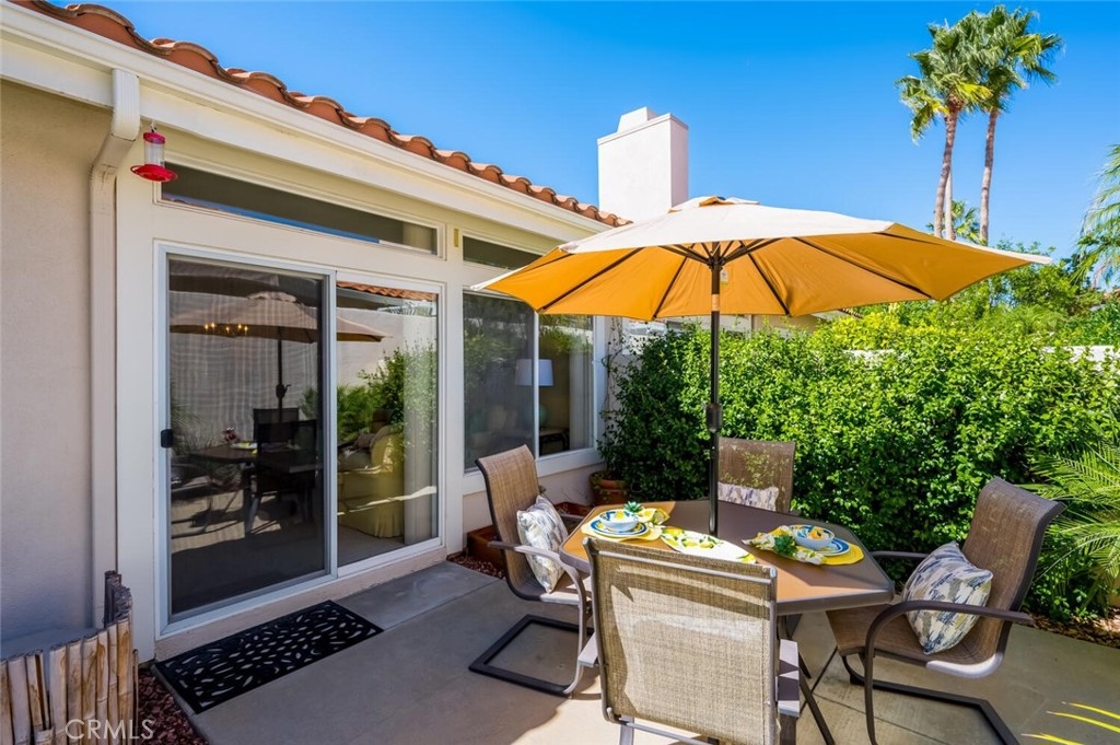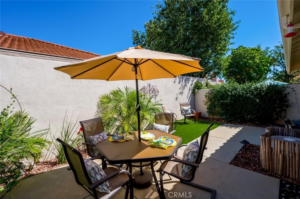 Lovely UPDATED 2 Bedroom, 2 Bath Condo in the 55+ Community of Palmia. One enters through a Charming Courtyard with Single Car Garages on both sides-one with direct access to home. Nice sized remodeled Kitchen with Beautiful Slab Granite Countertops, Upgraded backsplash and Stainless Appliances. Contemporary Cabinetry fits right into Current Interior Design. Kitchen has Nook for Dining. Indoor Laundry is an added bonus with functional Pocket door. Great Room enhanced with Cast Concrete Fireplace adjacent to a Dining area - Formal or Non-formal depending upon your preference. Both Primary Bedroom & Great Room have slider door access to nice sized Back yard. Secondary Bedroom situated toward the front of the home, Plantation Shutters and closet. Master bedroom enhanced with Ensuite bath, Walk in Closet, Dual Vanities with granite countertops. Back yard is as maintenance free as you want it to be. Synthetic lawn and plenty of area for Gardening. Home has been re-piped. Amenities within the Palmia community are plentiful. The Courts have their own Private Community Pool and Jacuzzi or head over to the main Clubhouse for Swimming, Jacuzzi, Fitness Room, Tennis, Pickleball, 18-hole Putting Green, Bocce, Shuffleboard, Library, Classes, Clubs, Trips and more. Owners also enjoy membership to Mission Viejo Lake with Boating, Beach, Concerts & Picnicking. So much to enjoy. Come see why your next home within the 55+ Community of Palmia is just like living in a Resort!