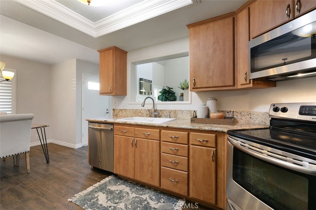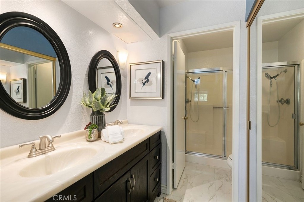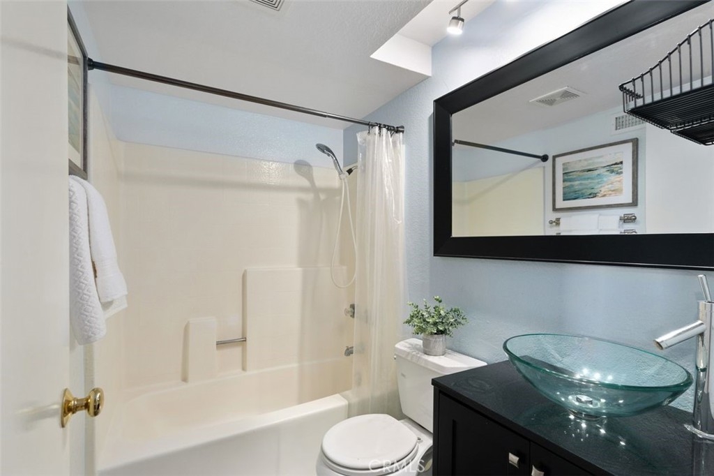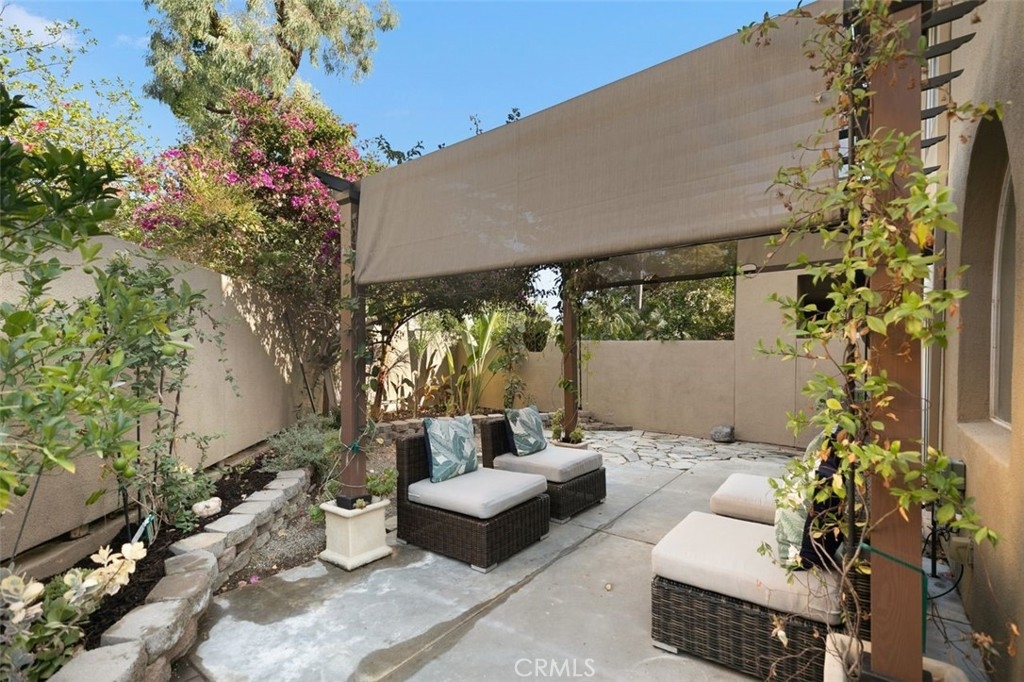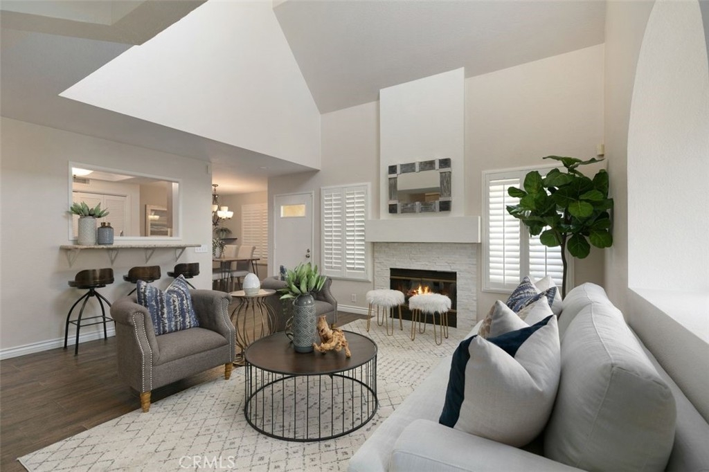 The minute you enter this condo, you will know that you're home! 3 bedroom and 3 full bathrooms, with one bed & bath conveniently located on the first floor. The kitchen has an open pass through that connects the kitchen & dining room to the living room. Sky-high, two-story ceilings allow natural light to flood the home. You can enter the direct access garage from the kitchen. The laundry is located inside but can be moved to the garage if you choose. Upstairs you will find the spacious master suite with cathedral ceilings, dual sink vanity and a full bath. Off the hallway there is another full bath perfect for the other bedroom. You will appreciate the lovely pool views from the second bedroom window. Rainbow Ridge is a wonderful community perfectly positioned at the top of the hill where Marguerite and Los Alisos intersect. There are two gorgeous swimming pools, multiple lush greenbelts and a children's playground. Welcome home!