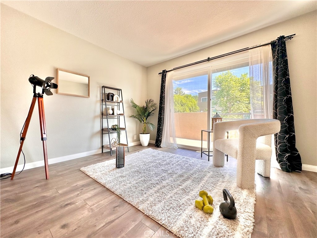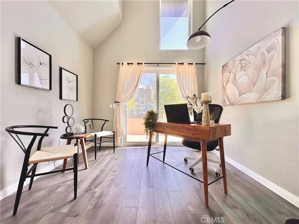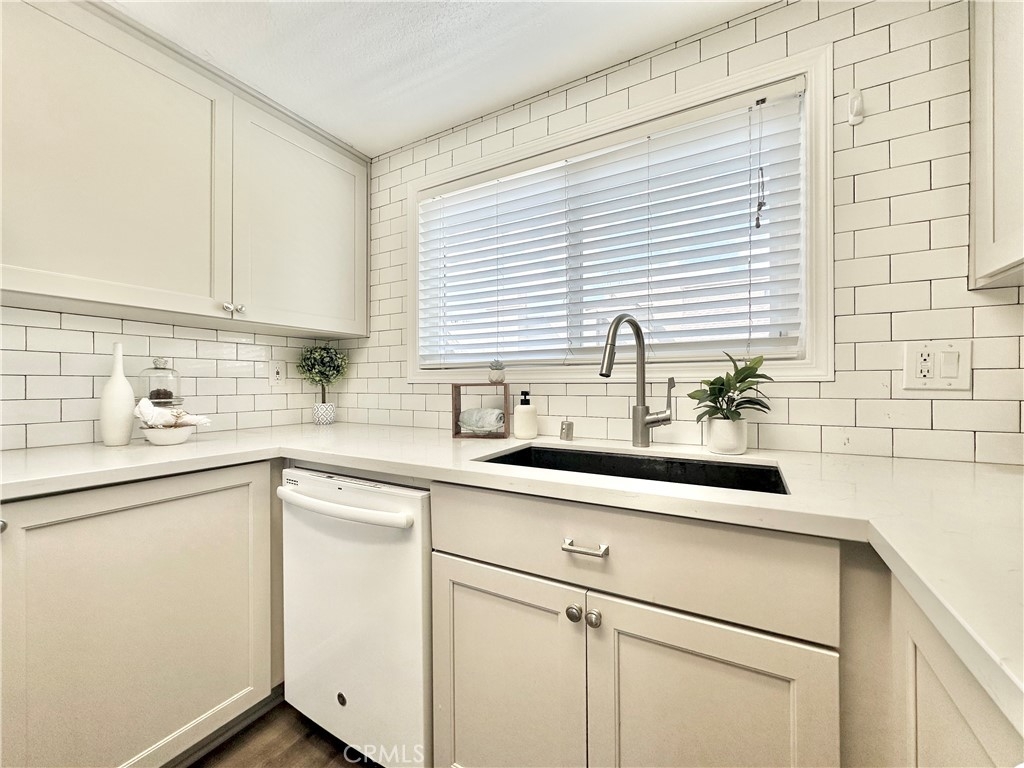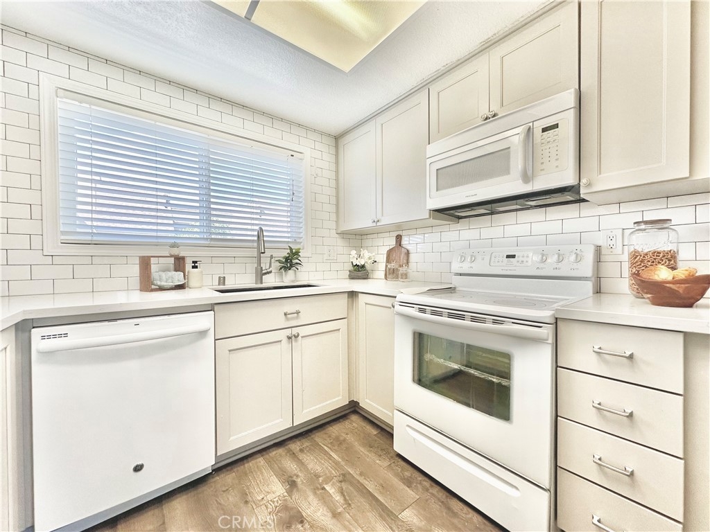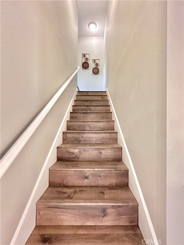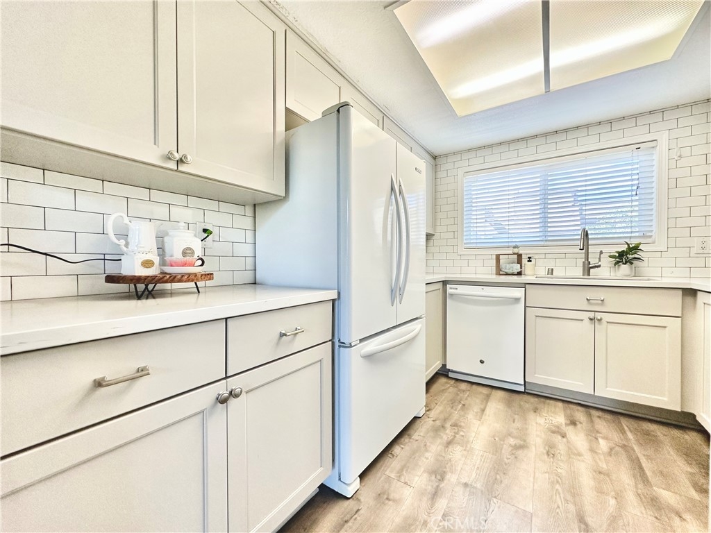 Welcome to this beautifully updated upper-level condo in the heart of Mission Viejo. This spacious two-bedroom, two-bath home offers comfortable living with thoughtful upgrades throughout. Step inside to find soaring, vaulted ceilings, modern paint, dual-pane windows, and laminate wood flooring accented by crown molding and upgraded baseboards. The open-concept layout is filled with natural light, creating a warm and inviting atmosphere. The kitchen is designed with style and function in mind, showcasing light gray cabinetry, quartz countertops, a subway tile backsplash, and a dining area that flows seamlessly into the great room. Here you’ll enjoy a cozy stone fireplace, a light-catching skylight, and access to your private patio with serene greenbelt views. The downstairs bedroom offers versatility as a guest room, office, or flex space, with a walk-in closet, while the upstairs bedroom features wood-like floors, and its own ensuite bath. A convenient in-unit laundry closet near the kitchen and a detached one-car garage with extra storage add everyday ease. Community amenities include two pools, two spas, and membership to Lake Mission Viejo, where you can enjoy boating, swimming, concerts, and year-round events. With no Mello-Roos and close proximity to shopping, dining, schools, and transportation, this home combines comfort, convenience, and lifestyle in one great package.