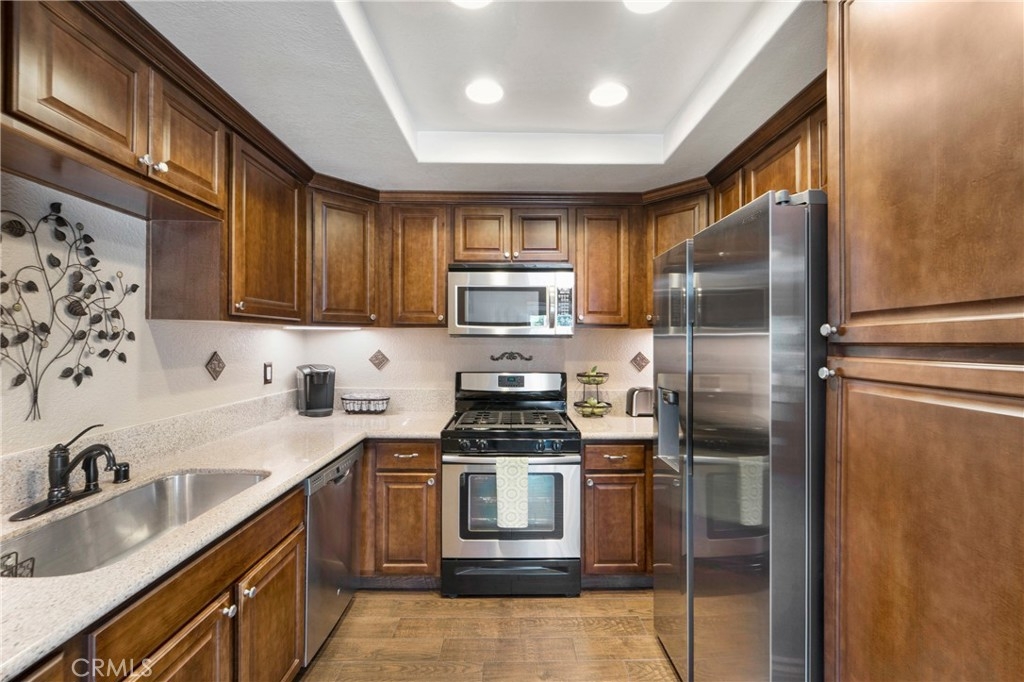 Live just blocks from a resort like membership at Lake Mission Viejo, in one of FBIs rated, Safest Cities In America! This gorgeous home has been completely remodeled! Ample space in this 2 bedroom, 1 car garage home, which has been upgraded to include newer dual pane windows and doors, as well as newer s.s. appliances and stacked high end, washer and dryer set, all included for the lucky buyer! Walk up the stairs, and onto your patio and awning covered, front door; then step into the light and bright space with soaring ceilings and natural light inviting you into the living and dining rooms. The kitchen is graced with upgraded cabinetry, slab granite counters, newer s.s. appliances, recessed lighting and a newly purchased, cabinet depth s.s. refrigerator. The bathroom is also completely upgraded, with a huge step in shower, upgraded cabinetry, granite counters and oil bronzed hardware. The master suite is graced with a generous walk in closet. The secondary bedroom boasts a sliding glass door out to the patio, fabulous for a home office, second bedroom or guest room. The stackable washer and dryer set, sits in it's own room, with lots of storage and an extra pantry space for all of your goodies. The gas fireplace allows for a cozy night in the living room, snuggling up for a movie on the large flat screen TV also included in this sale. The one car garage is located just under this unit, for ease of parking. Upgraded with wood tile flooring throughout, this seller spent over $50,000 of recent additions and upgrades! Very well situated in a quiet area of the tract, so close to hiking, biking and wilderness trails, dining, shopping and entertainment, as well as award winning schools! What a wonderful opportunity to become a homeowner in a fabulous location with all upgrades already done for you!! Just pack your bags and that's all you will need to move in, everything else is waiting for you here! Just minutes from the concerts, boating and fireworks show at Lake Mission Viejo. Located in a peaceful location of this very well cared for tract, called Rainbow Ridge and close to many community amenities, such as a pool, spa and park. Just around the corner from fabulous dining and shopping choices! Down the street from Saddleback Church. A true 10+ listing for a lucky buyer, all offered at a great price!! **Buyer fell out of escrow, their loss is your gain!**Be in your own gorgeous home for the holidays, it's ready for you to move right in!