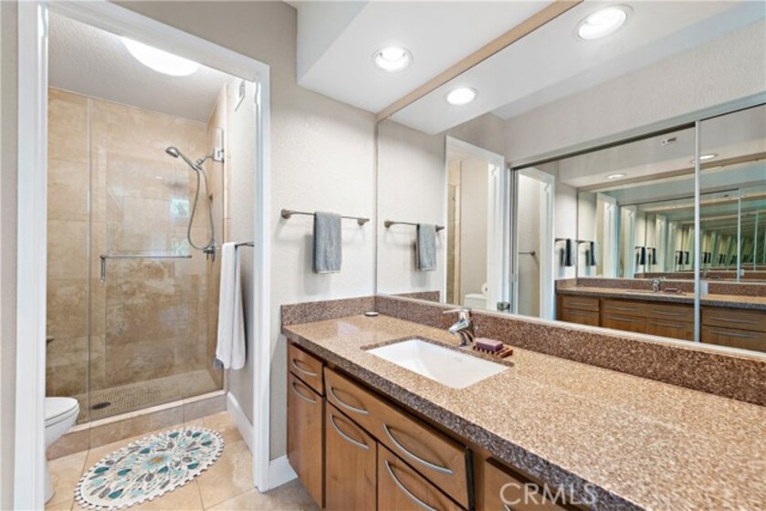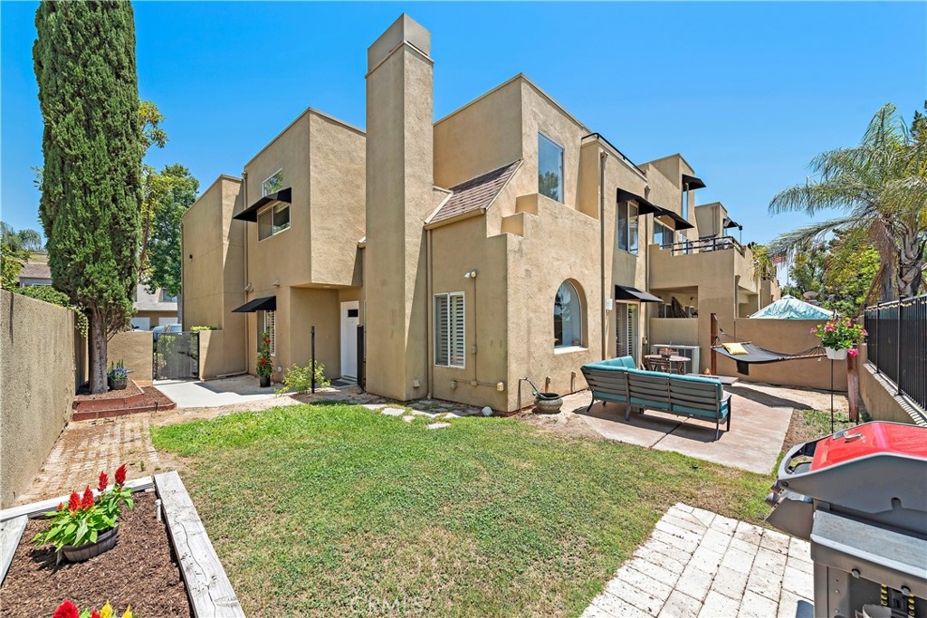 END-UNIT TOWNHOME with 3 bedrooms and 3 bathrooms located in the Rainbow Ridge community. This SPACIOUS, LIGHT, and BRIGHT home features an open concept floorplan. Enter into the inviting living room with soaring vaulted ceilings, updated flooring, and a cozy fireplace. The space seamlessly flows into the open-concept kitchen with granite counters, stainless steel appliances, a breakfast bar, and a dining area. Features throughout include recessed lighting, two-tone paint, large windows, and plantation shutters. A bedroom and full-sized bathroom are conveniently located on the first floor which is perfect for guests or for a home office. The second floor's primary bedroom features an en-suite bathroom with a step-in shower, a granite countertop vanity, and plenty of closet space. The secondary bedroom is generously sized and is adjacent to the full hall bathroom. Enjoy the sunsets and outdoor BBQs in the courtyard and wrap-around backyard. Amenities include two community pools, spas, a tot lot, and a walking path, and access to Lake Mission Viejo. No Mello-Roos. Don't miss out on this home!