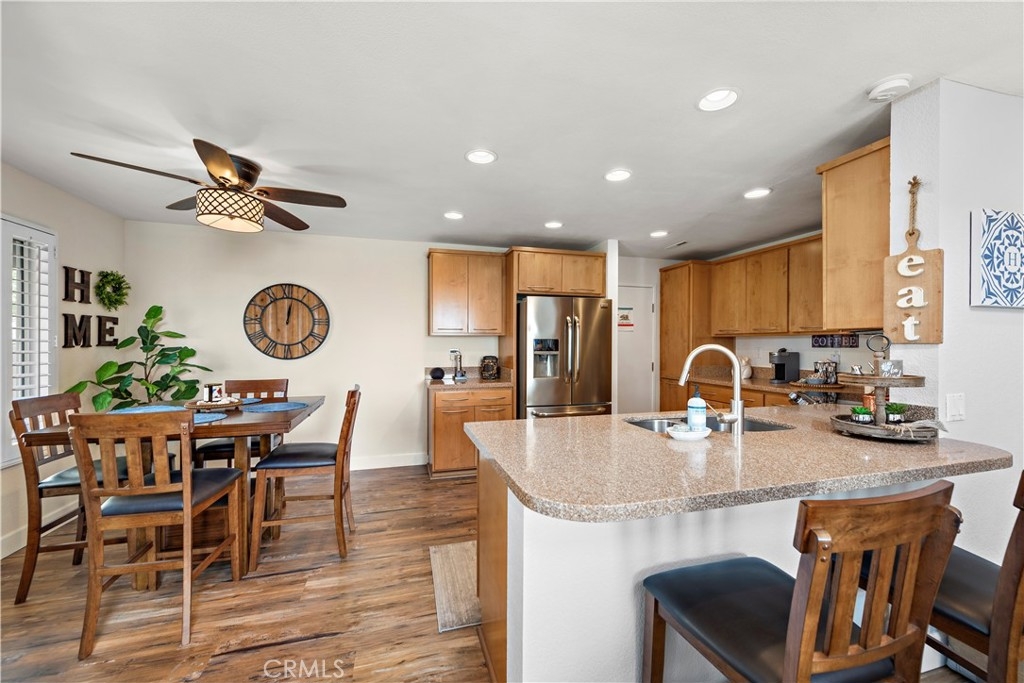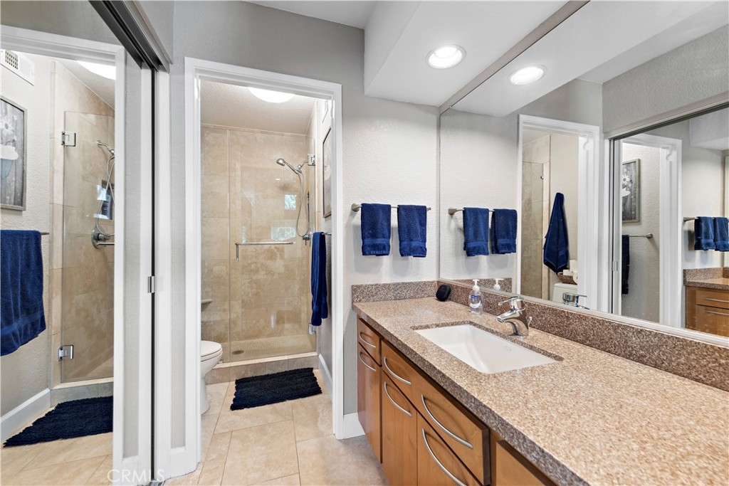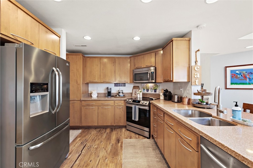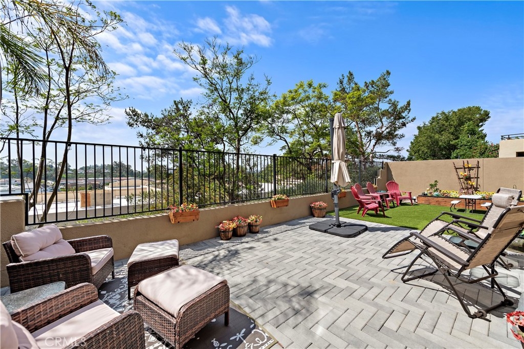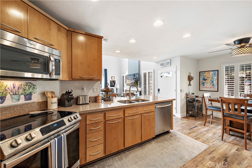 END-UNIT TOWNHOME with 3 bedrooms and 3 bathrooms located in the Rainbow Ridge community. This SPACIOUS, LIGHT, and BRIGHT home features an open concept floorplan. Enter into the inviting living room with soaring vaulted ceilings, updated flooring, and a cozy fireplace. The space seamlessly flows into the open-concept kitchen with quartz counters, stainless steel appliances, a breakfast bar, and a dining area. Features throughout include recessed lighting, two-tone paint, large windows, and plantation shutters. A bedroom and full-sized bathroom are conveniently located on the first floor which is perfect for guests or for a home office. The second floor's primary bedroom features an en-suite bathroom with a step-in shower, a granite countertop vanity, and plenty of closet space. The secondary bedroom is generously sized and is adjacent to the full hall bathroom. Enjoy the sunsets and outdoor BBQs in the courtyard and wrap-around backyard. Amenities include two community pools, spas, a tot lot, and a walking path, and access to Lake Mission Viejo. No Mello-Roos. Don't miss out on this home!