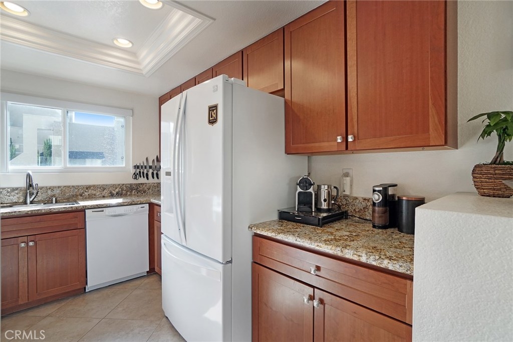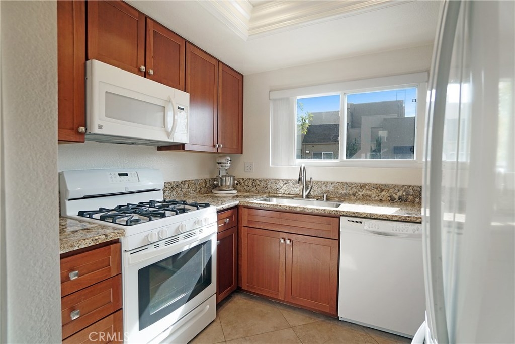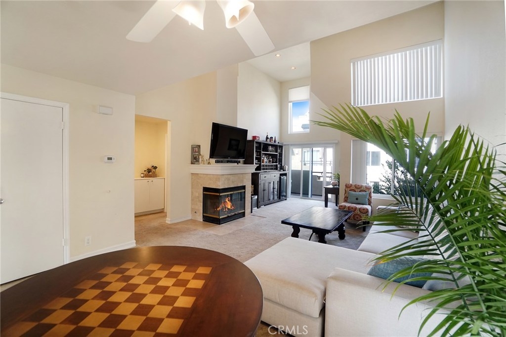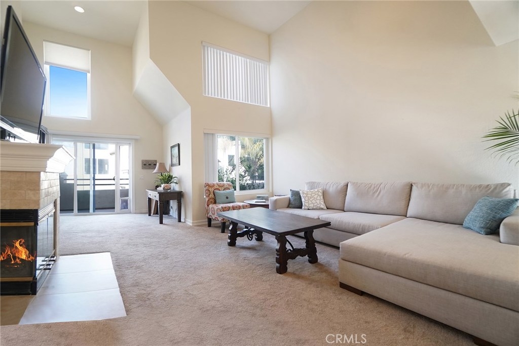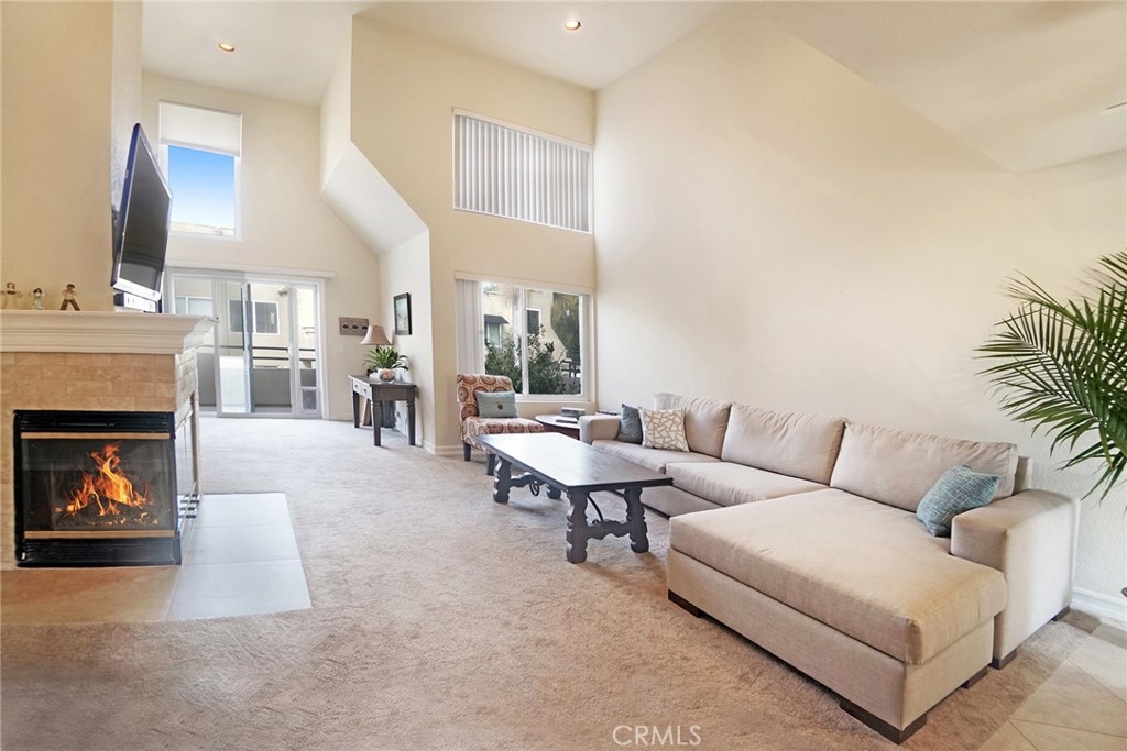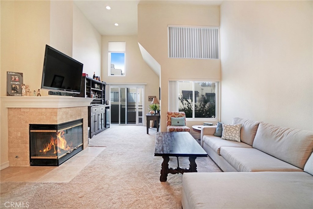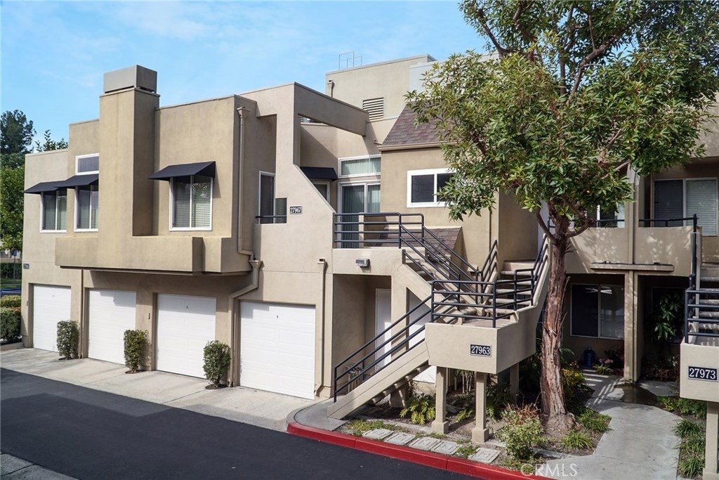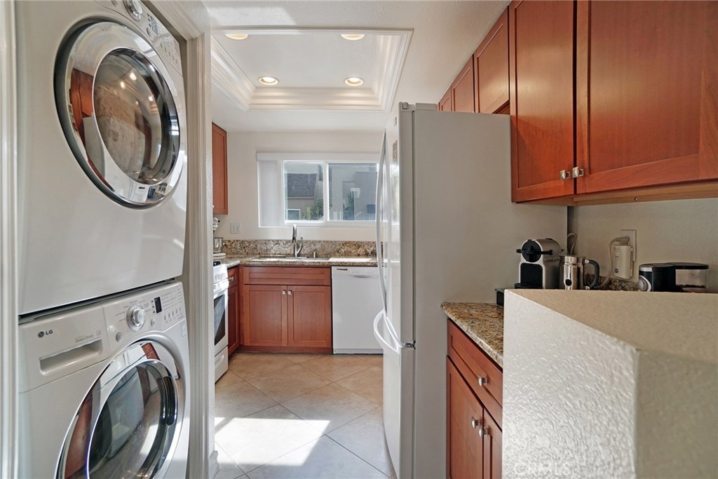 Two story top floor condo unit with huge vaulted ceilings. Front patio and rear balcony. Separate bedrooms and baths. One bed / bath master suite upstairs on the second level. Main floor has separate bedroom and bath, living room / dining room - great room space. Kitchen with included stacked full size washer & dryer, refrigerator, gas stove (one of very few in the complex), kitchen with granite counters, newer wood cabinets and fixtures. Tile floor entry. Gas fireplace in living room. Plenty of living space which feels even larger. One car garage below unit with storage space. Outstanding part of the community near an awesome pool. Other pool and playground area in the complex too. You will love the feel of this home! AND: membership to the Lake Mission Viejo Association: lake privileges include fishing, boating, concerts, picnic grounds, sandy beaches and more.