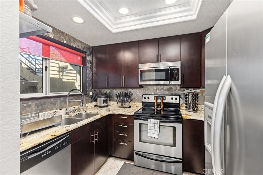 Ground Floor Beautifully Upgraded Condominium. Attached and with direct access large one 1 car garage. Spectacular 2 bedroom home with too many upgrades. To Start, the kitchen has been completely remodeled with custom dark wood cabinets, Granite counter tops, Custom backsplash, and all stainless steel appliances. The bathrooms have Custom dark wood cabinets, Beautiful Faucets, and Travertine counter tops. Private wrap around yard that most units in this community do NOT have. The fact that this ground floor two 2 bedroom condo has a direct access, attached garage and a large private wrap around back yard is a double winner. Unlike any other unit in this community. Fantastic open floor plan with a great room just off the kitchen. Lovely fire place in the living room with new paint. Rainbow Ridge is this community and one of the most sought after with large private parks, heated pools, hot spa. Walk to Lake MISSION VIEJO and enjoy paddle boarding for the day at the lake. Lake Membership included with this condo.