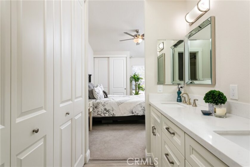 Highly upgraded, end unit 3 bedroom home in a fabulous location within the community. Nice open floor plan boasting a large living room with a cozy gas fireplace, vaulted ceilings and so many upgrades throughout including: newer LVP flooring throughout the downstairs, newer carpet on the staircase and throughout the upstairs, 5.5” baseboards, wood blinds, updated lighting fixtures, ceiling fans in all 3 bedrooms, new closet doors in the primary bedroom, additional garage shelving & artificial turf on the back patio. The spacious & remodeled kitchen features a raised ceiling, all new cabinetry, 42” upper cabinets, designer hardware, Monogram & Cafe appliances including a built-in refrigerator, 36” 5 burner gas cooktop, designer vent hood, Quartz countertops, Blanco silgranite sink, reverse osmosis water system & recessed lighting. All 3 bathrooms have been remodeled as well featuring newer toilets, vanities, reconfigured tile showers, lighting fixtures & flooring. The 3rd bedroom is currently being used as an office, but can be easily changed back. The secluded patio is perfect for a summer BBQ, is covered by an alumawood patio cover, surrounded by a newer vinyl fence & is low maintenance. The remodeled half bathroom downstairs is conveniently located near the entrance of the attached 2 car garage, which has lots of storage and a laundry area. The unit has recently been re-piped as well as painted on the outside. Ridgemont is a quiet community that features a lovely pool area and membership to Lake Mission Viejo.