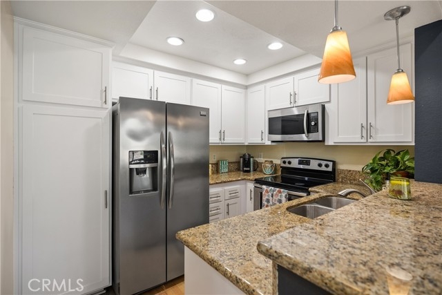 Come and see this beautiful and affordable upper level, end unit condo in Mission Viejo! Nestled in the tree-lined Valencia community, this home boasts its own private stairway and a quaint front porch adorned with an outdoor storage closet. Stepping inside, you immediately notice the open floor plan, vaulted ceilings, beautiful laminate flooring and recessed lighting throughout. Directly to your right is the well-lit main living area with high ceilings, seamlessly connecting the dining nook and kitchen, an entertainer’s delight! The modern kitchen includes granite countertops, stainless steel appliances, white shaker cabinets with stainless steel pulls, a double sink and a breakfast bar accented with contemporary pendant lighting. Adjacent to the main living area is a spacious balcony surrounded by mature trees, providing privacy and peaceful ambiance. Also off the back balcony is your own private washer and dryer enclosure. Opposite the balcony is a hallway leading to the primary bedroom, which also features a vaulted ceiling, recessed lighting and a large, built in cabinets and a spacious closet. Adjacent to the primary suite is the bathroom, which includes granite countertops, white shaker cabinets, a tub shower and dual-flush toilet. Across the hall you will find the secondary bedroom, also with recessed lighting and a large closet. Even more, ownership in Mission Viejo provides you a Lake Mission Viejo Membership, which includes sandy beach swimming, fishing, summer concerts, kayak, small boat and paddleboard rentals, basketball courts and over 80 picnic tables for some summer family BBQ fun and so much more! Come and see this remarkable home!