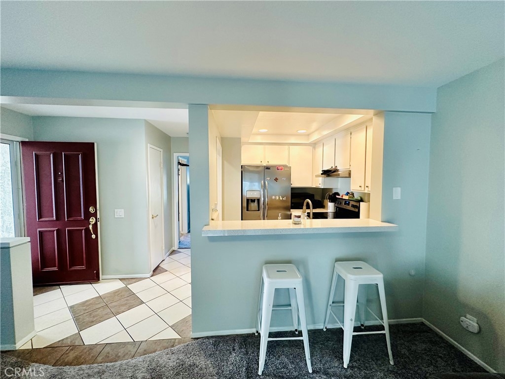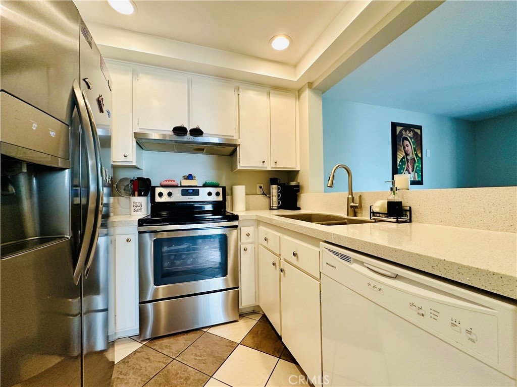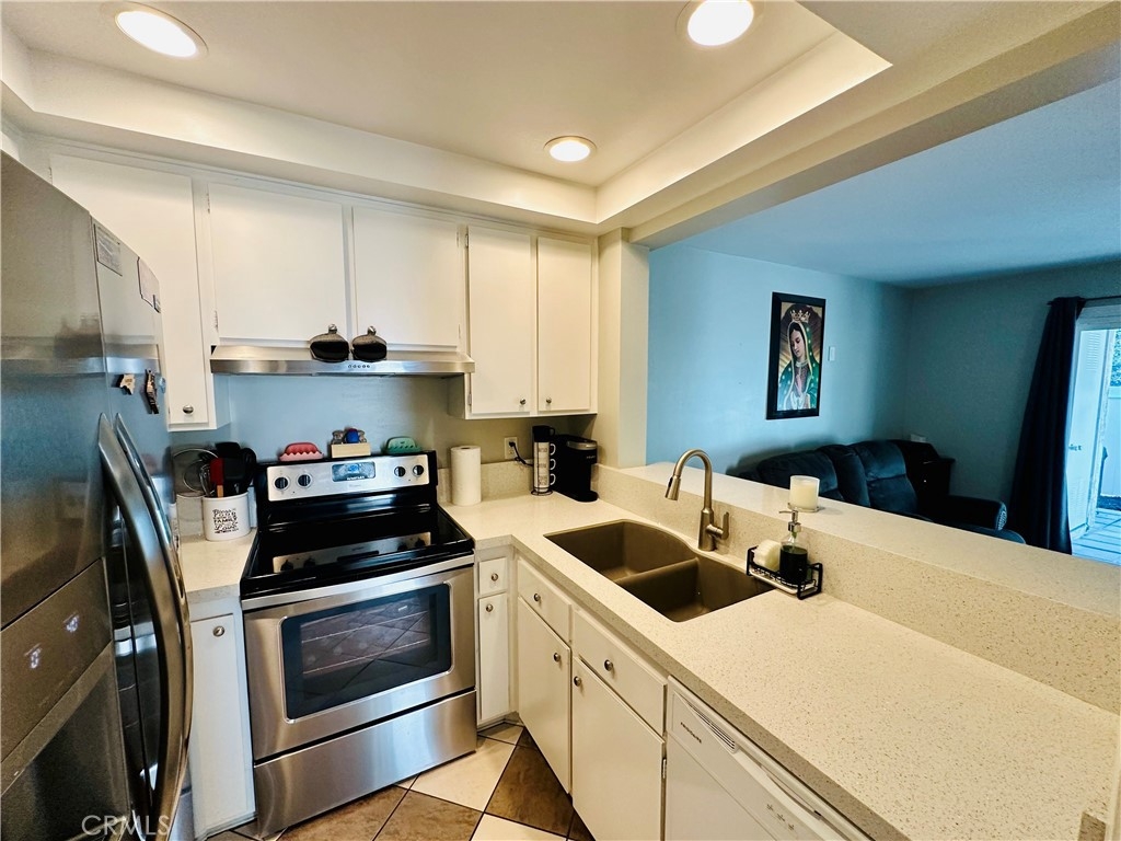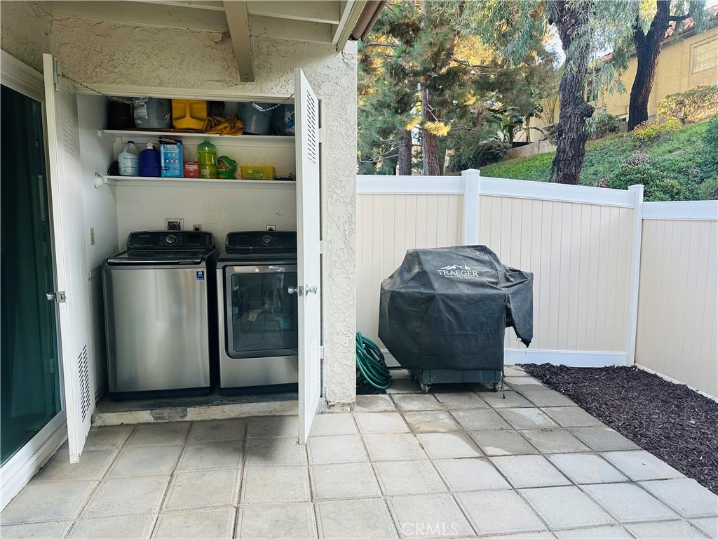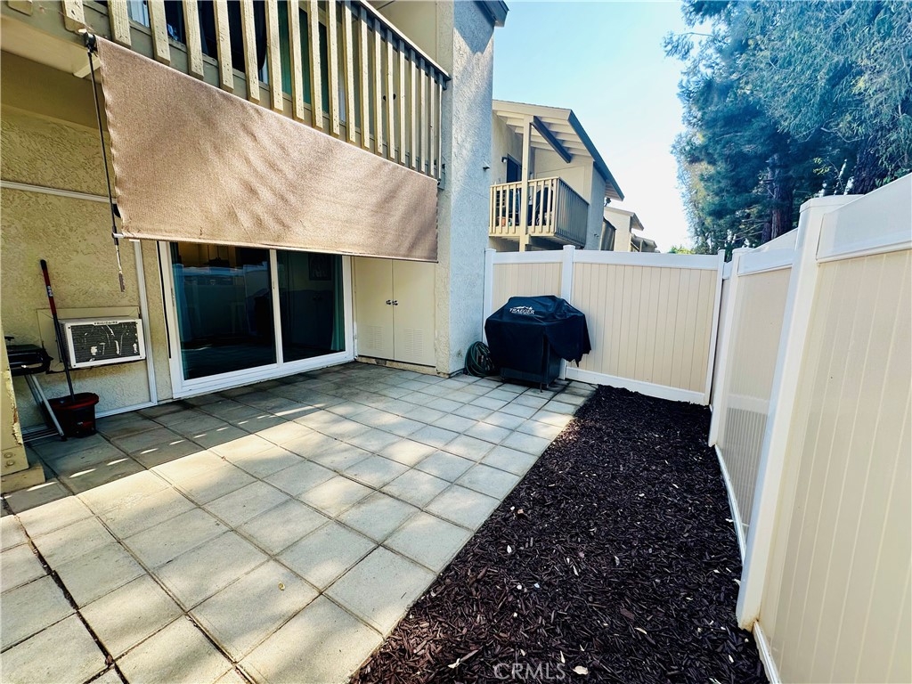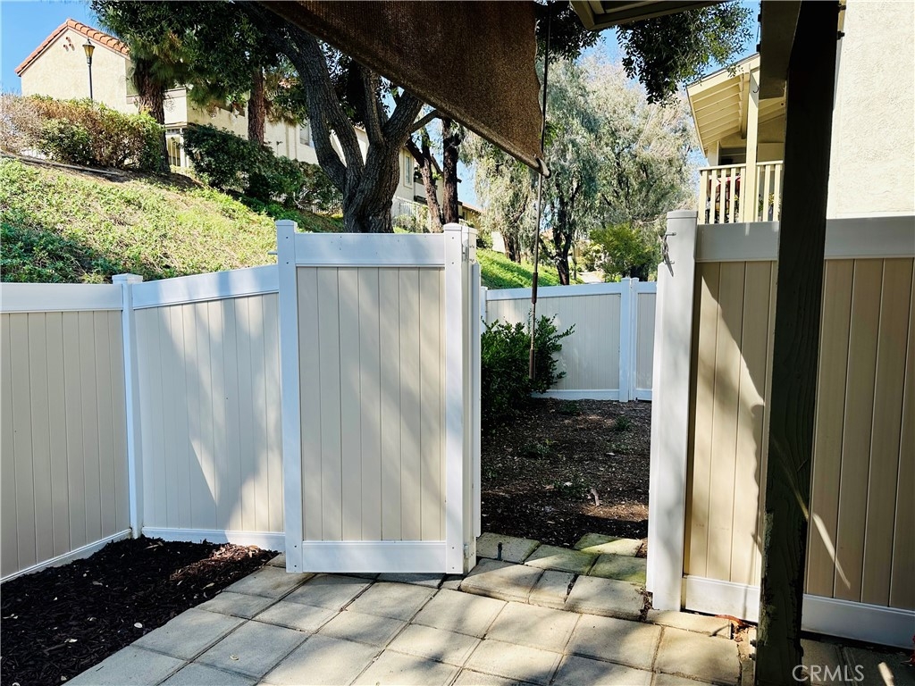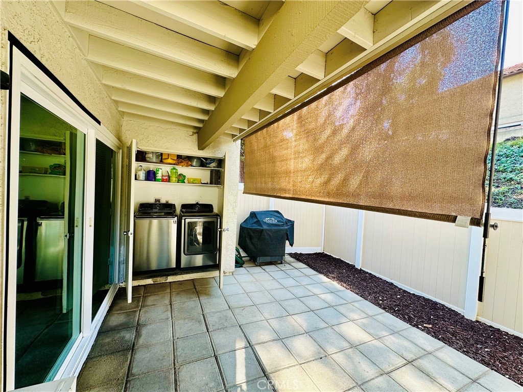 Beautiful Valencia Community condo for sale. Good size one bedroom one bathroom condominium. Ground floor, end unit with a spacious private patio area. No condominium behind the back patio, perfect for reunions with family and friends. Washer and dryer room is in the back patio. Open floor plan that makes the space look bright and cozy with the large sliding door that allows the light flow in nicely from the large patio. Carpet on Living room, ceiling fan. kitchen is open to then living room area, stainless steal appliances, quartz countertops, tile floor and recesses lights. Comfortable roomy bedroom with delightful barn door and ceiling fan. Large walk-in closet. The bathroom is beautiful with upgraded tub slider doors and vinyl floor. The vanity is framed with quartz backsplash and recessed lights. Double pane vinyl windows and sliding door. Location defines Valencia Condominiums. Close to 5 fwy, shopping centers, schools, and entertainment. William S Craycraft Park is walking distance from the condominium. Membership to The Mission Viejo Lake. Enjoy the lake, fishing, small boat/paddle boards rentals, sport courts and picnic areas.