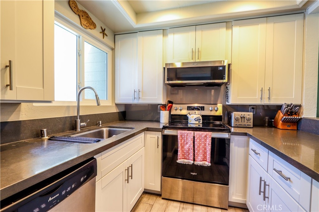 Welcome Home to your darling, upgraded condo with a gorgeous VIEW! The kitchen boasts new custom cabinets, quartz countertops, stainless steel dishwasher, sink, exhaust hood, and new faucet. Cooking is a joy with your range and serving is easy with a pass-through window. The main open-layout area comprises a living room and dining area with scraped, vaulted ceiling and new, modern light fixture. Newer dual pane windows!! Newer slider opens to the balcony with a delightful view of green grass, trees and Craycraft Park, and access to the laundry closet with w/d hookup. The spacious master bedroom features a closet and a large window with a park view. The large secondary bedroom also has a closet and a large window with a view of trees and the parking lot. The stylish bathroom is fashionably upgraded with modern sink/vanity and bathroom fixtures, new lighting, mirror and medicine cabinet, and ceramic tile on the wall over the shower-in-tub. Other upgrades include: a completely repiped condo with new pressure regulator and valves; new water heater; and a newer Energy Star A/C unit. The monthly HOA fees include access to Lake Mission Viejo and all that it has to offer. Minutes away from three freeways and a short, 20-minute drive to the beach. Perfect as a starter home or as an investment. You don't want to miss this one!!