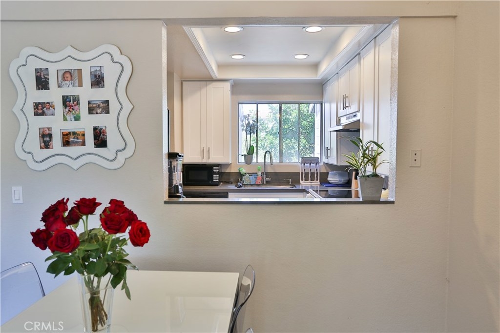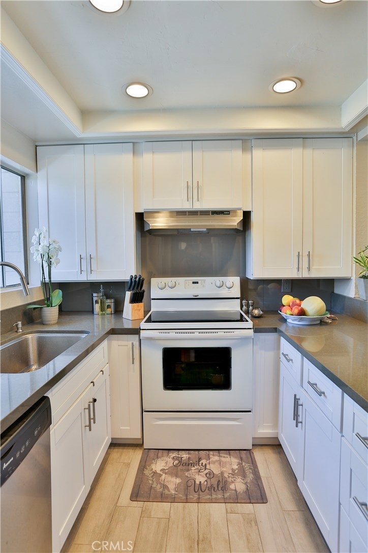 Welcome Home to your darling, upgraded condo in a peaceful neighborhood! Just walk a few steps from your designated parking spot to the staircase that takes you to Home Sweet Home. Enter through the multi-paneled front door and feast your eyes on the gorgeous new porcelain tile flooring. The kitchen boasts new custom cabinets, quartz countertops, stainless steel dishwasher, sink, exhaust hood, and new faucet. Cooking is a joy with your range and serving is easy with a pass-through window. The main open-layout area comprises a living room and dining area with scraped, vaulted ceiling and new, modern light fixture. A slider opens to the balcony with a delightful view of green grass, trees and Craycraft Park, and access to the laundry closet with w/d hookup. The spacious master bedroom features a closet and a large window with a park view. The guest bedroom also has a closet and a large window with a view of trees and the parking lot. The stylish bathroom is fashionably upgraded with modern sink/vanity and bathroom fixtures, new lighting, mirror and medicine cabinet, and ceramic tile on the wall over the shower-in-tub. Other upgrades include: a completely repiped condo with new pressure regulator and valves; new water heater; and a newer Energy Star A/C unit. The monthly HOA fees include access to Lake Mission Viejo and all that it has to offer. Minutes away from three freeways and a short, 20-minute drive to the beach. Perfect as a starter home or as an investment. Hurry!
