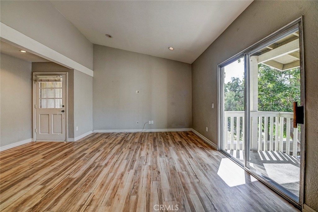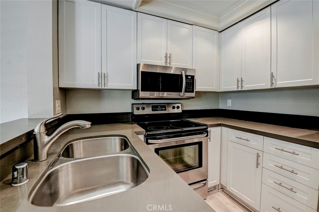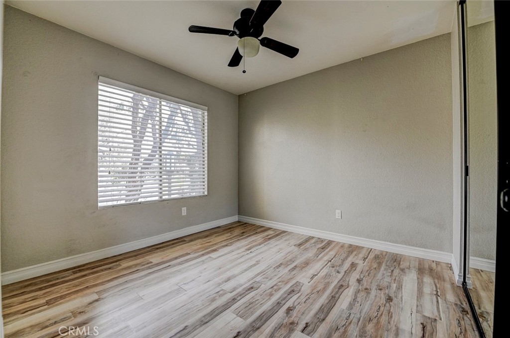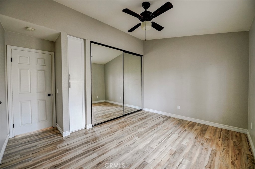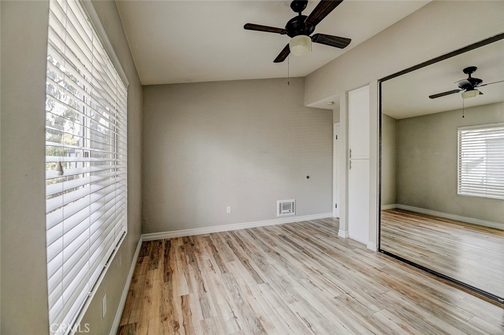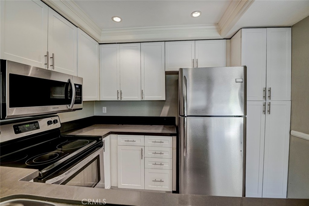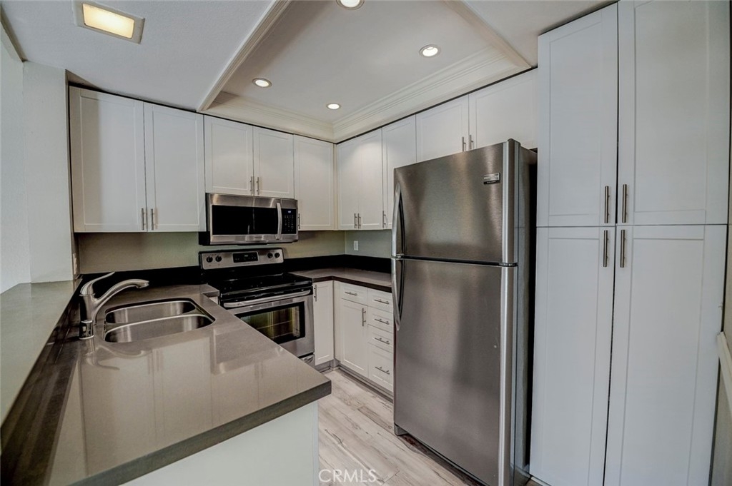 Excellent location in this highly desirable Mission Viejo neighborhood. This modern, upgraded 2+1 condo is ideally located at the upper rear corner and backs right up to the open wash area with a green belt view. Gorgeous mature trees provide a serene backdrop from your balcony. Easily walkable to local restaurants and to the nearby park. Homeownership here also gives you access to Lake Mission Viejo membership just up the road. With that you'll enjoy summer concerts, pontoon, paddle board and small boat rentals. Play at the sandy beach, swim, catch some fish or hang out in the community center. UPGRADES INCLUDE The kitchen has Quartz counter tops, newer microwave, all stainless appliances, upgraded cabinets, recessed lighting and the stainless steel refrigerator is included. The bathroom also has Quartz counter tops, double door for privacy, a tub and shower combo, recessed lights and an updated vanity. Both bedrooms have high ceilings with ceiling fans, new closet doors, upgraded heaters and luxury vinyl plank flooring. The open living space boasts vaulted ceilings, luxury vinyl floors recessed lighting, upgraded molding. The private balcony leads to your laundry area with a newer washer and dryer that are included and is enclosed with weather proof doors. On the front landing area you have a storage closet that also has an upgraded weather proof door and houses the almost new water heater. Additional features are upgraded paint and wood trim, Pex piping and an upgraded AC unit.