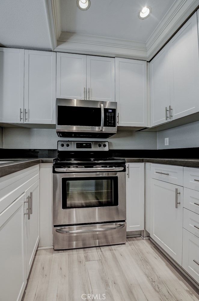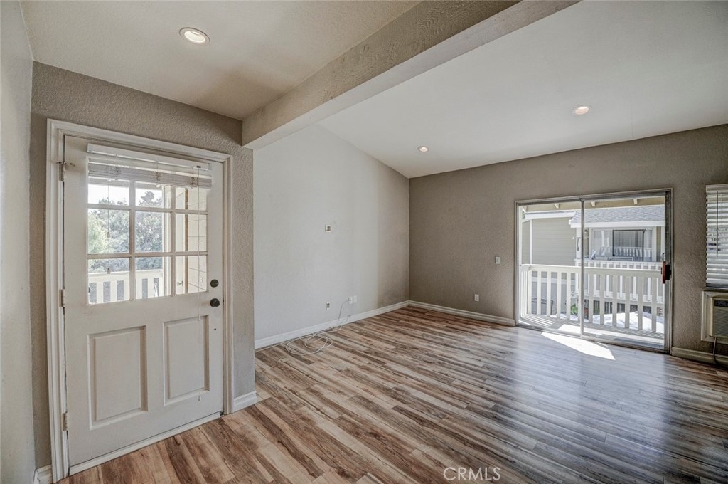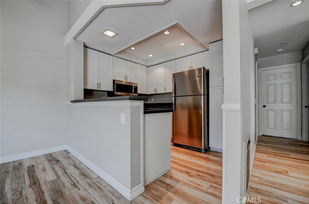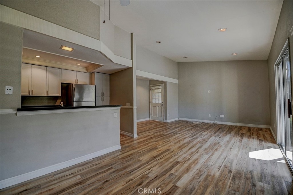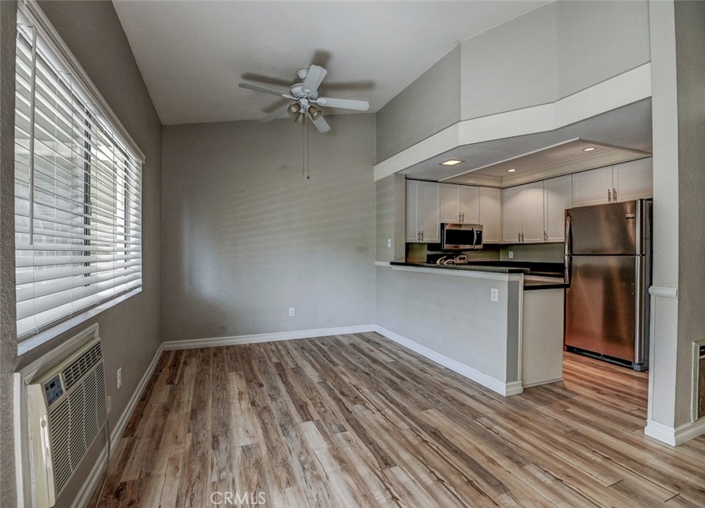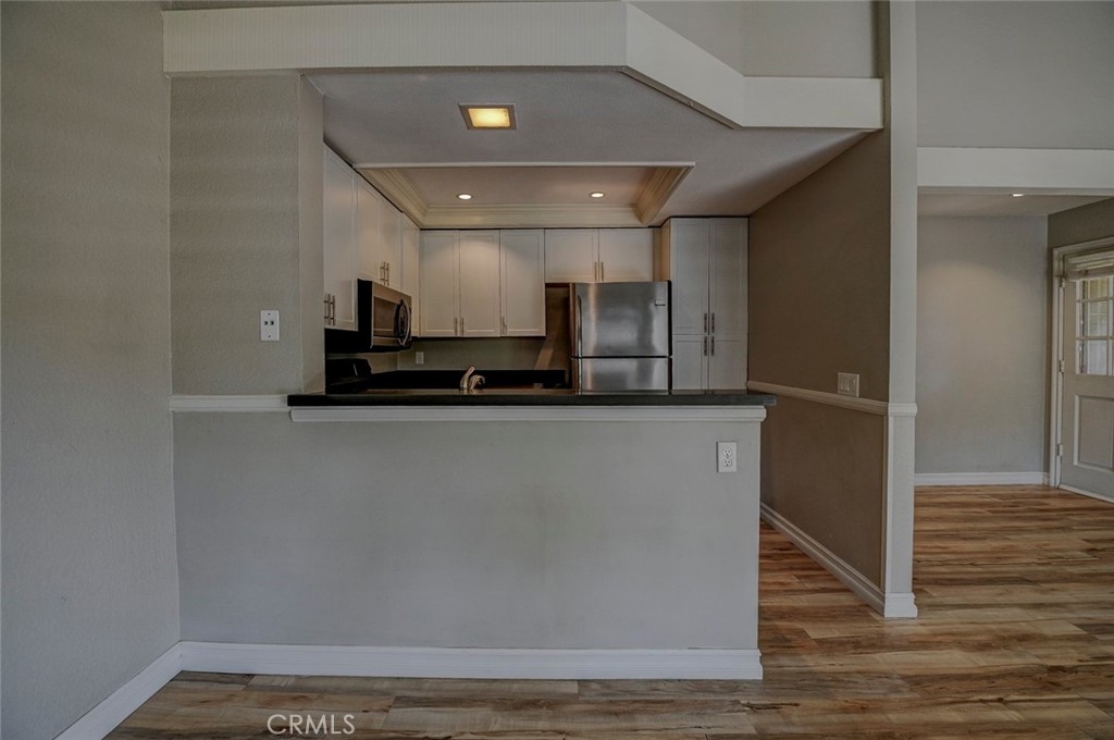Excellent location in this highly desirable Mission Viejo neighborhood. This modern, upgraded 2+1 condo is ideally located at the upper rear corner and backs right up to the open wash area with a green belt view. Gorgeous mature trees provide a serene backdrop from your balcony. Easily walkable to local restaurants and to the nearby park. Homeownership here also gives you access to Lake Mission Viejo membership just up the road. With that you'll enjoy summer concerts, pontoon, paddle board and small boat rentals. Play at the sandy beach, swim, catch some fish or hang out in the community center. UPGRADES INCLUDE The kitchen has Quartz counter tops, newer microwave, all stainless appliances, upgraded cabinets, recessed lighting and the stainless steel refrigerator is included. The bathroom also has Quartz counter tops, double door for privacy, a tub and shower combo, recessed lights and an updated vanity. Both bedrooms have high ceilings with ceiling fans, new closet doors, upgraded heaters and luxury vinyl plank flooring. The open living space boasts vaulted ceilings, luxury vinyl floors recessed lighting, upgraded molding. The private balcony leads to your laundry area with a newer washer and dryer that are included and is enclosed with weather proof doors. On the front landing area you have a storage closet that also has an upgraded weather proof door and houses the almost new water heater. Additional features are upgraded paint and wood trim, Pex piping and an upgraded AC unit.