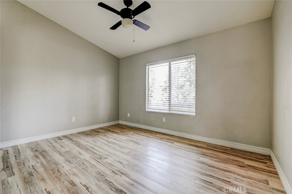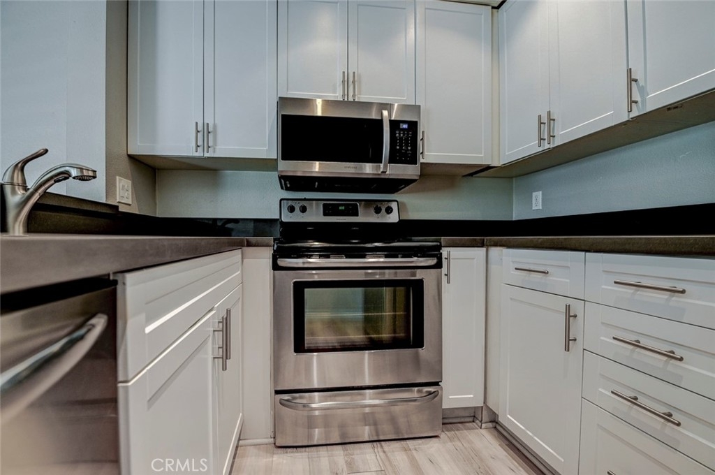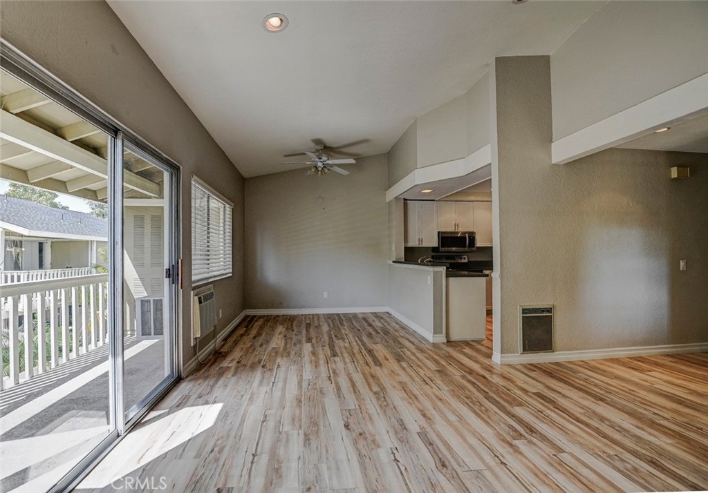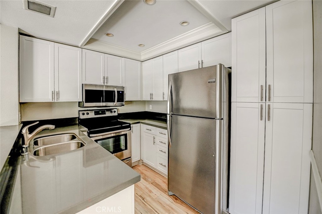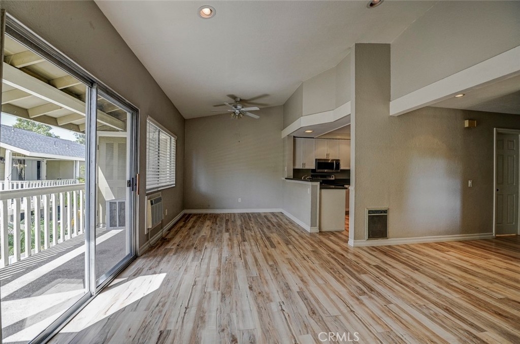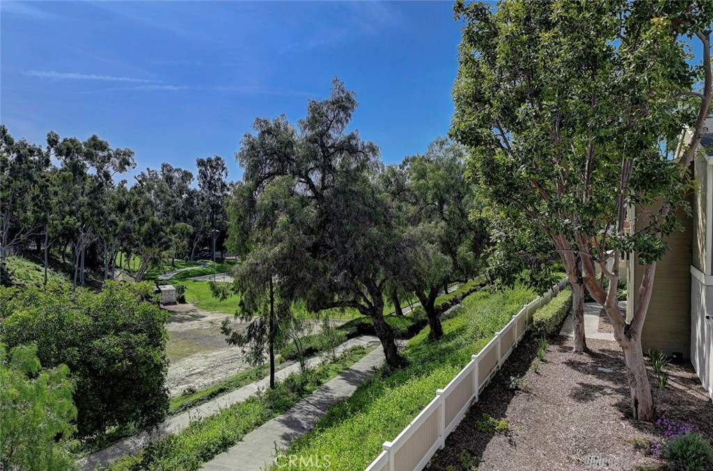 Excellent location in this highly desirable Mission Viejo neighborhood. This modern, upgraded 2+1 condo is ideally located at the upper rear corner and backs right up to the open wash area with a green belt view. Gorgeous mature trees provide a serene backdrop from your balcony. Easily walkable to local restaurants and to the nearby park. Homeownership here also gives you access to Lake Mission Viejo membership just up the road. With that you'll enjoy summer concerts, pontoon, paddle board and small boat rentals. Play at the sandy beach, swim, catch some fish or hang out in the community center. UPGRADES INCLUDE The kitchen has Quartz counter tops, newer microwave, all stainless appliances, upgraded cabinets, recessed lighting and the stainless steel refrigerator is included. The bathroom also has Quartz counter tops, double door for privacy, a tub and shower combo, recessed lights and an updated vanity. Both bedrooms have high ceilings with ceiling fans, new closet doors, upgraded heaters and luxury vinyl plank flooring. The open living space boasts vaulted ceilings, luxury vinyl floors recessed lighting, upgraded molding. The private balcony leads to your laundry area with a newer washer and dryer that are included and is enclosed with weather proof doors. On the front landing area you have a storage closet that also has an upgraded weather proof door and houses the almost new water heater. Additional features are upgraded paint and wood trim, Pex piping and an upgraded AC unit.