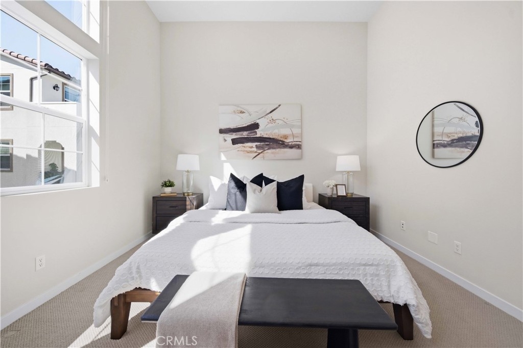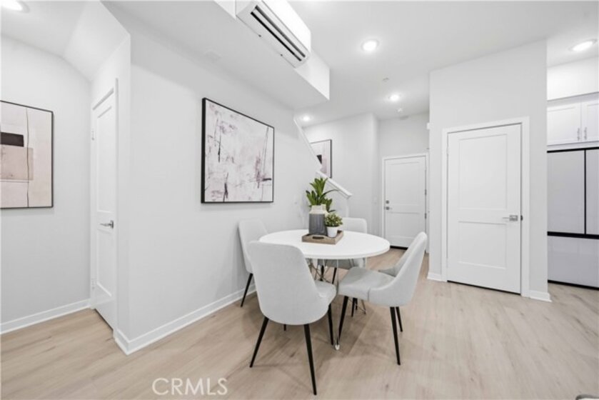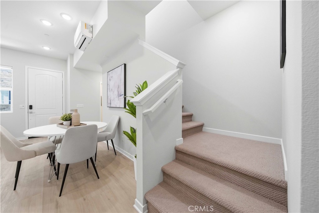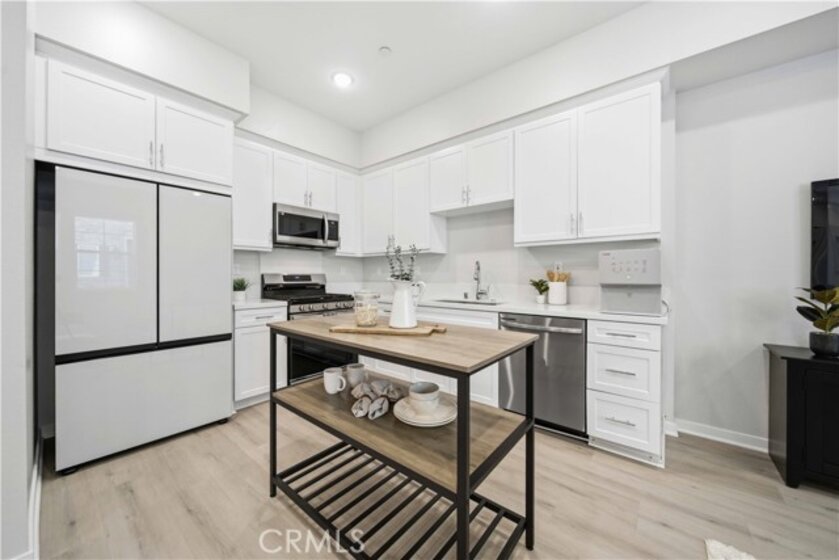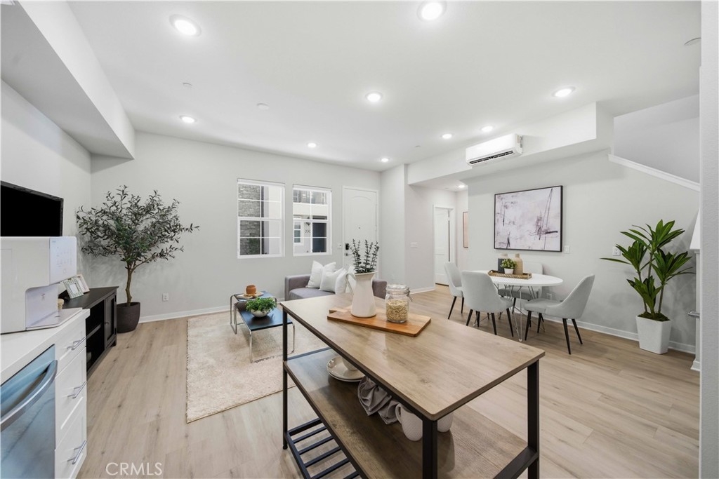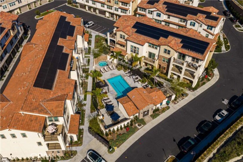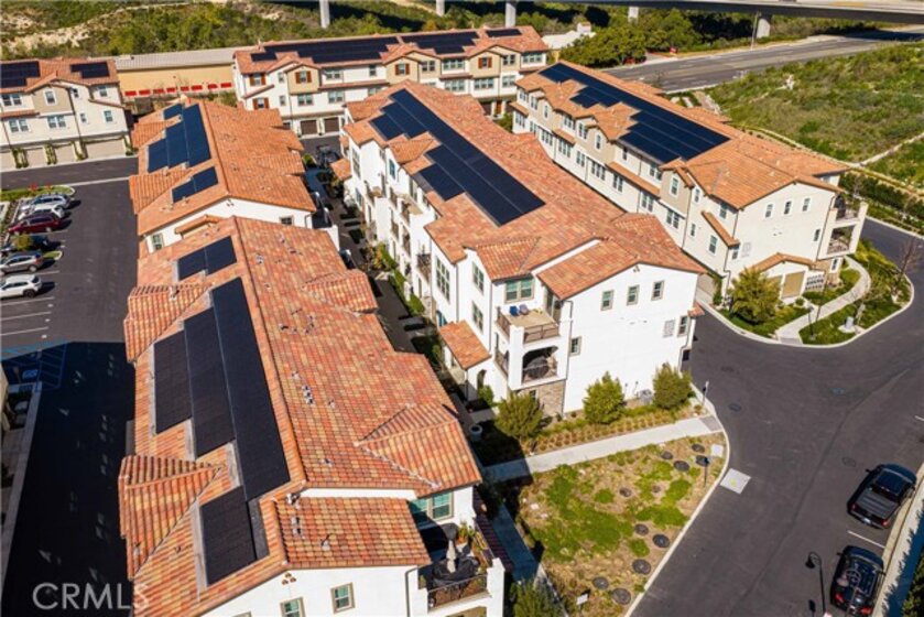 Welcome to 105 Lugo in Mission Viejo, a beautifully maintained, newer construction home built just about two years ago and proudly owned by its original owner. Located in the desirable Saddleback Place community by Trumark Homes, this modern residence offers the perfect blend of contemporary design, energy efficiency, and low-maintenance living. With approximately 887 square feet of thoughtfully designed space, the open-concept floor plan feels bright and spacious, enhanced by oversized dual-pane windows that fill the home with natural light. The main living area features wood-look luxury vinyl flooring, recessed lighting, and custom window treatments, creating a clean, sophisticated look. The kitchen is both stylish and functional, complete with stainless steel appliances, sleek countertops, white cabinetry, and seamless flow into the living and dining areas—ideal for everyday living and entertaining. Upstairs, plush upgraded Berber carpeting lines the staircase, hallway, and primary bedroom, adding warmth and comfort. The spacious primary suite is highlighted by dramatic 13-foot ceilings, creating an airy retreat with an open, light-filled ambiance. Built with today’s efficiency standards in mind, the home includes owned solar panels and a tankless water heater, offering long-term energy savings. An oversized one-car garage plus an additional dedicated parking space provide added convenience. Residents enjoy access to the community pool, spa, and BBQ area, perfect for relaxing or gathering with friends. Conveniently located near the 241 Toll Road, major freeways, shopping, and dining, this home delivers modern comfort in a highly desirable Mission Viejo location. 105 Lugo is a rare opportunity to own a nearly new, original-owner home that has been meticulously cared for from day one.