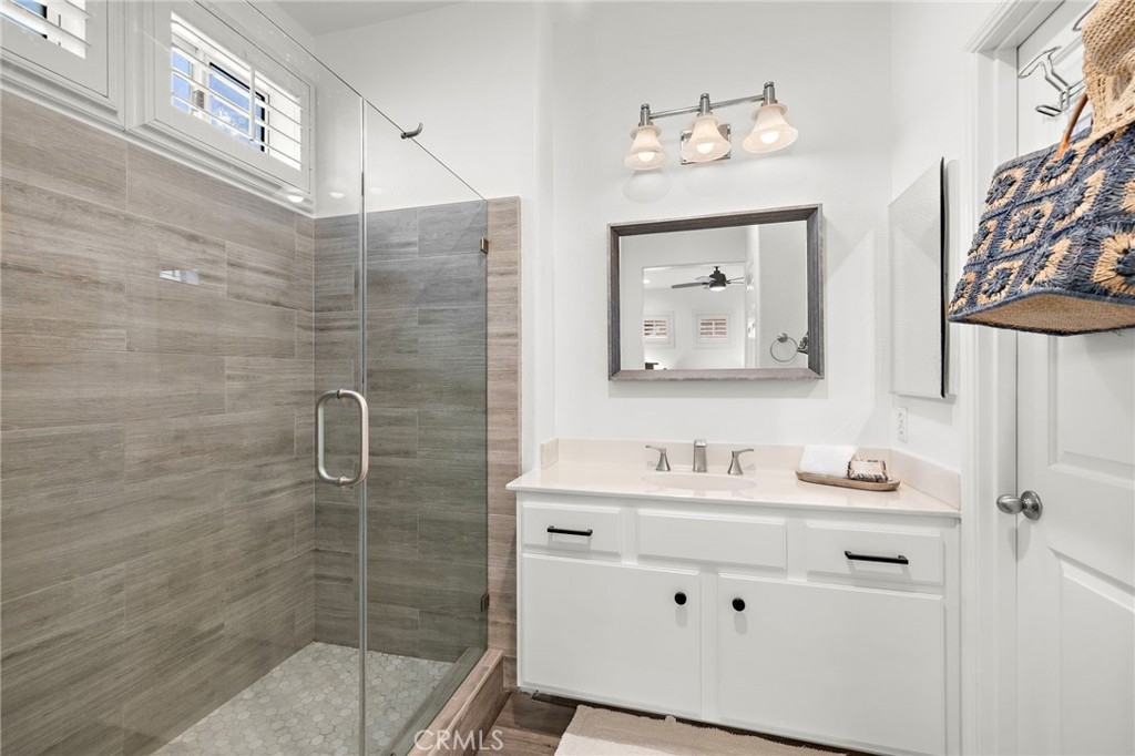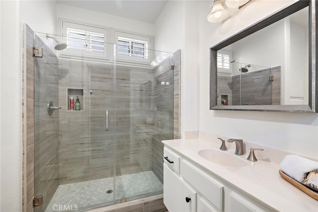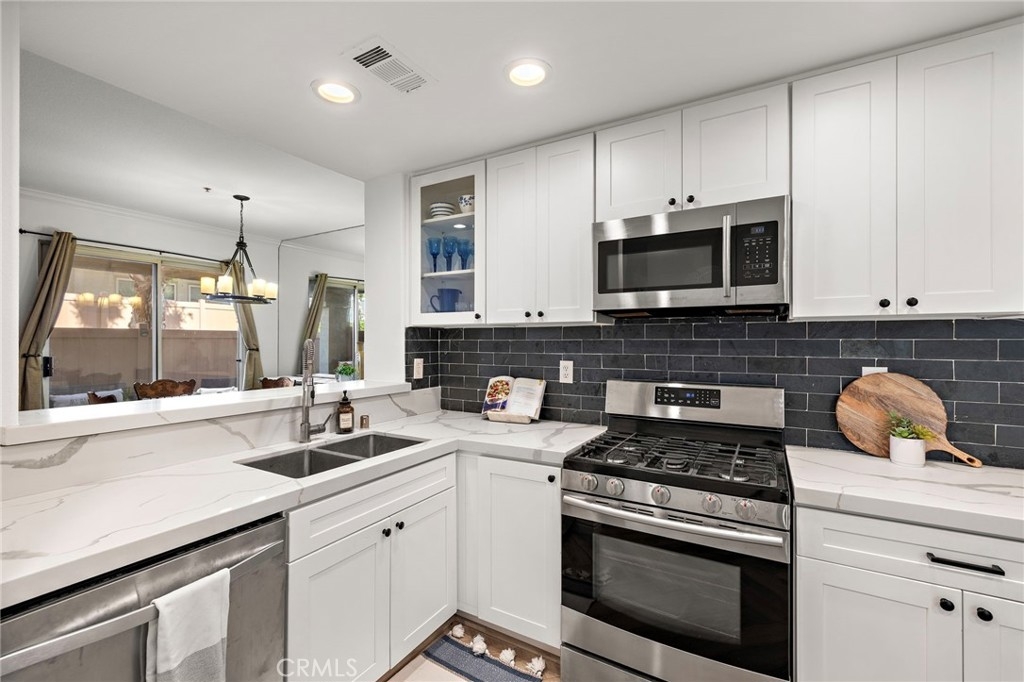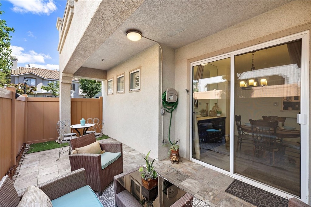 Step into this beautifully upgraded and freshly painted dual primary corner-unit home, nestled in the highly sought-after community of California Court. This charming two-bedroom, two-bathroom single level residence spans 1,365 square feet and offers modern style paired with everyday comfort. As you enter, you'll immediately notice the luxury vinyl flooring and plantation shutters throughout, contributing to the home's inviting ambiance. The kitchen is a true showpiece, boasting a recent renovation with quartz countertops, shaker style cabinets, stainless steel appliances, a chic backsplash, and a dedicated coffee bar. Designed with an open-concept layout, the kitchen effortlessly flows into the light-filled living and dining areas, complete with recessed lighting and a decorative fireplace, creating a warm and welcoming atmosphere. Step outside to your oversized private patio, perfect for entertaining guests or enjoying quiet moments of relaxation. Each bedroom is generously sized with its own private en-suite bathroom. The primary suite features a stunning remodeled bathroom with sleek tile and a walk-in shower, providing a luxurious retreat. The second suite offers ample space for guests or family members, ensuring comfort and privacy for all. Additional features include an attached single car garage with washer and dryer hook ups in unit and plenty of room for storage. Residents of California Court enjoy an array of amenities including a community pool, spa, barbecue area, and the convenience of included parking. Perfectly positioned near shopping, dining, and major freeways, this exceptional home combines modern elegance with a lifestyle of comfort and leisure. Opportunities to own in California Court are rare, don’t miss the chance to make this your sanctuary.