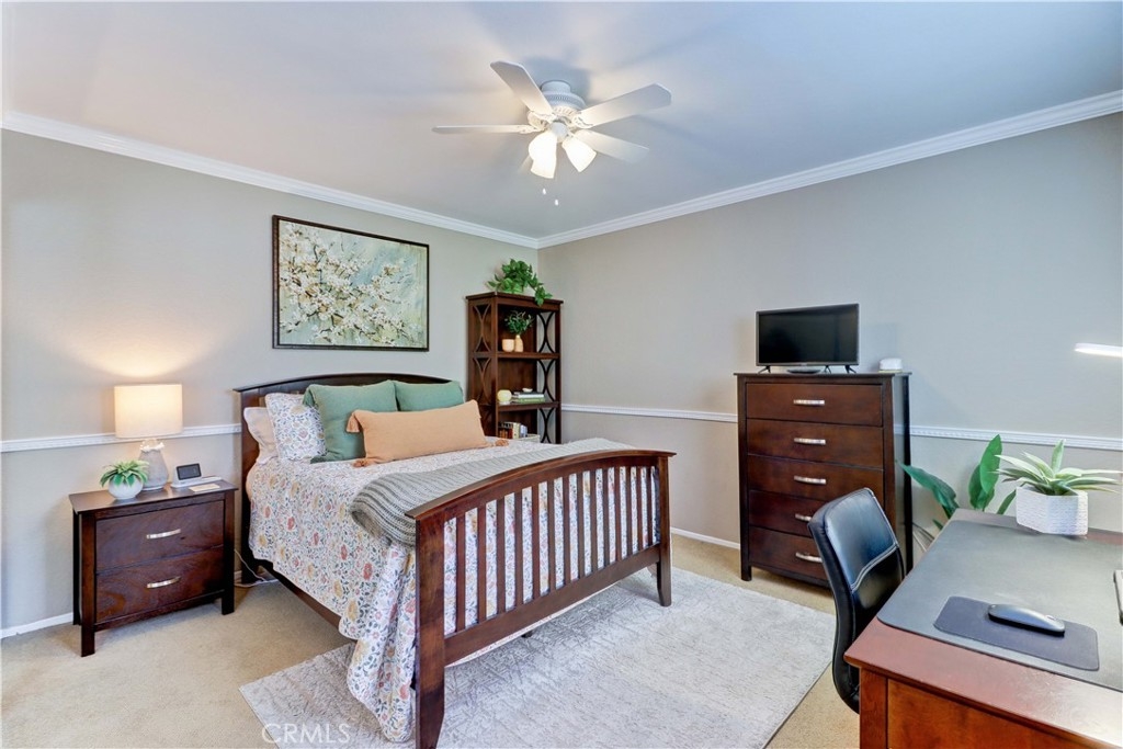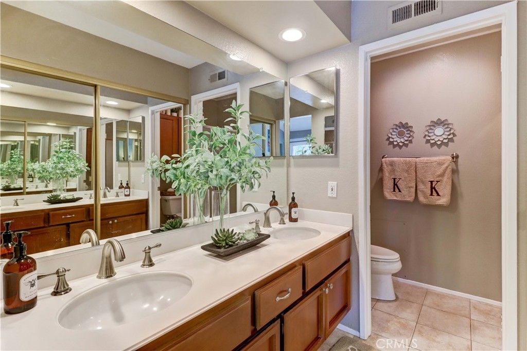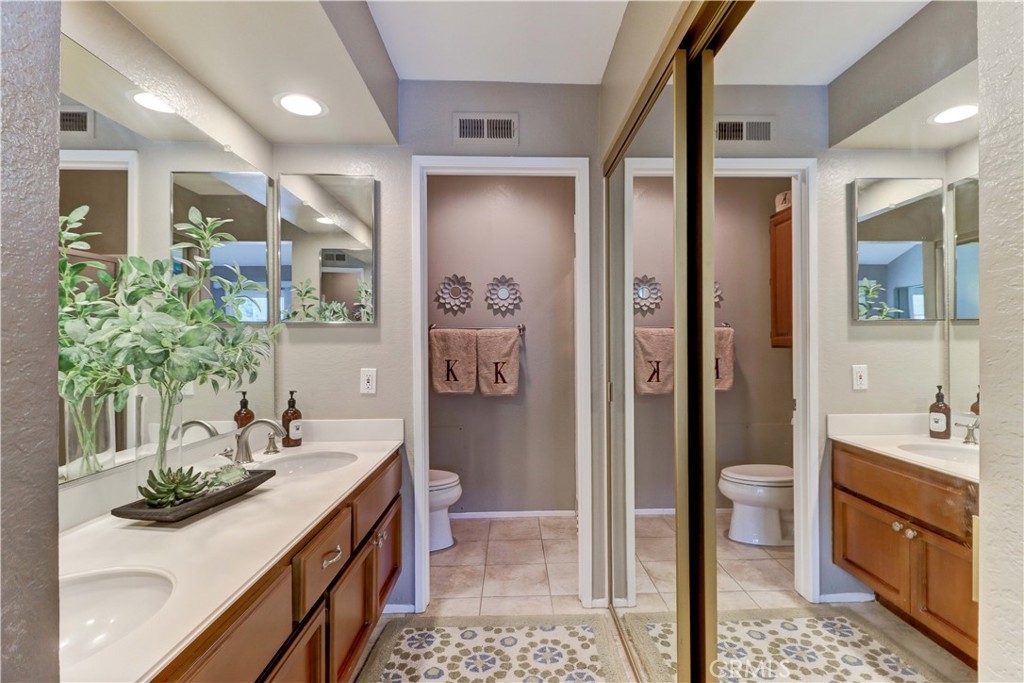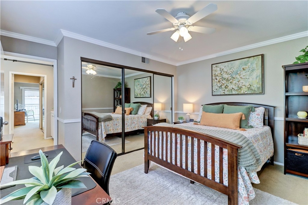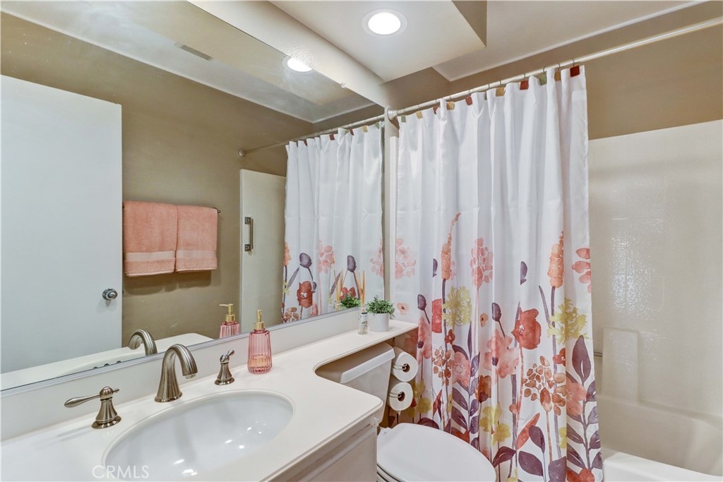 Welcome to the most sought-after floor plan in the community of Coral Gardens - a beautifully upgraded TRUE 3-bedroom, 3-bathroom END UNIT condo with the rare advantage of NOBODY LIVING ABOVE OR BELOW the interior living space. Ideally situated in a QUIET INTERIOR LOCATION away from street noise, this home is surrounded by a lush greenbelt and just a short walk to scenic Lake Mission Viejo. This private end-unit offers THREE DISTINCT OUTDOOR LIVING SPACES: a spacious enclosed front courtyard, a large wraparound back patio and a generous-sized balcony off the primary suite — perfect for enjoying the spectacular 4th of July fireworks from the comfort of home. The back patio has gate access to the surrounding greenbelt area, is partially covered, has a tranquil fountain, and a brand-new patch of turf ideal for kids or pets. This floorplan offers a MAIN FLOOR BEDROOM AND FULL BATHROOM-perfect for guests, multi-generational living, playroom, home office... Each bedroom in the home has exclusive use of a full bathroom. The living room is airy with its vaulted ceilings and large windows offering plenty of space to accommodate formal dining or simply enjoy as a spacious great room. The kitchen features quartz countertops, stainless steel appliances (gas range, refrigerator, and microwave), and a breakfast bar. Upstairs, the spacious primary suite opens up to a large balcony with an attached sunshade. The Primary bathroom has dual sinks, a walk-in shower and spacious closet space. A secondary bedroom and full bathroom complete the upper level. Additional upgrades include NEW WINDOWS AND SLIDERS THROUGHOUT (3 years old), WATER SOFTENER (2 years old), PLANTATION SHUTTERS, NEWER HVAC (2013), recessed lighting, crown molding, tile flooring, custom fireplace doors, and the ENTIRE HOME HAS BEEN REPIPED WITH PEX (2015). The attached 2-Car Garage has an epoxy-coated floor and plenty of storage spaces to keep you organized. Front loading washer and dryer is included, and you will love the custom & functional laundry sink/storage area next to it. The Coral Gardens community is meticulously maintained and offers fantastic amenities, including a sparkling pool, two spas, two tennis courts, and a grassy field perfect for picnics and outdoor recreation. As a homeowner, you'll also enjoy exclusive MEMBERSHIP TO PRIVATE LAKE MISSION VIEJO with access to boating, swimming, 2 clubhouses, picnic areas and a variety of community events, such as the Summer Sunset Concert Series.