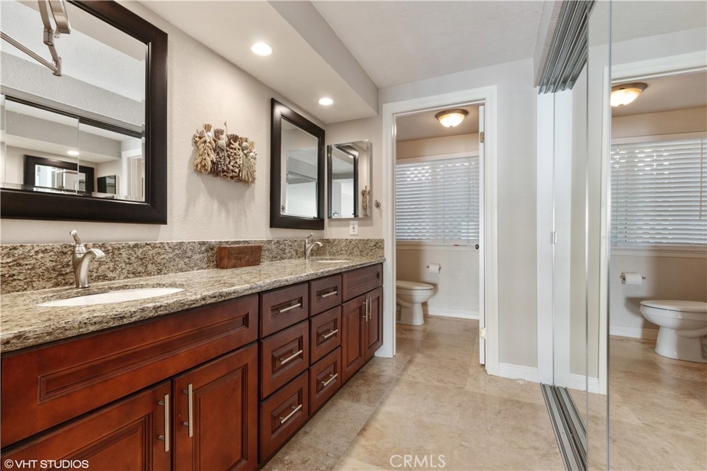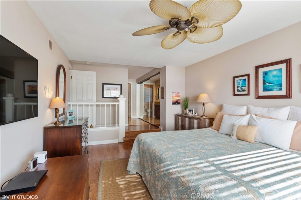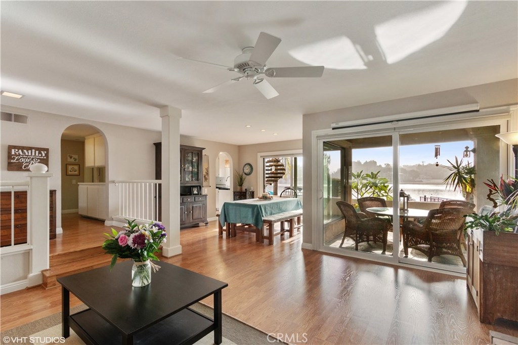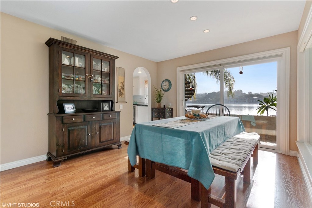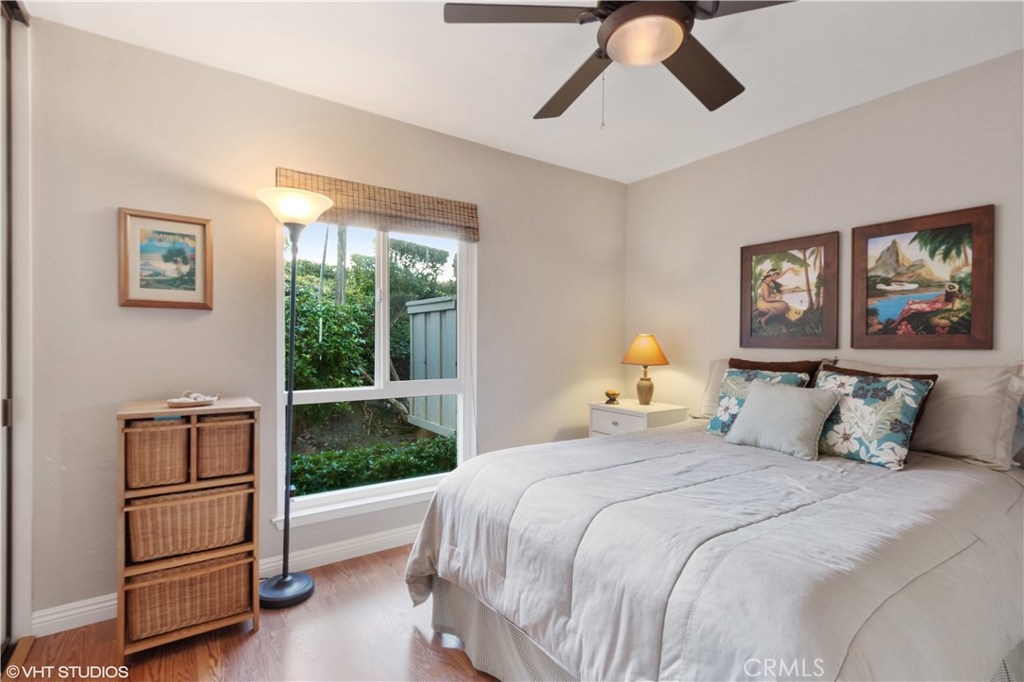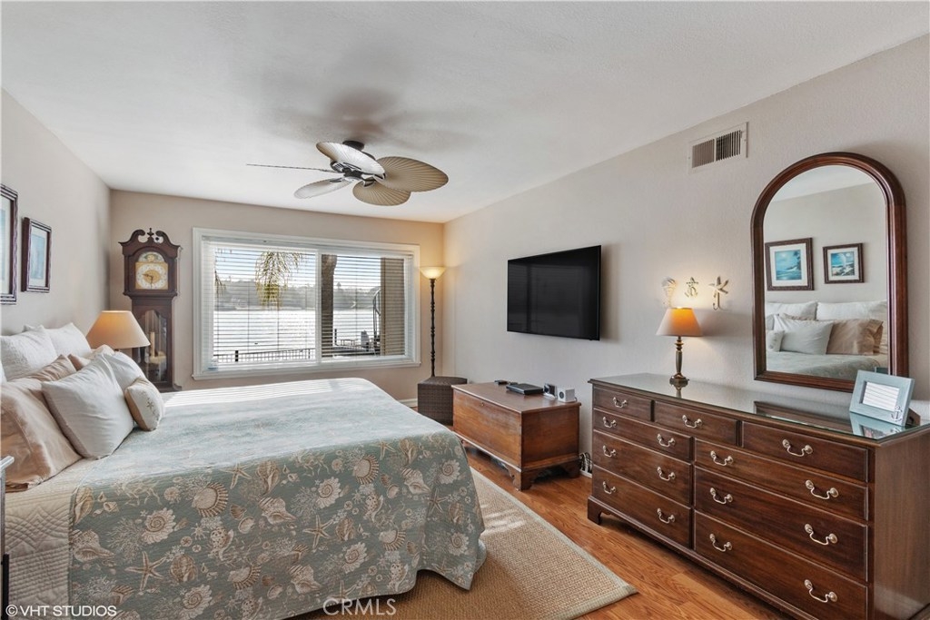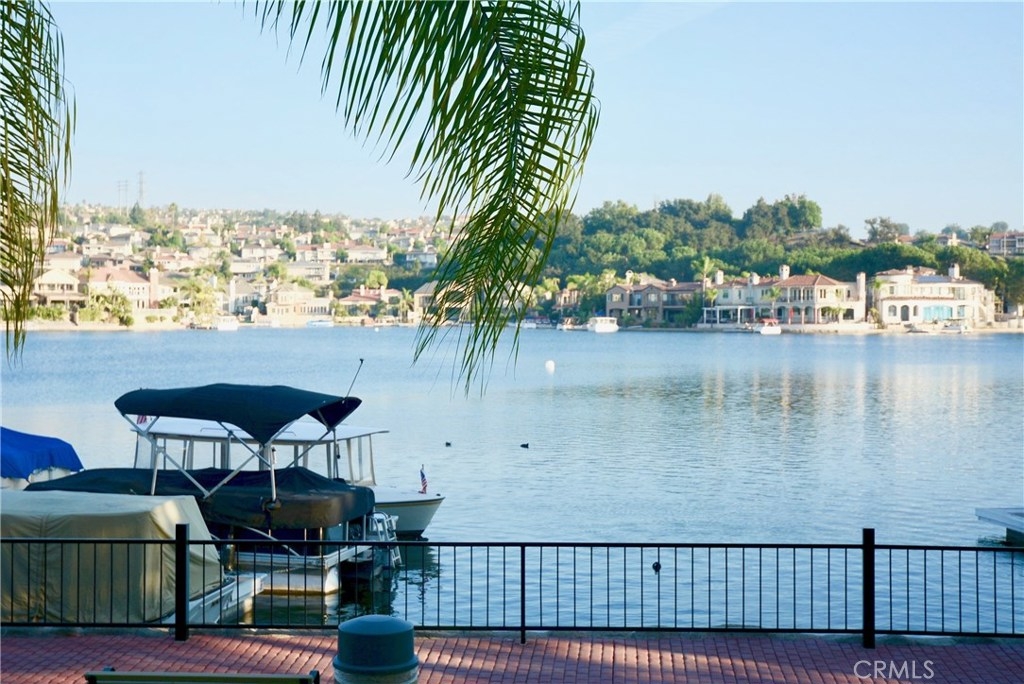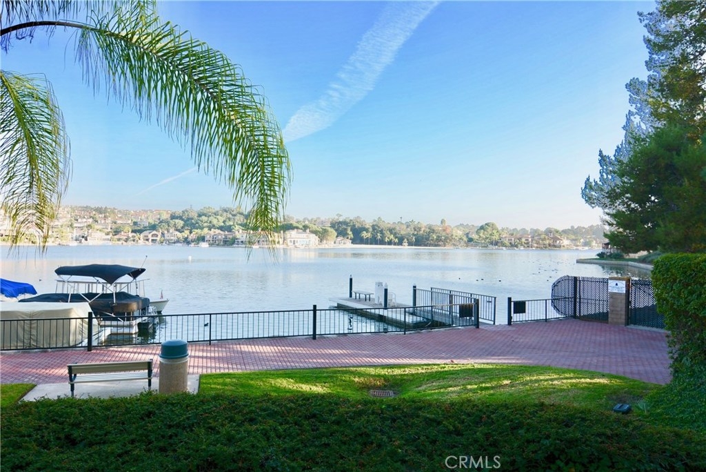 WATER, WATER EVERYWHERE!!! This lake front, garden level Contessa model has the easiest lake access of any unit in the entire Mallorca complex. Located almost directly across from East Beach and the Oak Preserve, this home is angled in such a way as to afford a long, southerly, panoramic view of Lake Mission Viejo. As you explorer the features, you will notice textured ceilings, double thick vinyl windows, vinyl sliding doors, raised panel doors, baseboards, door casings and decor plugs/switches. The flooring in the entry, LR,DR, hallways, kitchen and both bedrooms is a rich, honey oak laminate. The kitchen has granite tile counters, a stainless steel Samsung stove and microwave, tile backsplash, recessed lights and stainless steel dishwasher. The LR and DR have blackout shades over the east facing windows with tasteful, Faux Wood blinds on most of the remaining windows. Travertine tiles adorn the master bath flooring and shower. The master bath has been renovated with newer cabinets, a granite counter, recessed lights and newer faucets. Ceiling fans in the LR and both bedrooms supplement the cool breeze that floats in from the lake. The master bedroom closet has a triple mirrored door system where each door has its own track allowing maximum access to the large closet. You will appreciate the huge picture window in the DR. The spacious and comfortable rear patio with its glass enclosed south side provides a marvelous place to sit back, relax and take it all in.