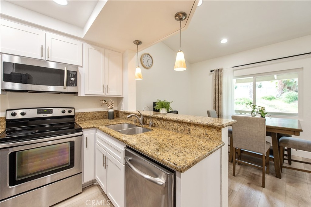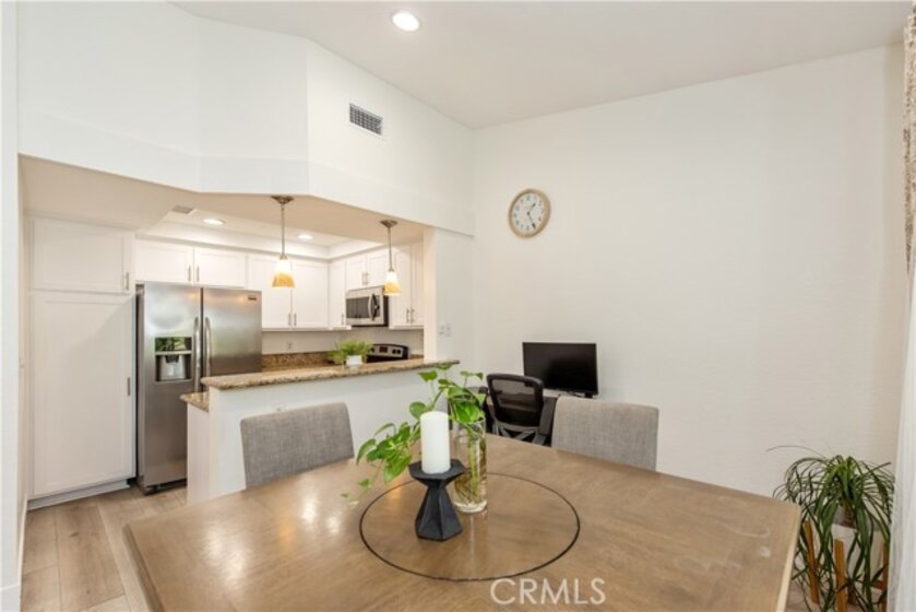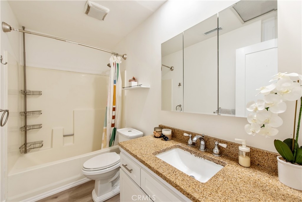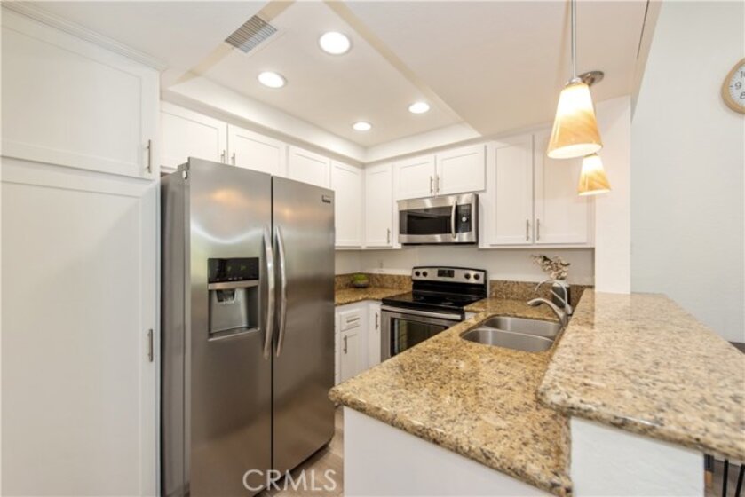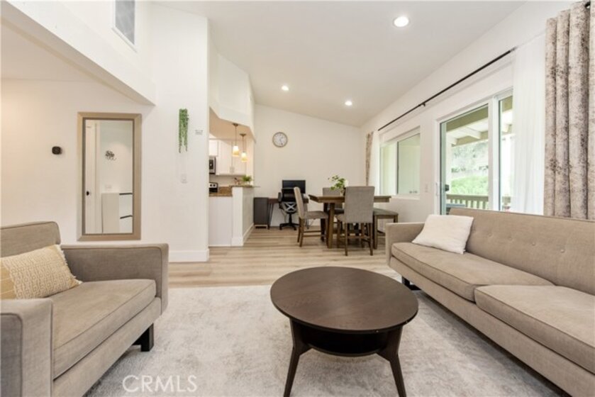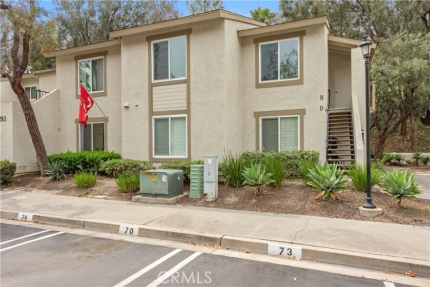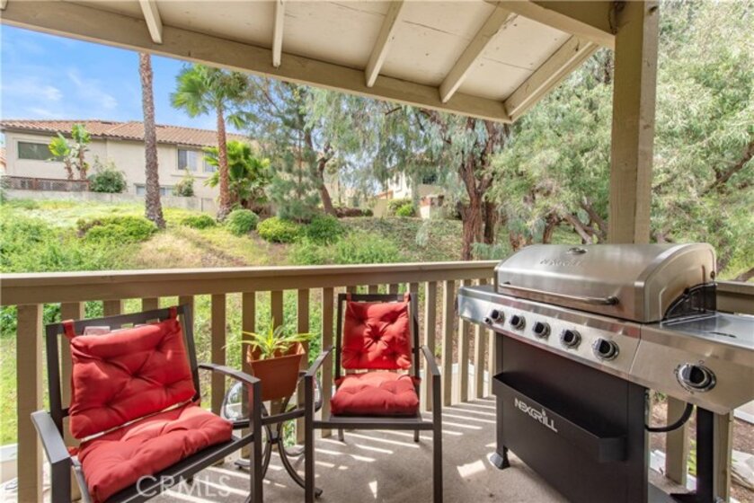 Come see this charming two-bedroom, upper-level end-unit condo nestled in the sought-after Valencia community, offering 812 sq ft of modern living space. Enjoy year-round comfort with a brand-new central air conditioning and heating system—no more unsightly space heaters or coolers. This home has been beautifully updated with new windows in the living room and bedrooms, luxury plank vinyl flooring throughout, new doors and trim, and fresh interior paint. As you enter, you’ll immediately notice the bright and airy feel, enhanced by vaulted ceilings, recessed lighting, and an open-concept floor plan. The kitchen features granite countertops, stainless steel appliances, white shaker cabinets, a double sink, and a breakfast bar accented with contemporary pendant lighting. Step outside to the private balcony off the living and dining areas, where you can relax or BBQ while enjoying peaceful hillside views with mature trees. Additional conveniences include a full-size washer and dryer in a private balcony closet, a designated parking space directly in front of the unit, ample guest parking, and an outdoor storage closet. As a resident, you’ll enjoy exclusive membership to Lake Mission Viejo through the HOA, offering a sandy beach, swimming, boating, kayak and paddleboard rentals, sports courts, picnic areas, summer concerts, and year-round activities. Ideally located with easy access to the 5 Freeway, shopping, dining, and entertainment. Walking distance to Alicia Park and top-rated schools. This thoughtfully updated home offers comfort, style, and an unbeatable location—don’t miss it!