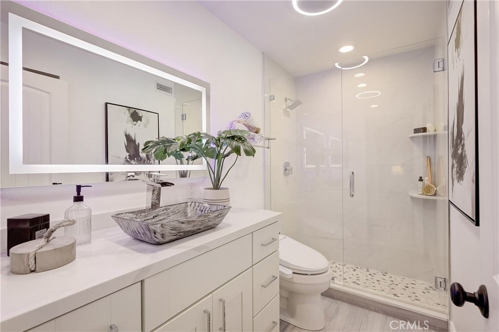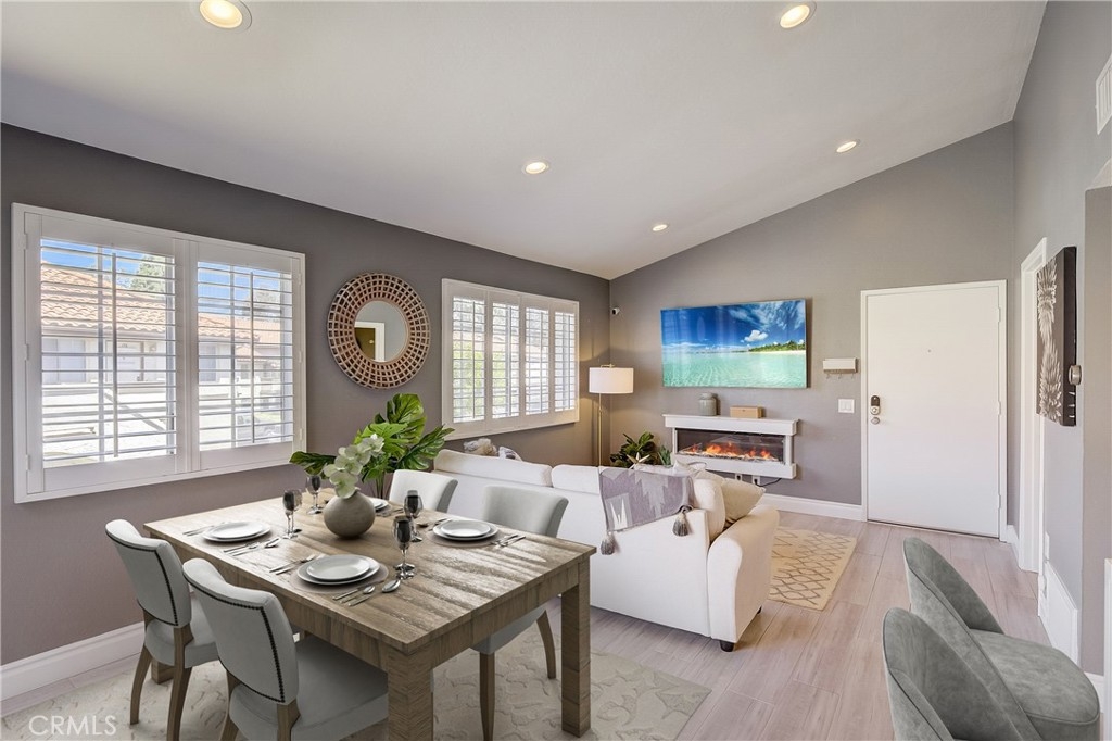 Welcome to this move in a ready upper unit condo located in the sought-after community of Las Palmas in Mission Viejo. Enter your front door into a gorgeous cozy living room with electric fireplace, spacious open floorplan, modern tile flooring, plantation shutters, and recessed lighting. Lots of natural light with a large sliding glass door open to private balcony, perfect for indoor and outdoor entertaining. Upgraded spacious kitchen open to family room with quartz countertops, backsplash, waterfall island, stainless steel appliances, dishwasher, new in-sink garbage disposal and white cabinets. Luxurious master bedroom has mirror closet door, recessed lighting, an ensuite bathroom with gray tile flooring, quartz slab countertop, custom tile walk-in shower, built in speaker, mirror with LED lighting, and bidet toilet. The secondary bedroom with walk in closet, updated modern bathroom with stylish tiling, quartz slab countertop vanity, white cabinets, mirror with LED lighting, and bidet toilet. There are two assigned parking spots. One is covered carport and the other one is uncovered parking spot. Association Amenities Include Pools, Spas, Parks, Lake access, Tennis Court and so Much More! HOA fees include water and trash. Conveniently located near shopping centers, restaurants, schools, and freeways! Don’t miss this great opportunity!