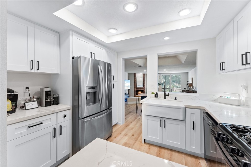 Immerse yourself in peace and tranquility with this amazing home in the sought-after gated community of Finisterra on the Green. Enjoy stunning golf course views and close proximity to Lake Mission Viejo. Step into a cozy open floor plan where the newly renovated kitchen boasts quartz countertops, a farmhouse sink, and a handy built-in microwave. Next to the kitchen, discover a charming breakfast nook and a practical laundry area with full-size machines and extra room for storage. The dining room flows seamlessly into the inviting living room, filled with natural light and mesmerizing views of Oso Creek Golf Course. Gather around the fireplace with loved ones and create lasting memories in this perfect entertainment space. Retreat to the master suite with a spacious walk-in closet, a step-in shower, and access to a private covered patio overlooking a scenic walking path, the enchanting golf course, and mountain vistas. Parking is a breeze with an oversized single-car garage, complete with built-in shelves, a covered carport, and ample guest parking. The community offers exceptional amenities like scenic walking paths, BBQ picnic areas, a heated pool, a hot tub, and even a dedicated driving fairway and community putting green. Enjoy membership to Lake Mission Viejo for access to beaches, swimming, fishing, boating, outdoor movies, concerts, and fireworks displays. Indulge in a round of golf or live music at the recently renovated Terrace on the Green (within walking distance). With its superb location, captivating views, and proximity to shopping, dining, and recreational opportunities, this extraordinary home is not to be missed. Embrace comfortable living with exceptional schools, nearby scenic beaches, convenient freeway access, and an array of amenities just moments away. Make this your forever home and take advantage of the low tax rate and no Mello Roos!