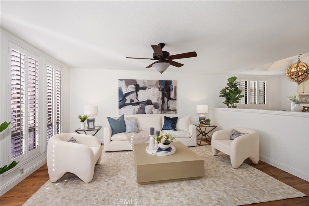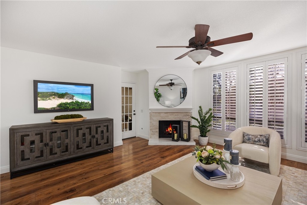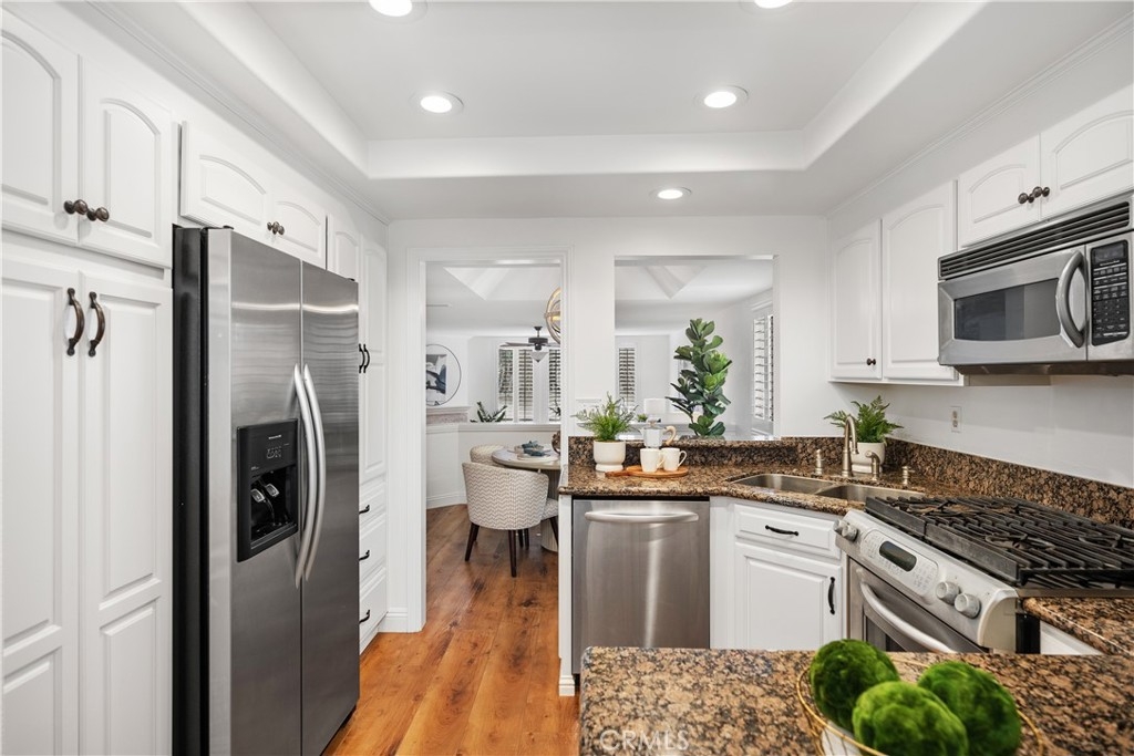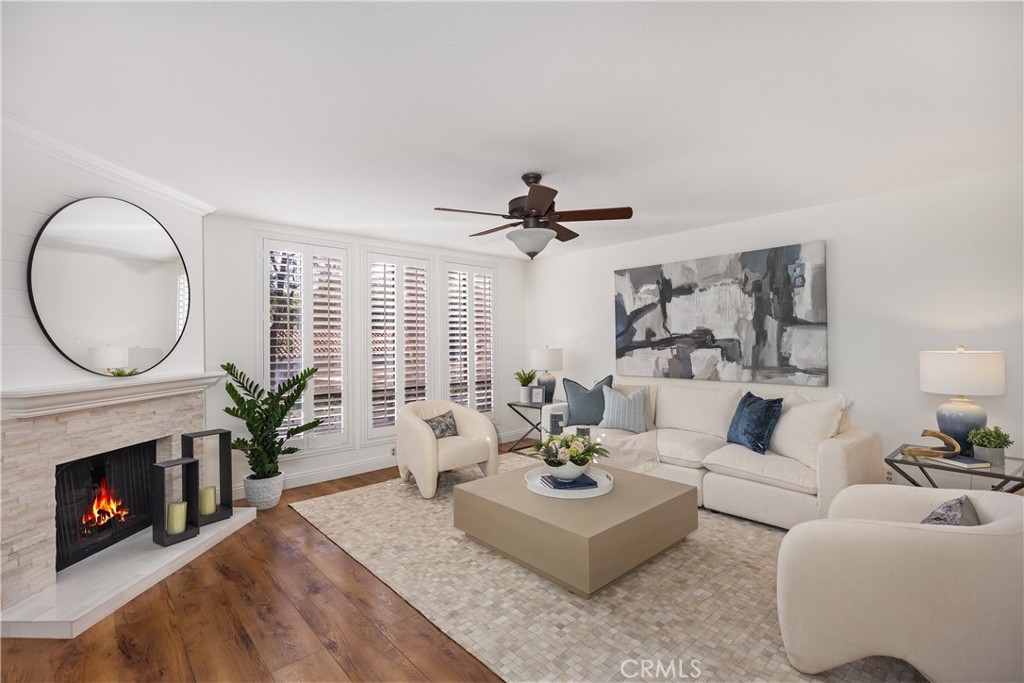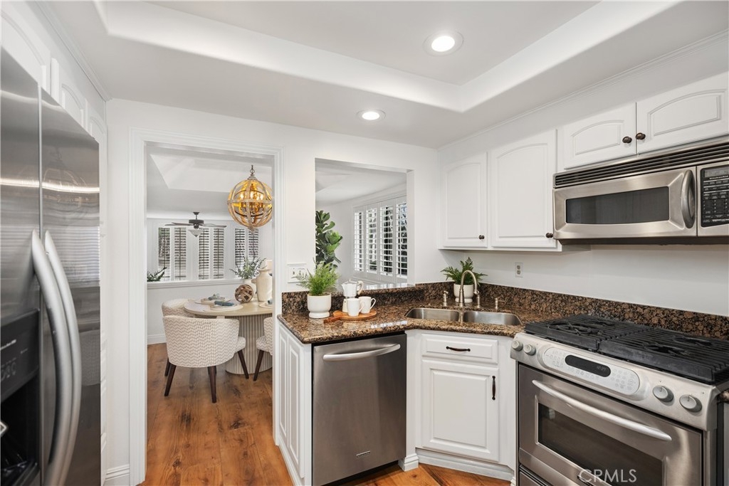 Bright and airy, this beautifully remodeled condominium exudes a clear feeling of openness with each step throughout while boasting a uniquely private location in the very popular, gated community of Finisterra on the Green - Baja that overlooks the prestigious and private Mission Viejo Country Club and golf course. This designer model home has all the fine finishes and fixtures with a modern and clean color palette, freshly painted walls and beautiful laminate type flooring. This is the one you have been looking for! The open and spacious floor plan is laid out all on one level and features a generously sized primary suite, spacious secondary bedroom along with two upgraded bathrooms, huge living room with fireplace, separate formal dining room, remodeled kitchen with breakfast nook and laundry closet. There are too many quality upgrades to list, so come see for yourself! Please note: this property is ground level with no exterior stairs or steps to the entryway (only a couple small steps inside the property to access the huge living room). Excellent central location with close proximity to local shopping centers, the 5 Freeway, grocery stores, parks, schools, Mission Viejo Mall, and Lake Mission Viejo! Enjoy Lake Mission Viejo private membership included with members only access to boating, fishing, sailing, paddle boarding, swimming, private beaches, summertime concerts, movies, holiday festivities & 4th of July firework extravaganza! Enjoy one of the lowest property tax rates in the entire county and no Mello Roos! HOA dues include water and trash utilities.