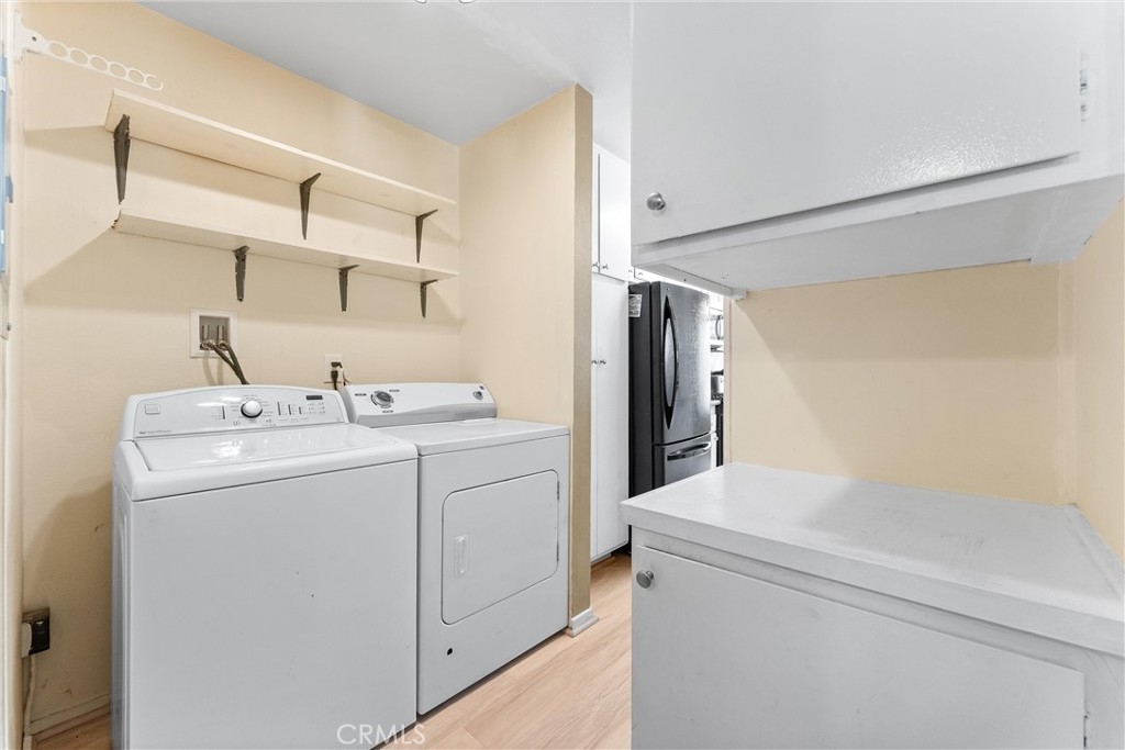 Light, bright, and full of charm, this adorable 2-bedroom, 1-bath condo is tucked into the desirable Aliso Villas community of Mission Viejo. Perfectly positioned as a private upstairs corner unit, you’ll love the peace of having no neighbors above or below. An attached extra-large one-car garage plus an additional parking space adds to the convenience. Step inside to discover a galley kitchen featuring tiled backsplash, granite countertops (with extended counter space), wood laminate flooring, stainless steel sink, gas range, microwave, and dishwasher. The layout is both functional and inviting, with dedicated areas for dining, lounging, and even a full-sized washer/dryer nook with overhead storage and doors. Thoughtful details, such as a hall linen closet and coat closet, add to the home’s everyday ease. The spacious balcony is perfect for relaxing with your morning coffee or hosting weekend BBQs. The primary bedroom features a walk-in closet and a private vanity area that connects to the full bathroom. Outside your door, the beautifully maintained community offers resort-style amenities: sparkling pool, relaxing spa, playground, and lush greenbelts. Mission Viejo’s endless parks, scenic trails, and vibrant city events make it easy to enjoy the quintessential South County lifestyle. Plus, you’ll have the option to join Lake Mission Viejo for even more outdoor fun. Don’t miss the chance to call this stylish and centrally located condo your next home—come experience the Mission Viejo lifestyle today!