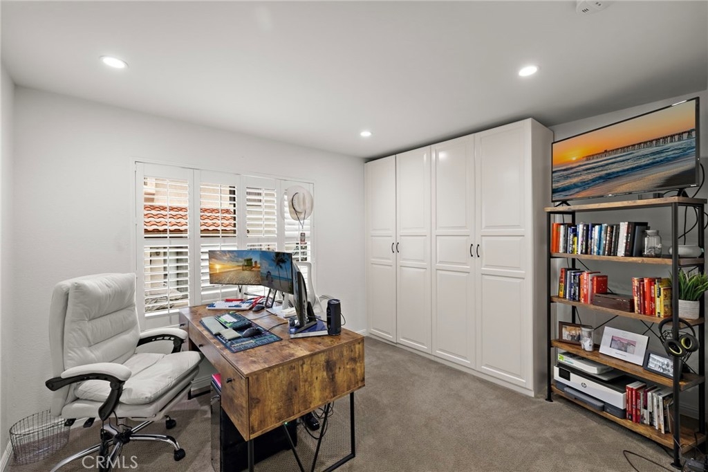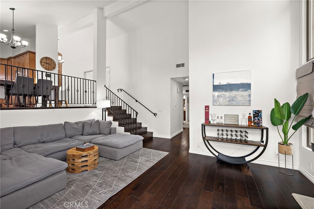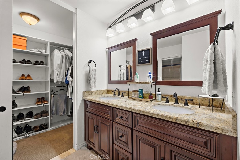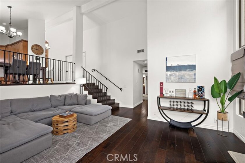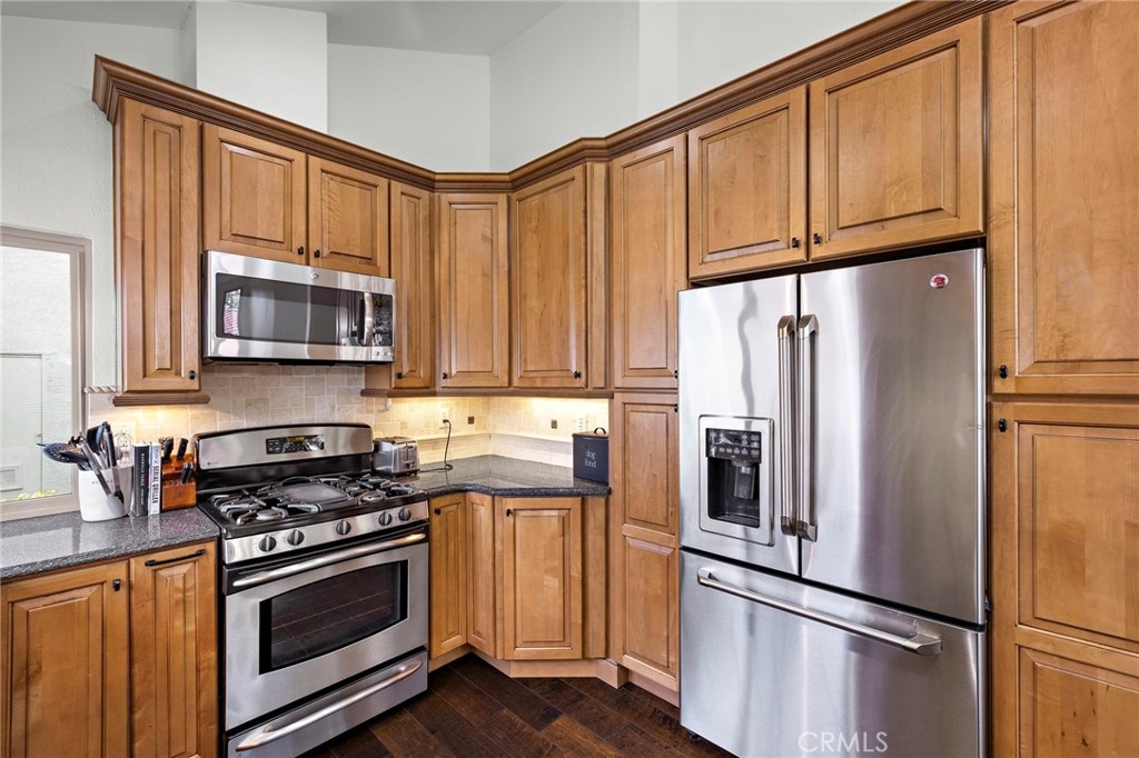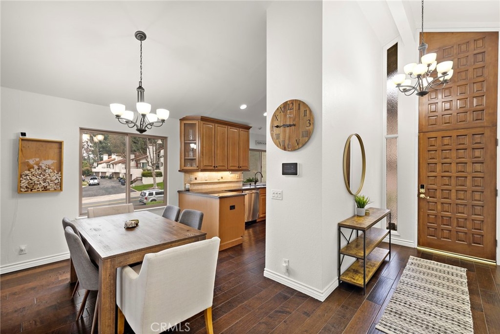 Welcome home to this beautifully updated, turnkey 2-bedroom, 2-bath end-unit condo located in the highly sought-after La Mancha community of Mission Viejo. Light and bright with added privacy, this corner residence features a thoughtful split-level design, abundant natural light, and an exceptional indoor-outdoor living experience. The main entry level welcomes you with an upgraded kitchen and dining area, showcasing granite countertops, travertine tile backsplash, soft-close cabinetry, pantry storage, stainless steel appliances, recessed lighting, and upgraded fixtures. Just a few steps down, the spacious living room offers cathedral ceilings, a cozy fireplace, surround sound wiring, and sliding door access to a private deck overlooking a tranquil greenbelt—perfect for relaxing or entertaining. Dual-pane windows throughout enhance comfort and energy efficiency. Both bedrooms and bathrooms are located on the lower level, creating a private and restful retreat. The primary suite features cathedral ceilings, a custom-built walk-in closet with solid wood doors, a second closet, and an upgraded en-suite bath with dual sinks, granite countertops, and quality fixtures. The second bedroom is thoughtfully designed with armoire style closet space — ideal for guests or a home office. Additional upgrades include hardwood flooring in the kitchen and living area, solid wood interior doors, a whole-house fan. A rare attached 2-car garage offers direct access and is currently set up as a home gym, providing flexibility for fitness, storage, or hobbies. The La Mancha community is adjacent to the private Mission Viejo Country Club and residents enjoy HOA privileges to Lake Mission Viejo, including beaches, boating, concerts, and year-round recreation. Stylish, move-in ready, and ideally located—this home offers the very best of Southern California condo living.