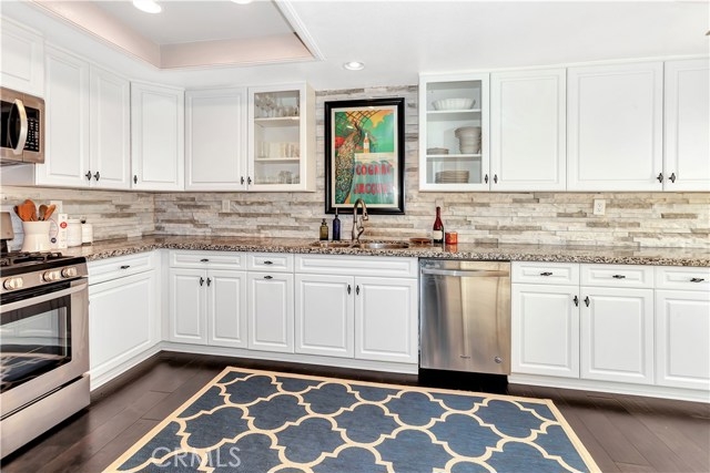 Welcome to the prestigious gated community of Alta Finisterra on the Green! This beautiful two-story Belaire Atrium floorplan shows like a model! The stunning custom interior designs make this home something you won’t want to miss! As you enter into your lovely new home you are greeted with gorgeous natural Birchwood flooring that runs throughout and gives the home a warm welcoming feeling. The main living area is so grand with 20’ ceilings yet so inviting with the elegant stacked stone fireplace. This home also offers an additional retreat off the main living area that could be used as an office, nursery, workout room or possibly 4th bedroom (just no closet). The kitchen has been completely remodeled with granite countertops, ceiling-high shaker style soft close cabinets and drawers, custom stacked stone backsplash, stainless steel appliances and large double basin sink. The private courtyard next to the kitchen is perfect for enjoying some beautiful California sunshine! Next to the kitchen is the formal dining area accented with an elegant Pottery Barn hanging light fixture. The master bedroom has soaring 20’ ceilings with decorative lighted ceiling fan, large walk-in closet and sliding door to the front patio. Two-car attached garage with plenty of shelving and space for storage. HOA includes a heated pool, spa, walking trails. Also enjoy full use of Lake Mission Viejo's 2 beaches, boating/fishing, clubhouse, concerts and special events! Low taxes.